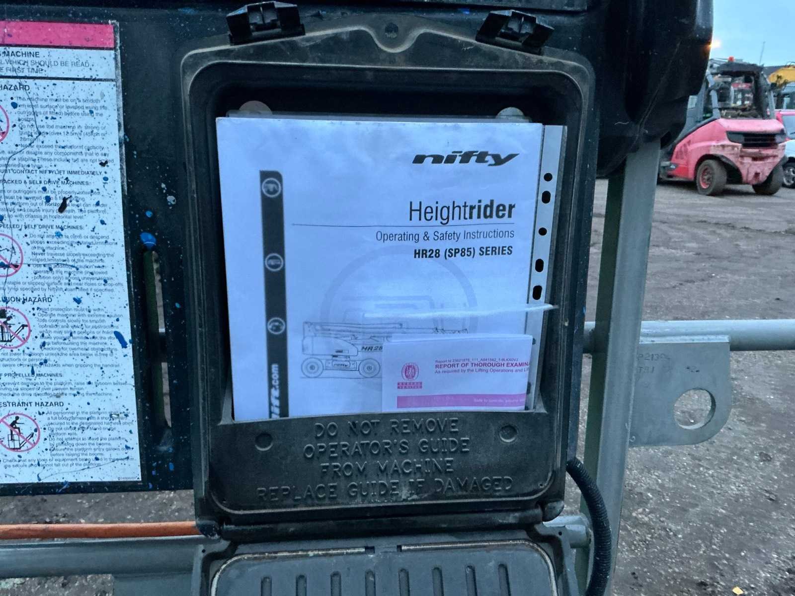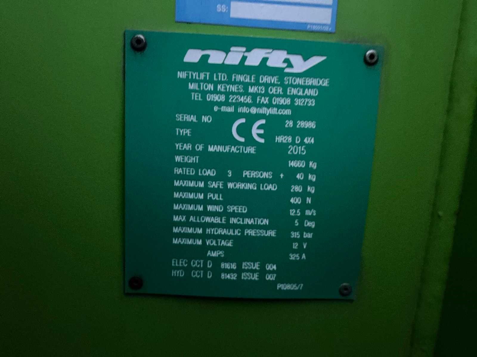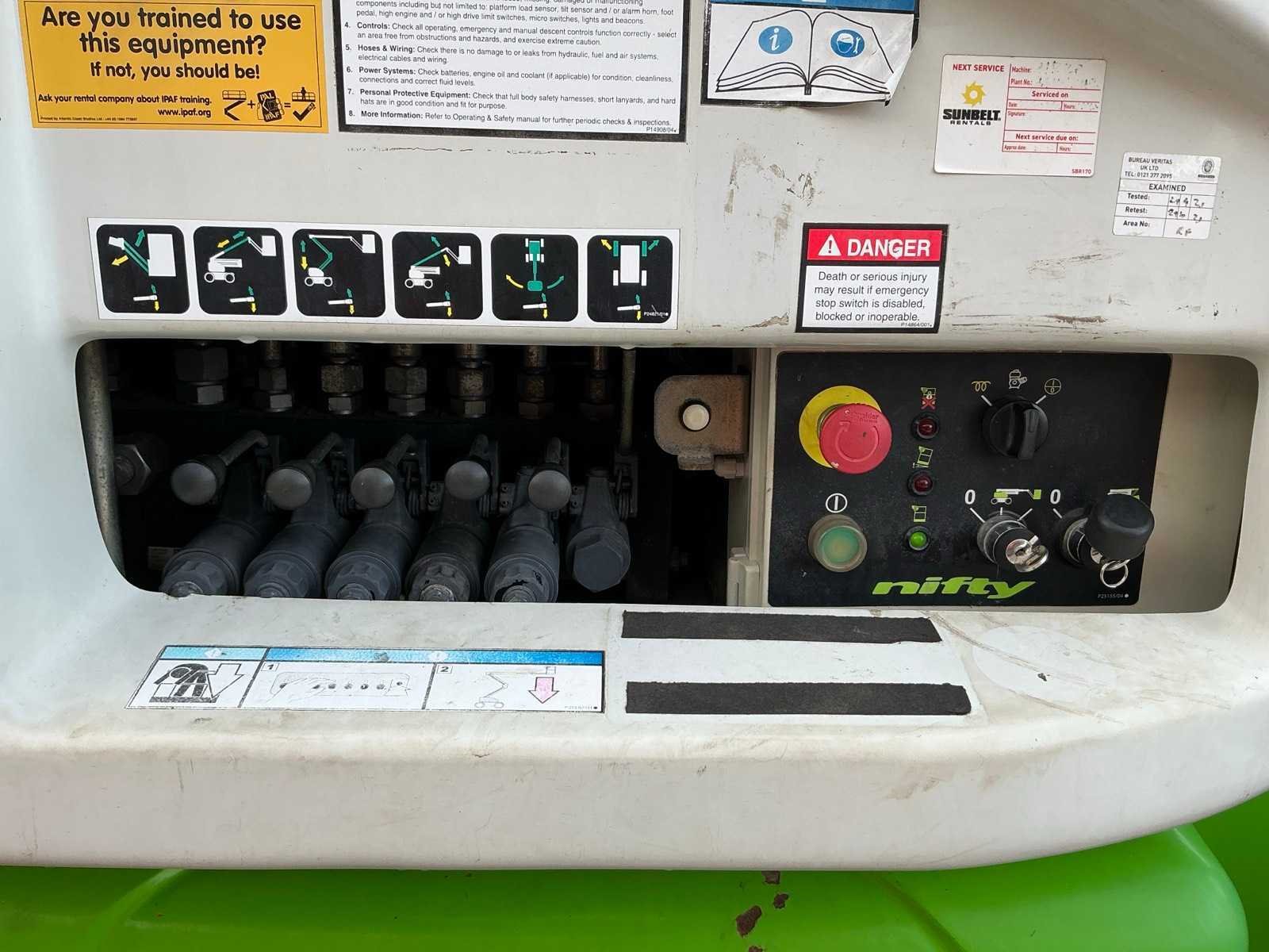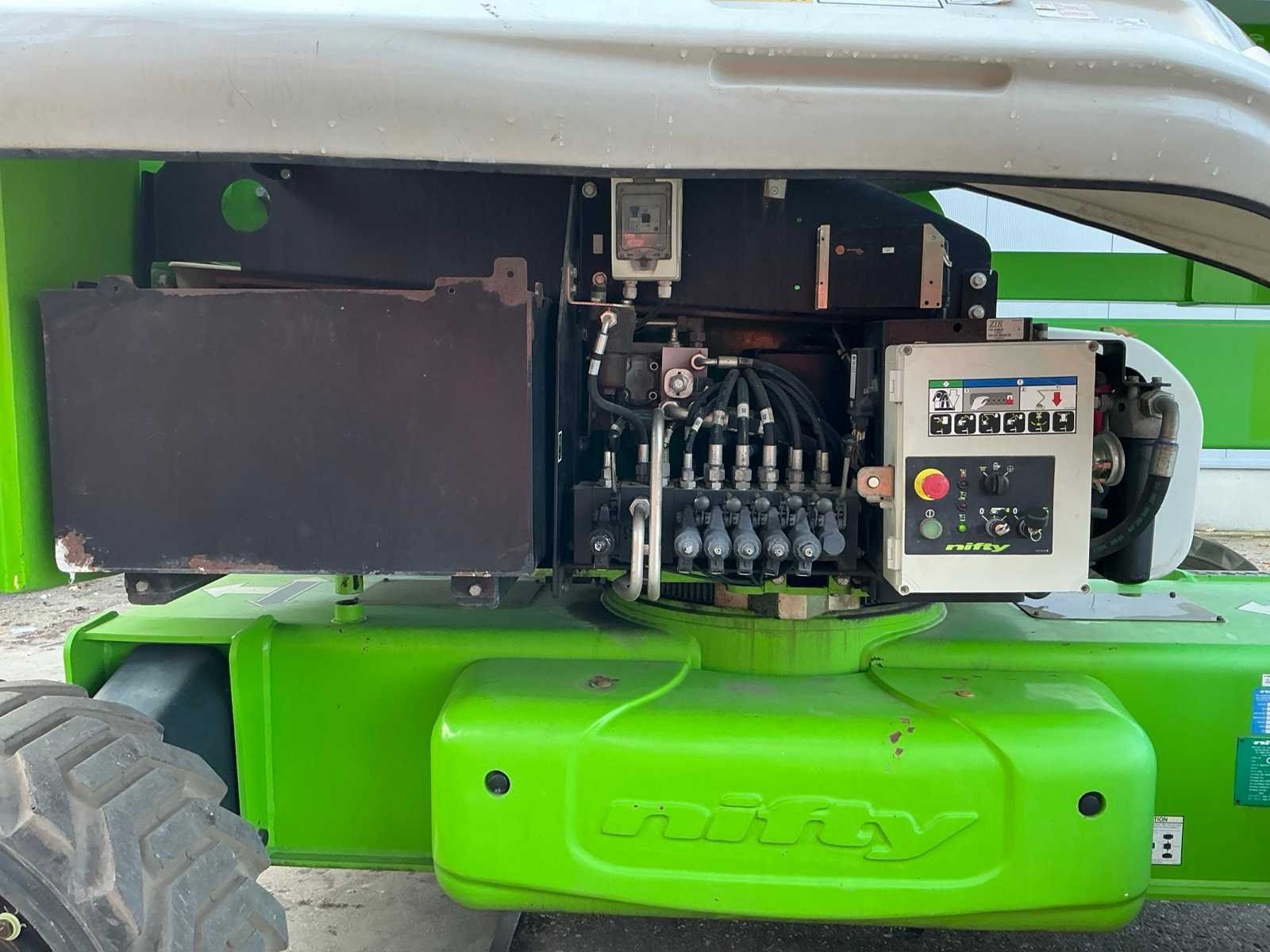 4WD, asstabilisatie, roterende opbouw, roterende werkbak, 110V stekker, 3 delige telescoop mast, max hefhoogte 28000mm, max hefvermogen 280kg Nee Merk: Nifty Type: HR28 Bouwjaar: 2015 Serienummer: 28986 Diesel: true Motorvermogen (kW): 48kW Knikarm hoogwerker: true Werkhoogte: 28000mm Horizontale rijkwijdte: 19000mm Plateau afm. l: 900mm Plateau afm. b: 2400mm Platform capaciteit: 280kg Afgelezen urenstand: 1879 Eigen gewicht: 14660kg Totale afmeting L: 9300mm Totale afmeting Breedte: 2500mm Totale afmeting Hoogte: 2700mm