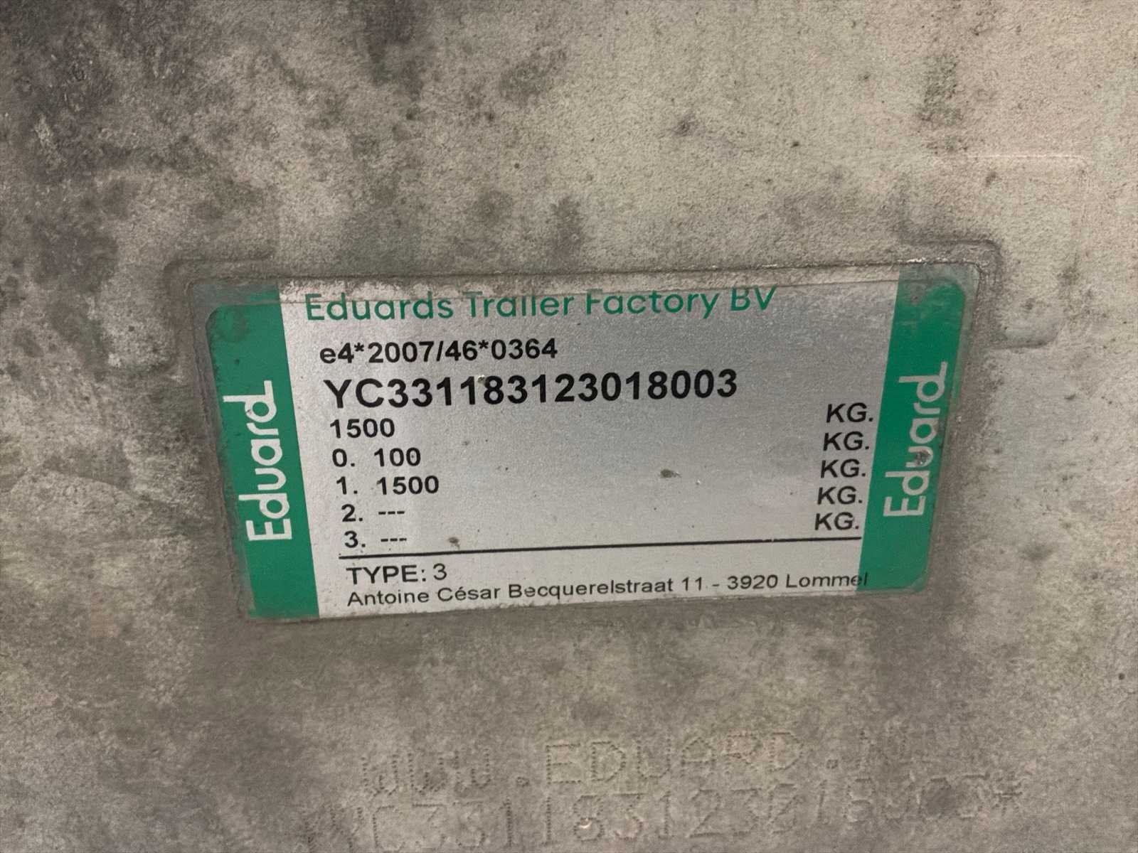 Let op! Dit voertuig heeft een kentekenregristratie, bij afhalen dient u dit ter plaatse bij een derde partij te naam te stellen of te exporteren. Hier ijn extra kosten aan verbonden. Nee Merk: Eduard Bouwjaar: 2023 Chassisnummer: YC331183123018003 Aantal assen: 1 Laadbak afmeting l: 315cm Laadbak afmeting b: 183cm Ledig gewicht: 356kg Laadvermogen: 1144kg Datum eerste toelating: 2023-11-24 Datum eerste toelating (NL): 2023-11-24 Kenteken: 11-WJX-4 Lengte: 445cm Nationaliteit documenten: Nederlands Zelf rijdend exporteren: Mogelijk