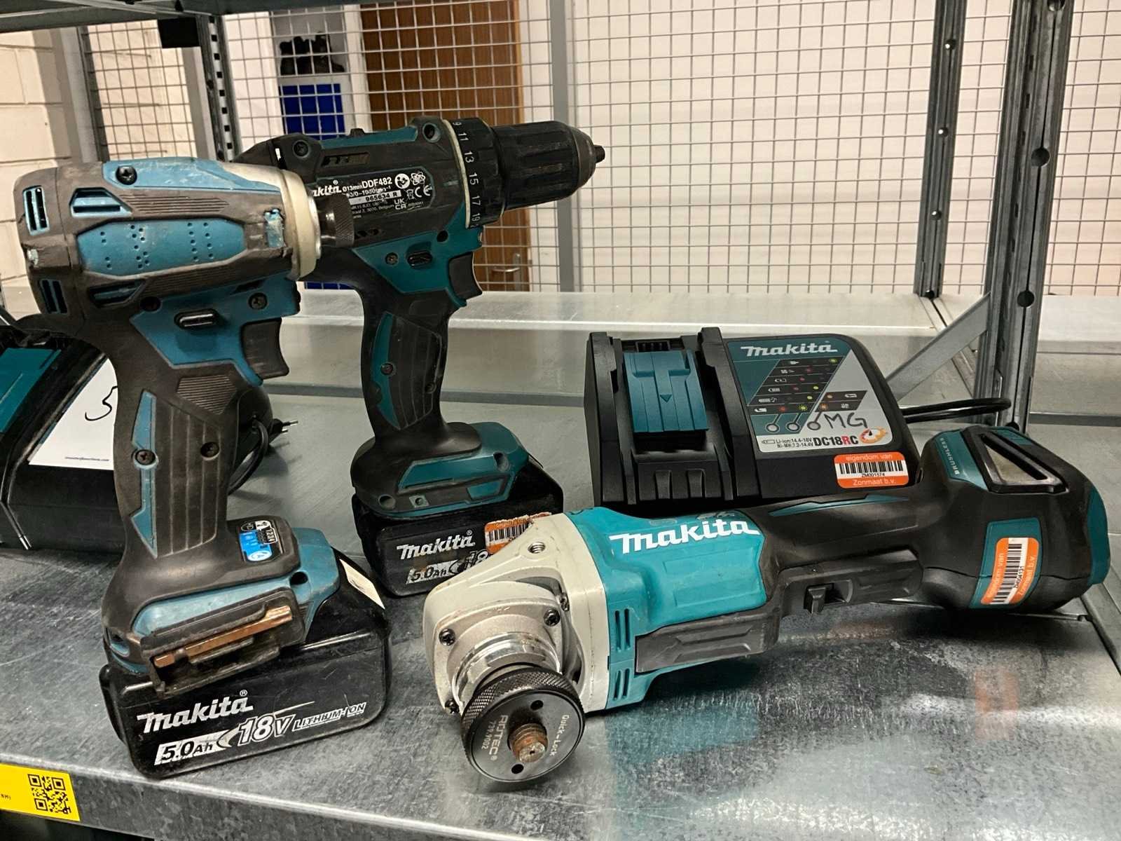 Bestaande uit: Haakse slijpmachine, slagschroefmachine, & schroefboormachine Nee Merk: Makita Accu type: 18 V 5Ah Aantal accu's: 2 Accu lader: true