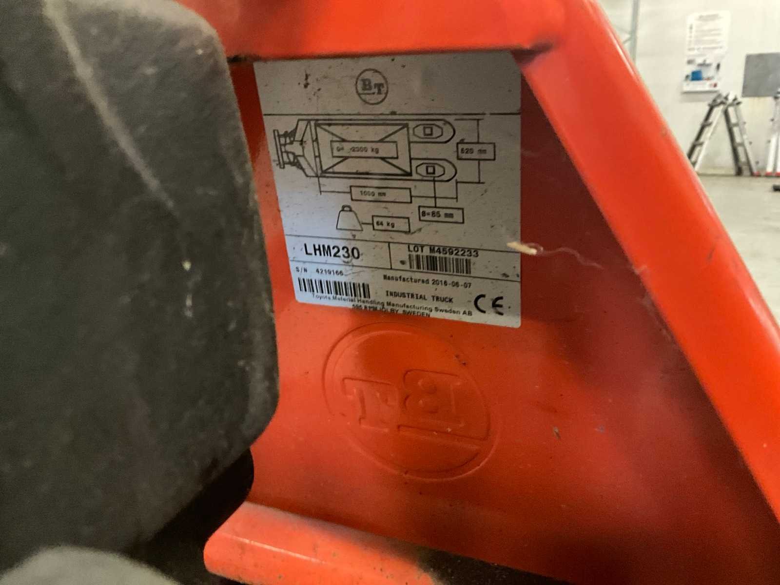 Nee Merk: BT Type: LHM230 Bouwjaar: 2016 Serienummer: 4219166 Hefvermogen: 2300kg Lepellengte: 1000mm Totale afmeting L: 1260mm Totale afmeting Breedte: 520mm Totale afmeting Hoogte: 1240mm