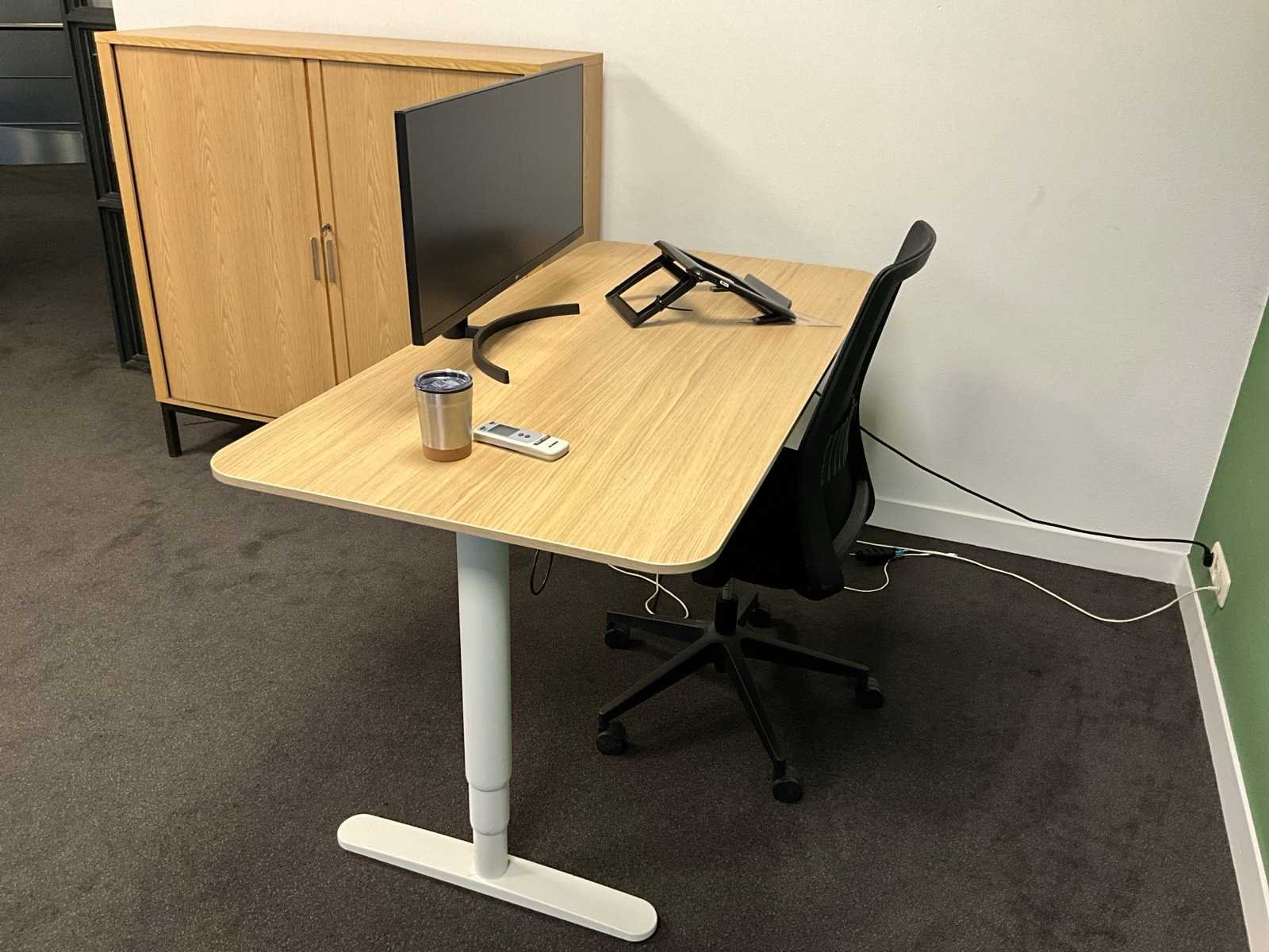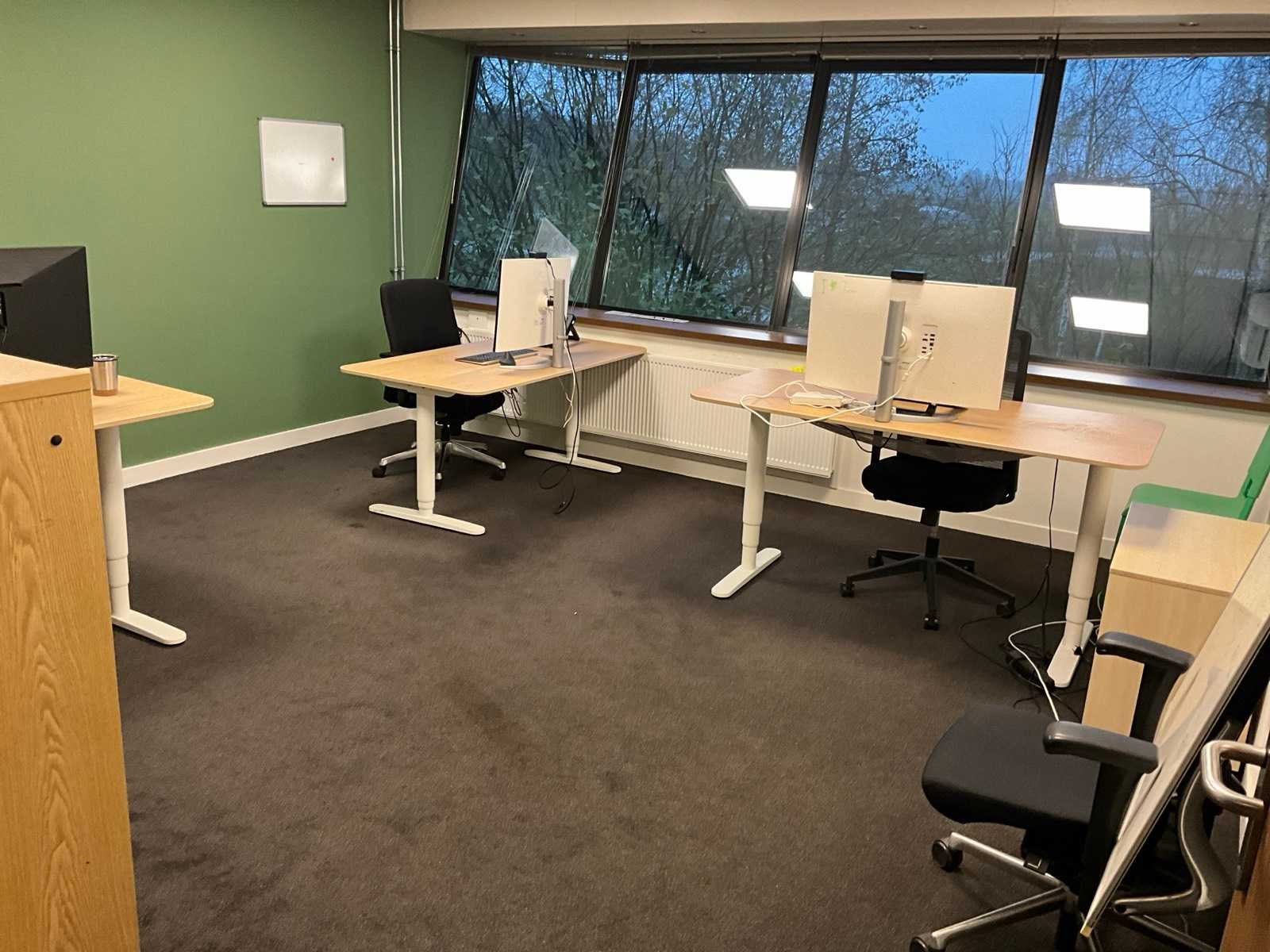 Inclusief 4x bureaustoel, 2x LG monitor 32UQ85R, 1X LG monitor 35WN73A, 1x ladeblok, 1x schuifdeur kast (135x42x130cm) Nee Lengte: 160cm Breedte: 80cm Hoogte: 80cm