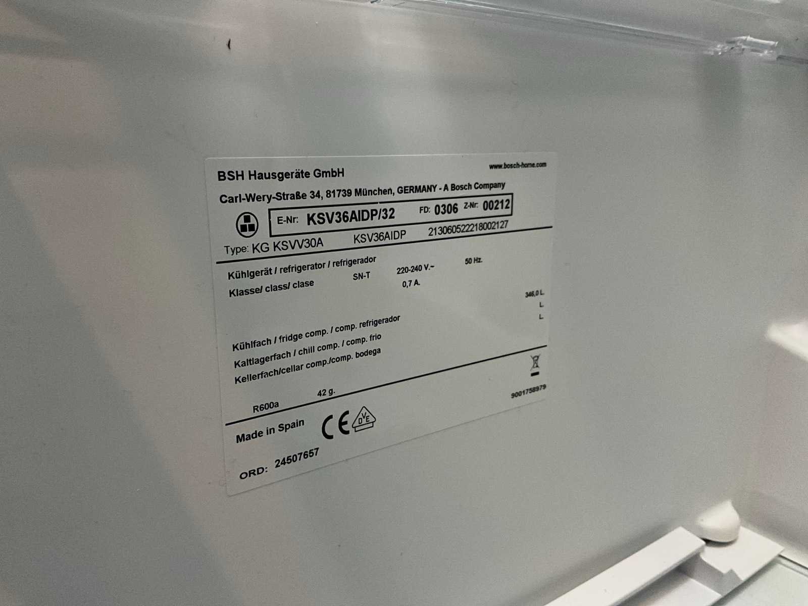 Inclusief stelling met voorraad Nee Merk: Bosch Model: KG KSVV30A Deur opent naar: Iinks Totaal netto inhoud: 346l Spanning: 230V Kleur: Grijs Lengte: 67cm Breedte: 58cm Hoogte: 185cm