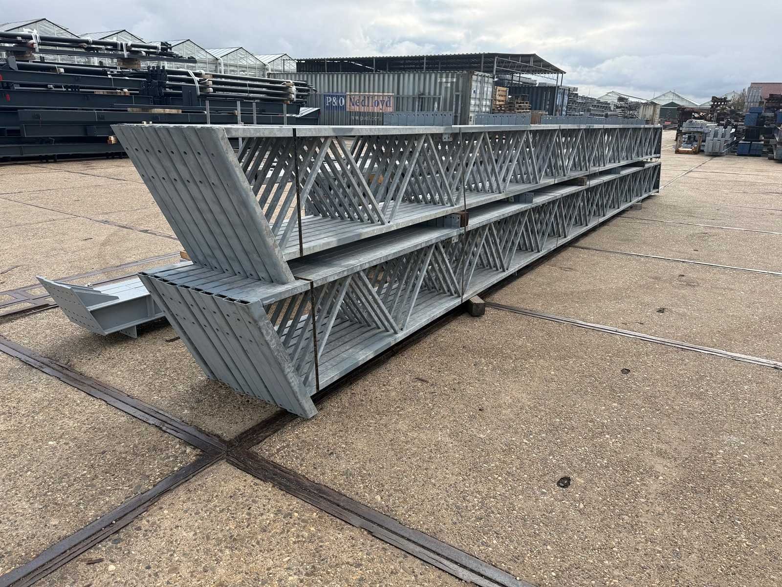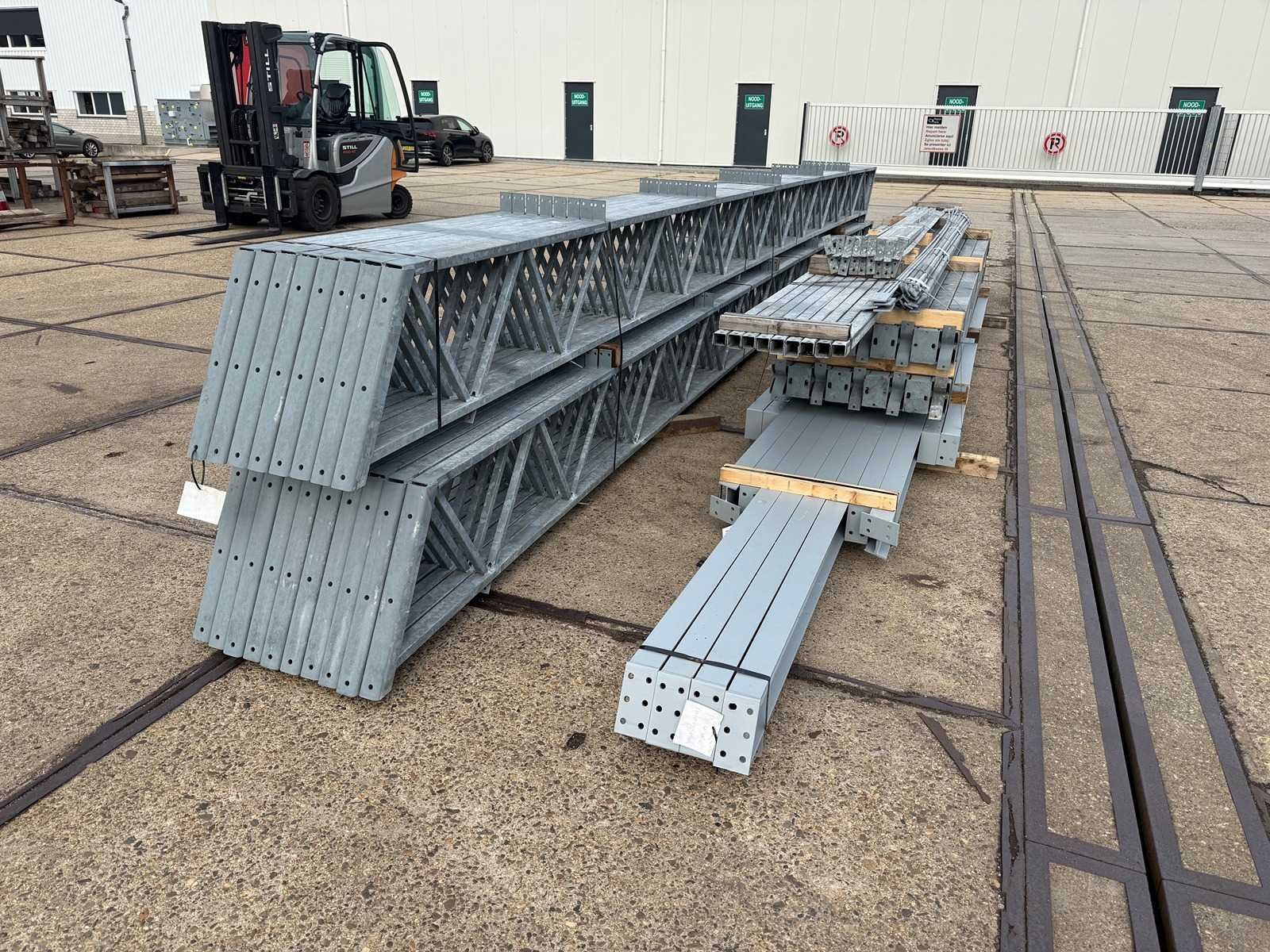 Overspanning trekstang tussen de spanten; spanten h.o.h. 4000mm; bestaande uit 9 sets traliespanten met kokers als staanders; 2 sets eindspanten met windstijlen IPE140; dakhelling 25 graden; voorzien van trekstangen met ophangstrips; windverbanden en kruisschoren; kavel ligt netjes transportklaar en dient met 1 trailer opgehaald te worden; kavel wordt gratis met een heftruck geladen No Materiaal: Gegalvaniseerd en geschilderd staal Totaal oppervlakte: 608m² Nok hoogte: 7500mm Goot hoogte: 4000mm Totale afmeting L: 40000mm Totale afmeting Breedte: 15200mm