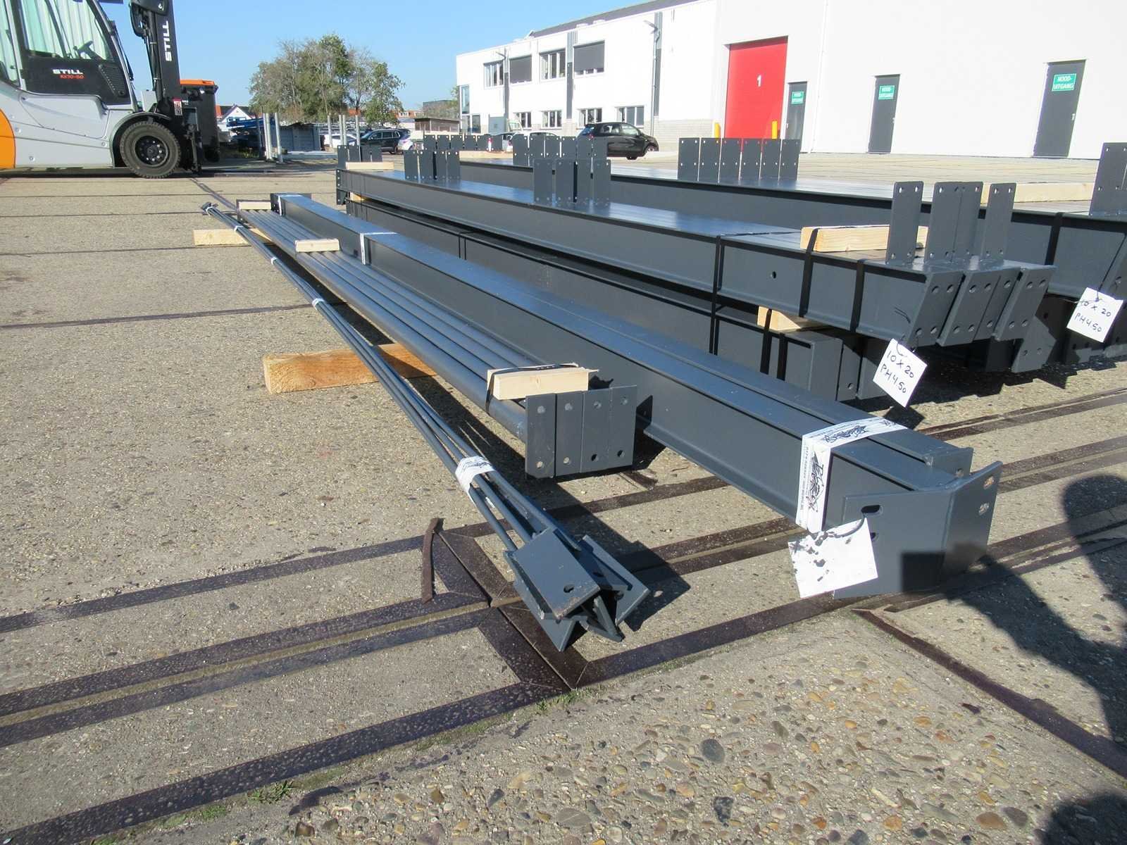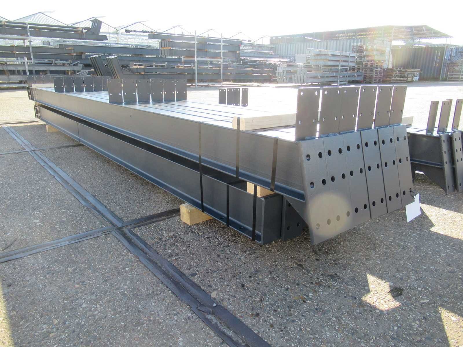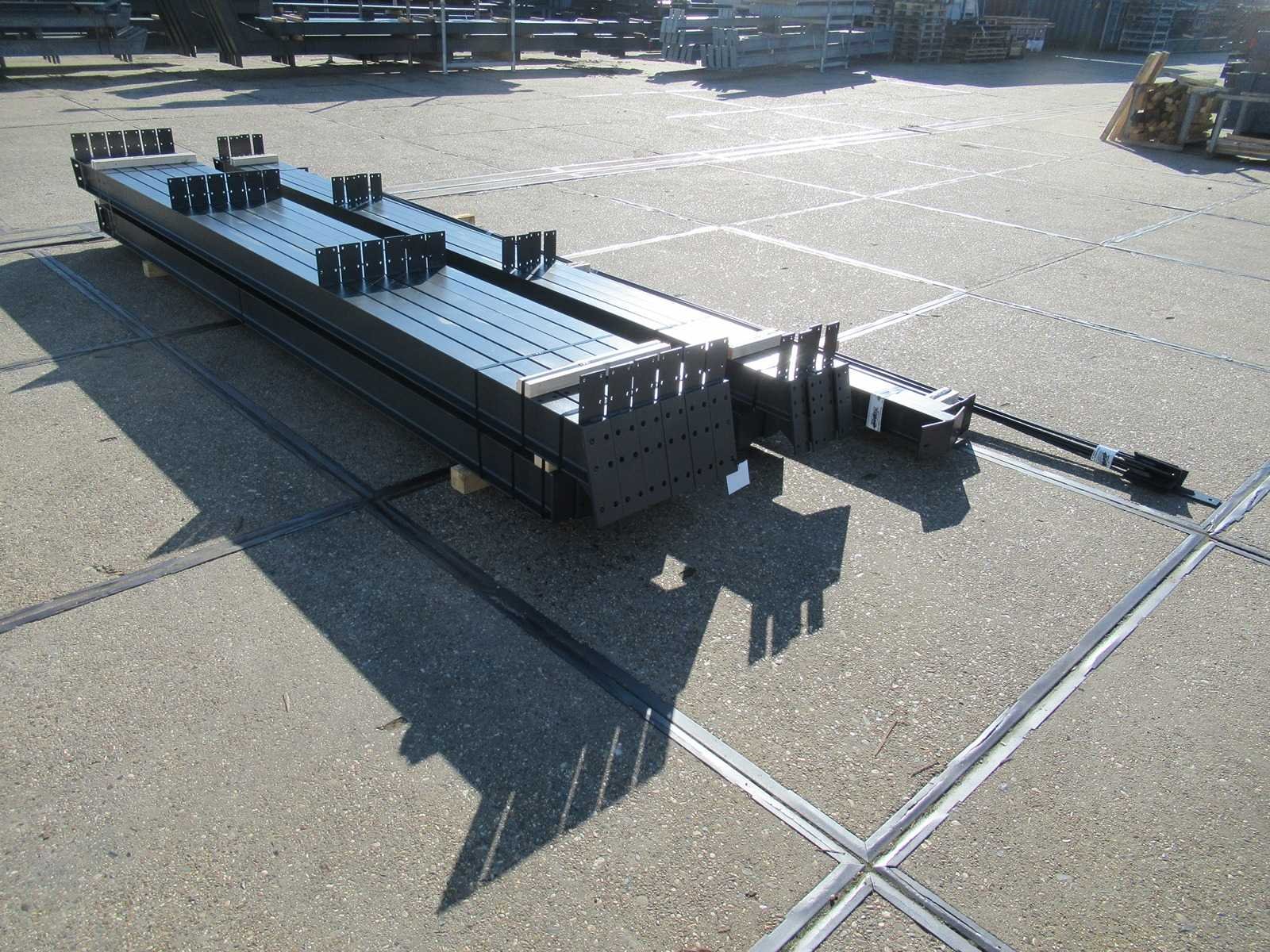 Vrije overspanning; spanten h.o.h. 5000mm; dakhelling 15 graden; 3 sets tussenspanten IPE180; 2 sets eindspanten met windstijlen IPE140; staaltekening; 3D-tekening; voorzien van drukkokers; windverbanden; gordinglippen op de spanten; kavel ligt netjes transportklaar en dient met 1 trailers opgehaald te worden; kavel wordt gratis met een heftruck geladen No Materiaal: Geschilderd staal kleur blauw Totaal oppervlakte: 200m² Nok hoogte: 5850mm Goot hoogte: 4500mm Totale afmeting L: 20000mm Totale afmeting Breedte: 10000mm
