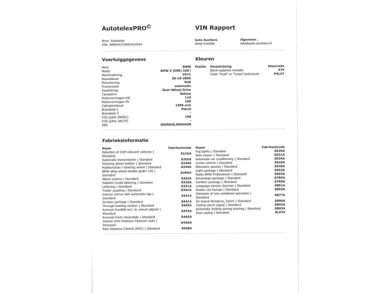 Voor vragen kunt u mailen naar info@auto-auctions.nl No Kenteken: 50-SB-NR Merk: BMW Model: 3-serie Type: 320i Dynamic Executive Afgelezen kilometerstand: 196275km Cilinderinhoud: 1995cc Vermogen (kW): 110kW Brandstof: Benzine Chassisnummer: WBAVA71040VA42457 Datum eerste toelating: 2005-11-11 Datum eerste toelating (NL): 2005-11-11 APK vervaldatum: 2026-06-11 Vermogen (pk): 150hp Aantal zitplaatsen: 5 Kleur: zwart Transmissie: Automaat Emissieklasse: 4 Aantal deuren: 4 Aantal sleutels: 1 Ledig gewicht: 1365kg Bruto BPM (NL): 11338€ Aantal cilinders: 4 Carrosserie: sedan Onderhoudshistorie: Gedeeltelijk Aanwezig Start en rijdt: Ja