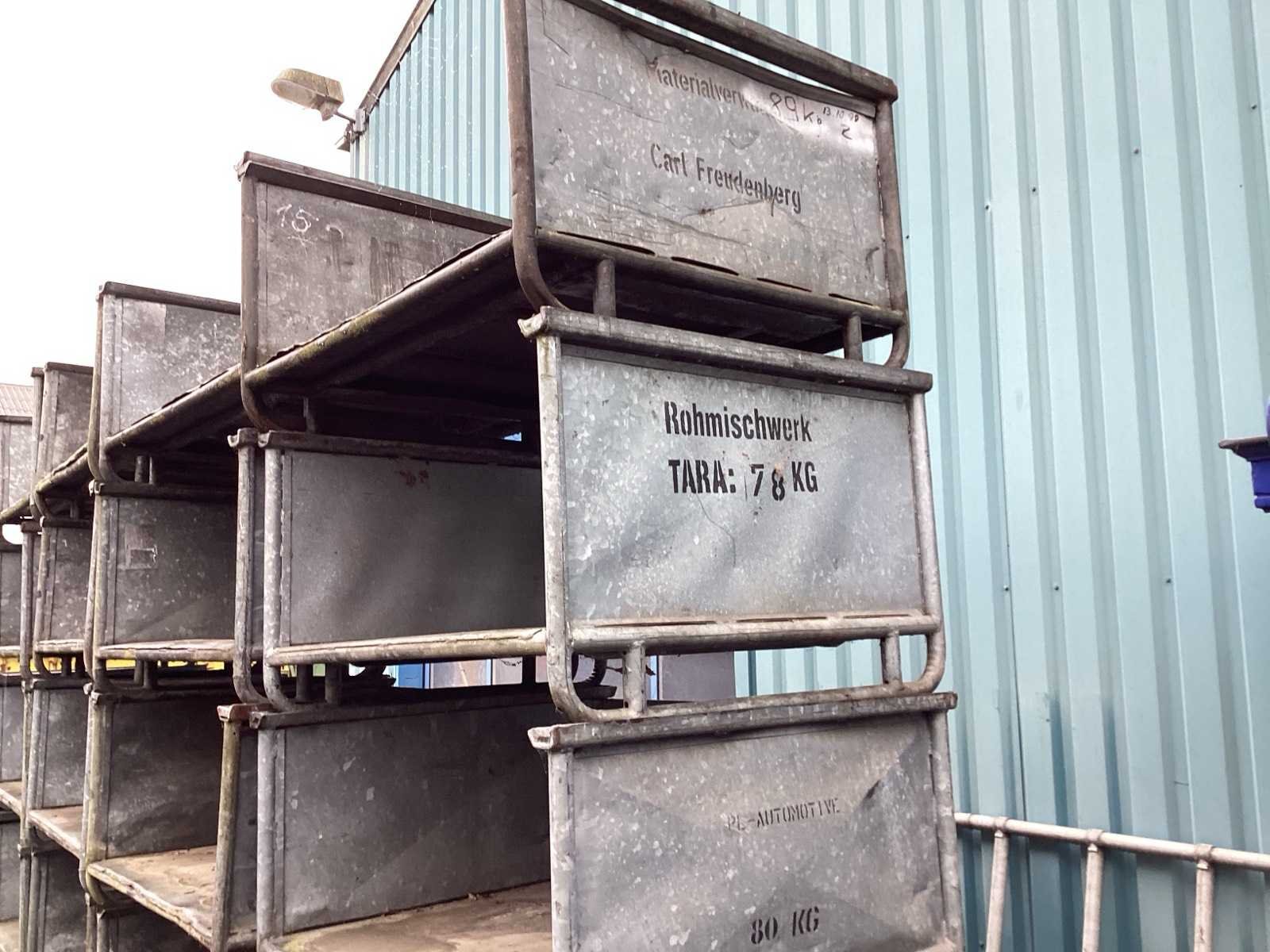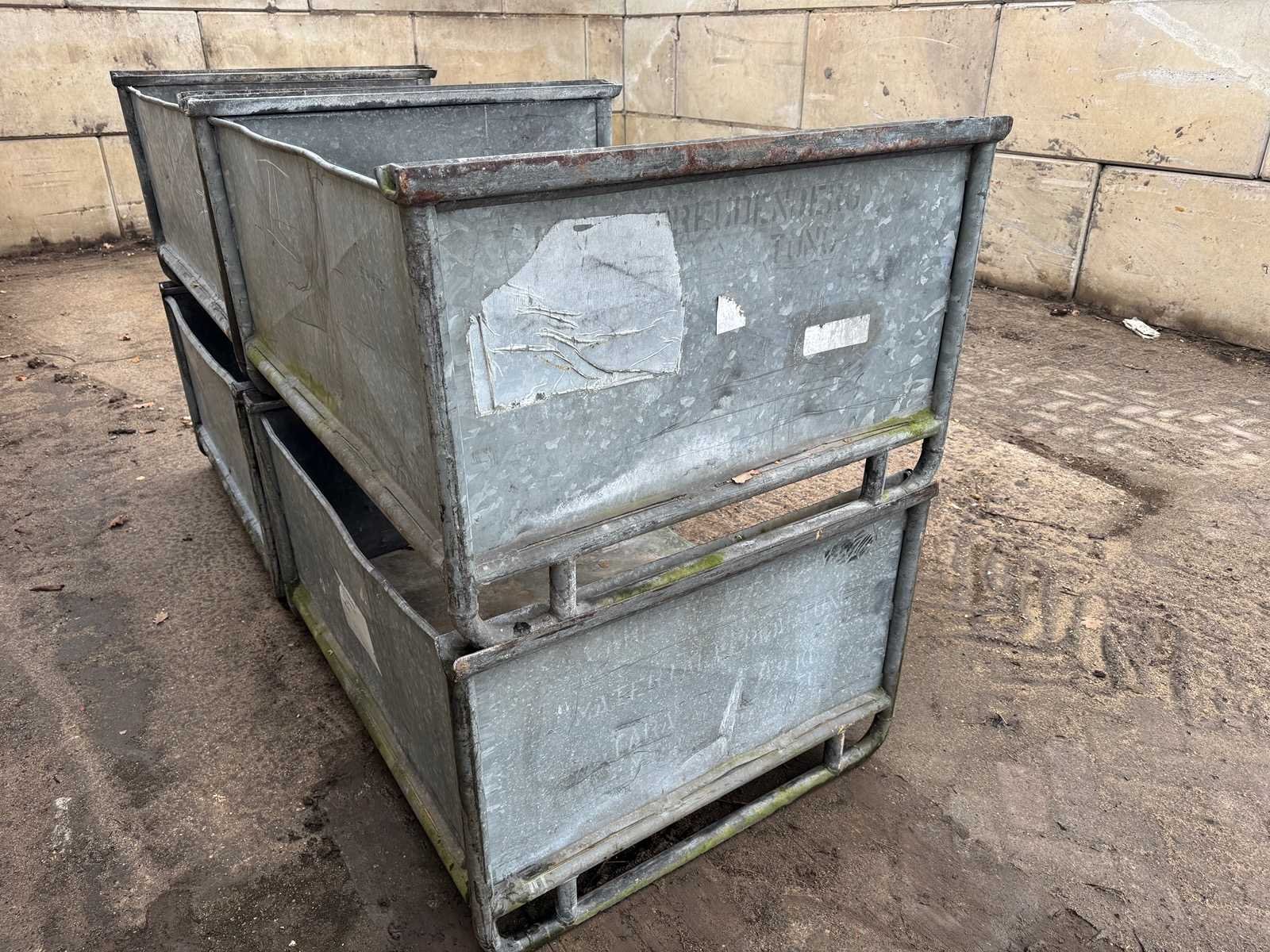 Gegalvaniseerde stapelbare kratten; 80 kg per stuk; Aantallen ongeveer 100 stuks. Kunnen geladen worden met een heftruck. Nee Merk: Gegalvaniseerde stapelbare kratten Type: 120x100x65 cm Afmeting l: 1200mm Afmeting b: 1000mm Afmeting h: 650mm Eigen gewicht: 80kg