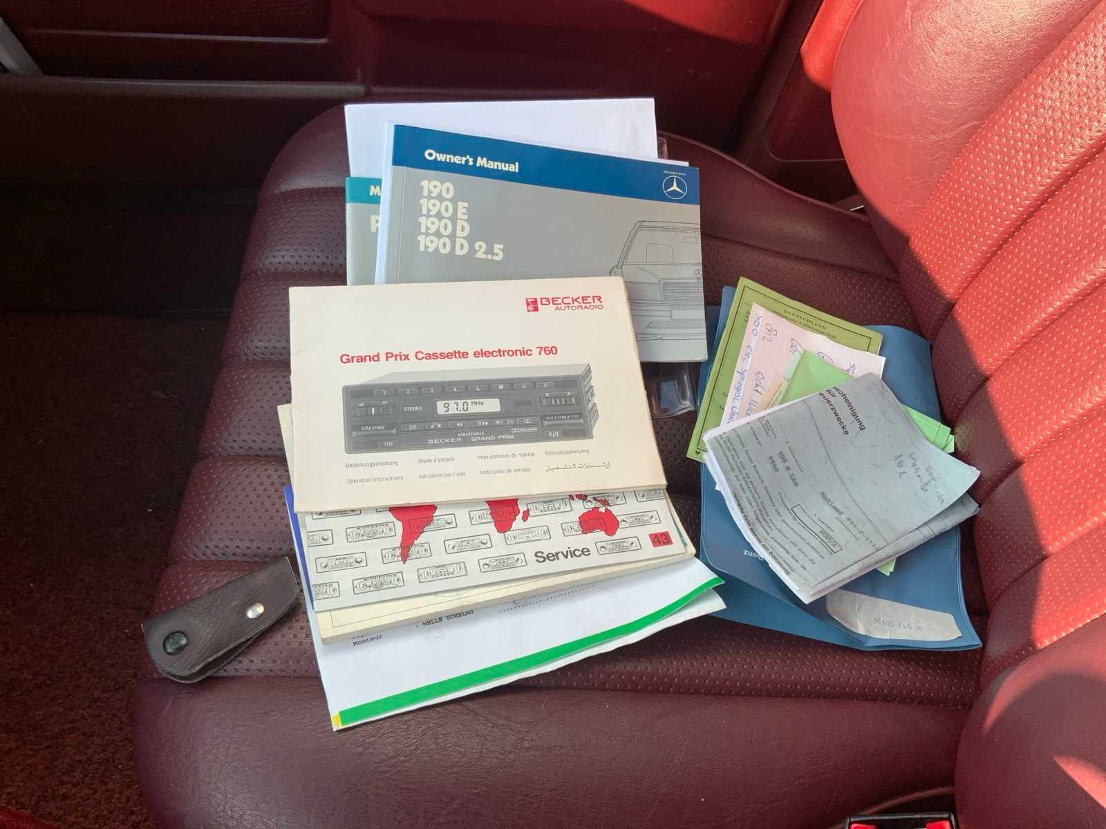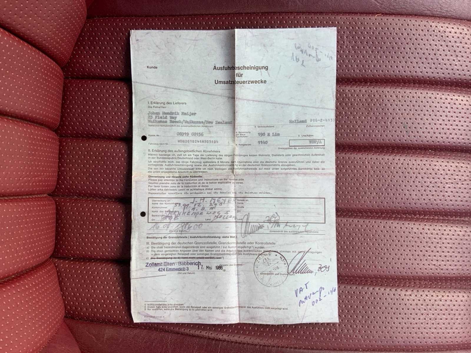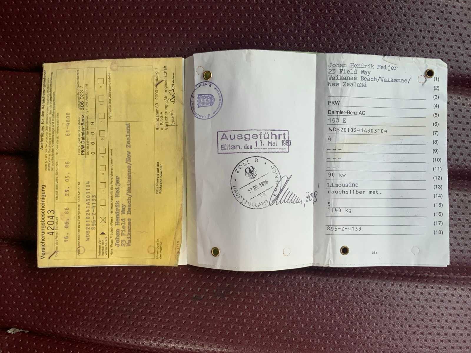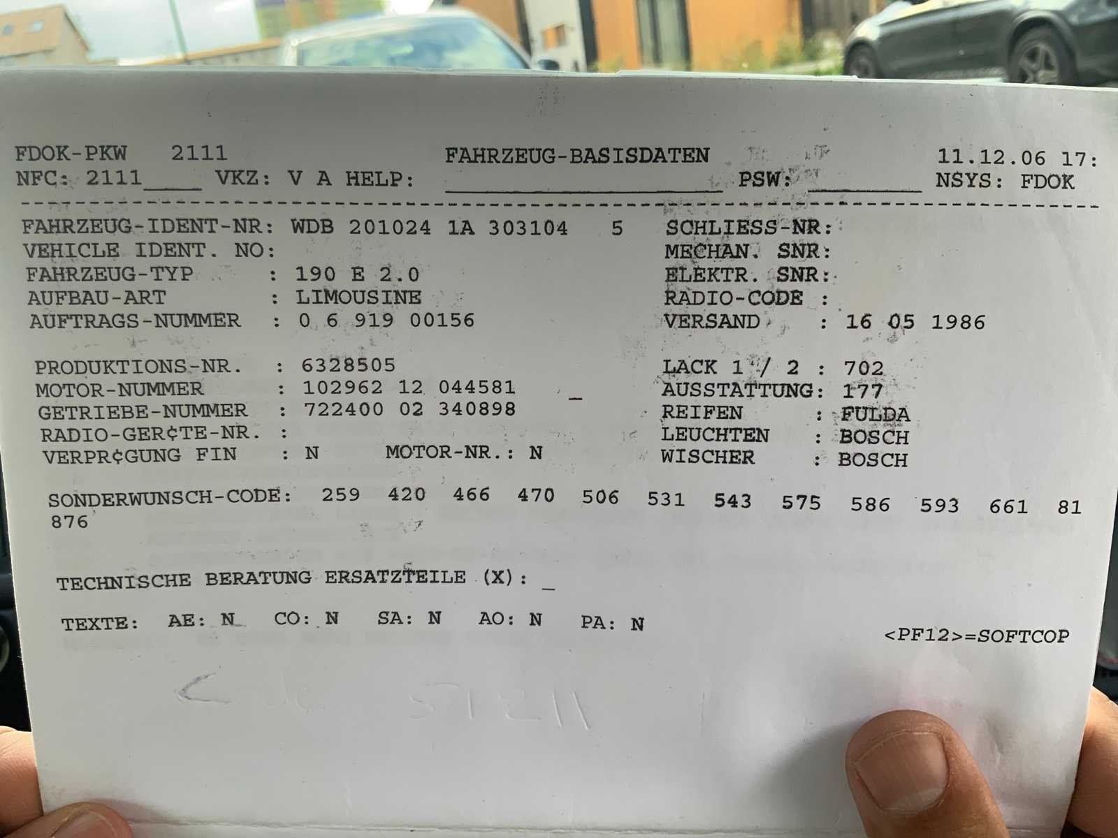 Gebruikerssporen naar leeftijd en kilometerstand * lakschade / roestplek links achter * roestplek rechts achter wielkas * verwering lak op dak en motorkap * scheur in leder rechter deur * diverse drukknoppen en schakelaars hangen los zoals de bedieningsknoppen elektrische ramen * onderhouds historie gedeeltelijk aanwezig * wordt nog minimaal mee gereden Nee Kenteken: RP-03-KV Merk: Mercedes-benz Type: 190E Bouwjaar: 1986 Chassisnummer: WBD2010241A303104 Afgelezen kilometerstand: 208749 Brandstof: benzine Datum eerste toelating: 1986-06-30 Datum eerste toelating (NL): 1987-11-03 APK vervaldatum: 2026-10-03 Nationaliteit documenten: Nederlands Kentekenpapieren compleet?: true Carrosserie: Limousine Aandrijving: RWD Transmissie: Automaat Vermogen (kW): 90kW Aantal deuren: 4 Aantal zitplaatsen: 4 Stuurwiel: Links Velgmaat: 185/65R15 Aantal sleutels: 1 Accessoires - checkbox: Rood lederen bekleding * voorzien van originele boekjes en documentatie * voorzien van originele radio (los meegeleverd * elektrische bedienbare ramen * airco Startinformatie: Start en rijdt naar behoren Kleur: beige Cilinderinhoud: 2000 Aantal cilinders: 4 Ledig gewicht: 1097