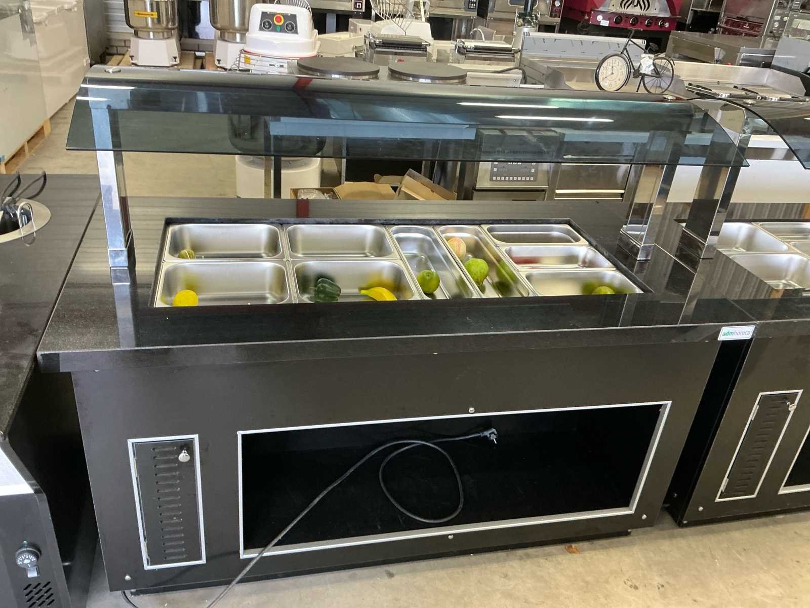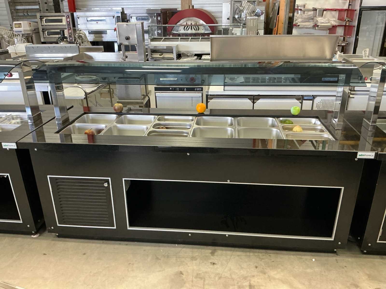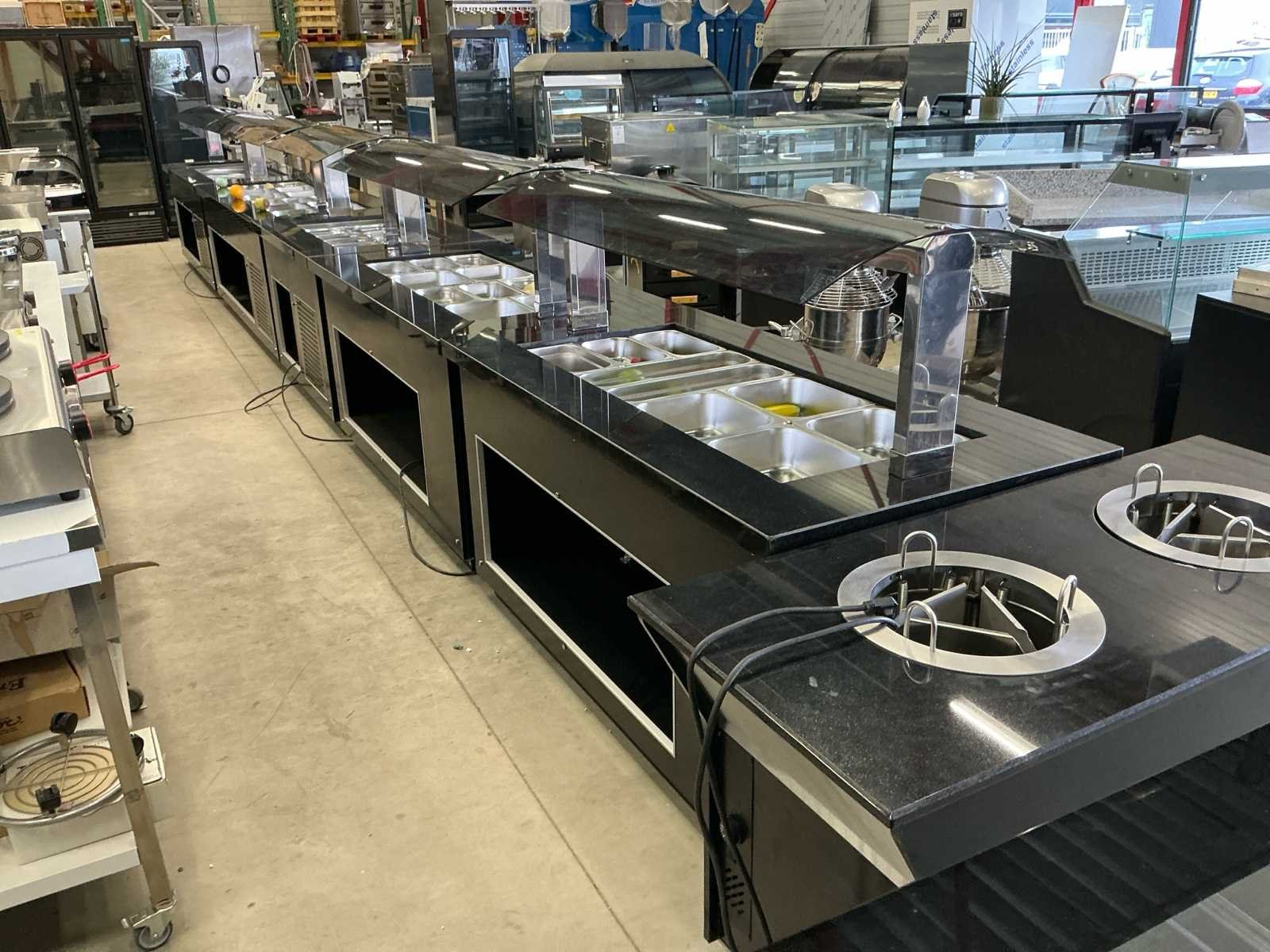 Beurs/ showroom model, exclusief rvs bakken Totale lengte: 9,60m 88cm breed 1,35m hoog No Bestaande uit: Bestaande uit: 1e: Borden verwarmer 2e: Warme saladette 3e: Warme saladette 4e: Koude saladette 5e: Koude saladette 6e: Koude saladette