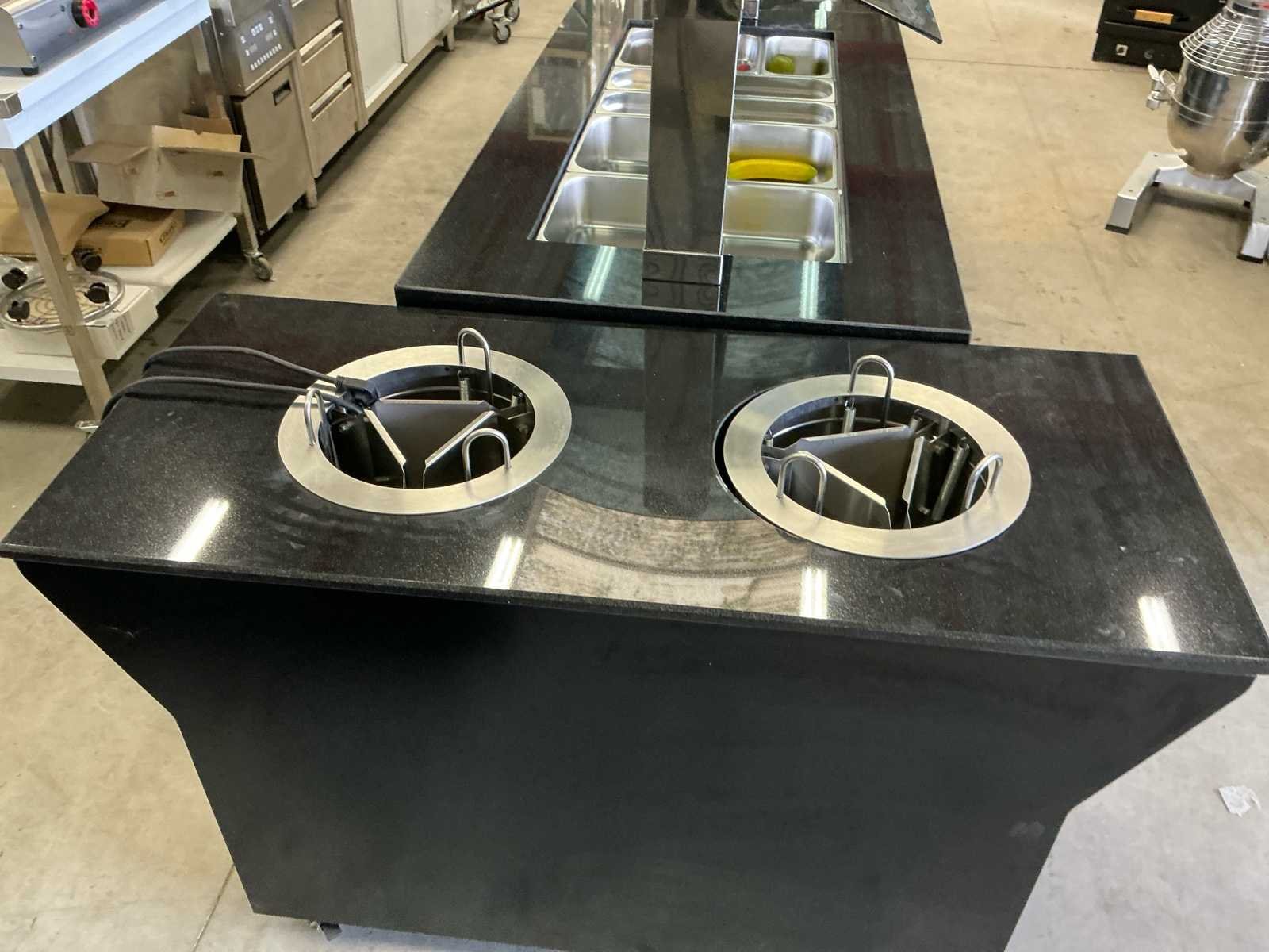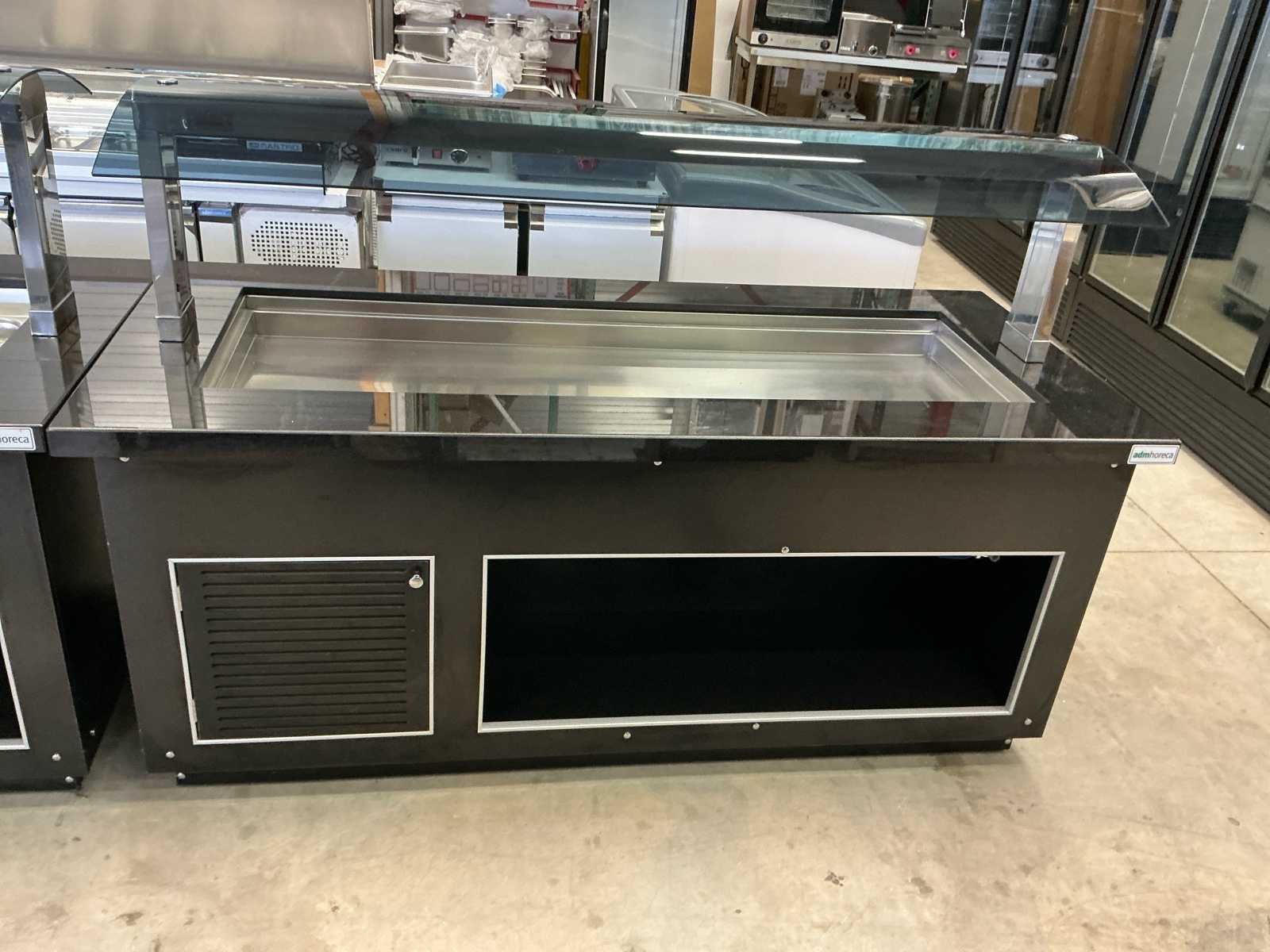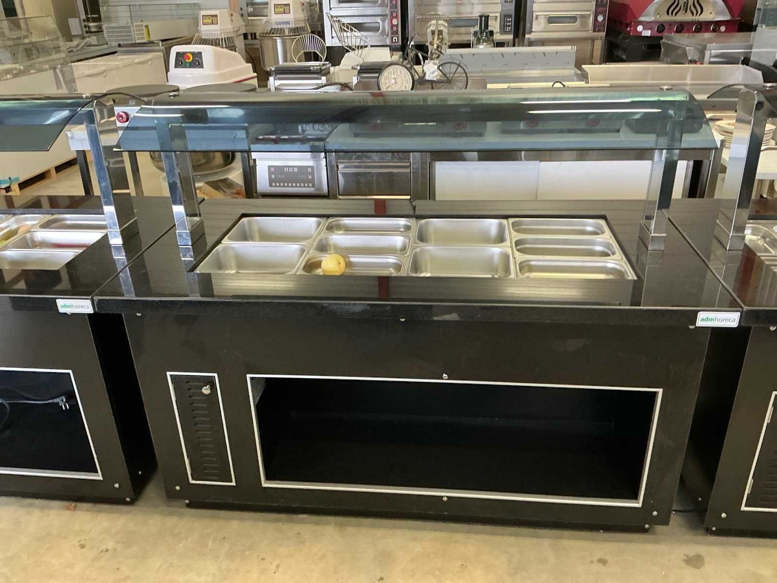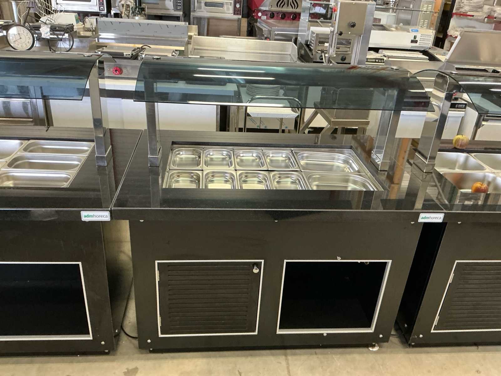 Beurs/ showroom model, exclusief rvs bakken Totale lengte: 9,60m 88cm breed 1,35m hoog No Bestaande uit: Bestaande uit: 1e: Borden verwarmer 2e: Warme saladette 3e: Warme saladette 4e: Koude saladette 5e: Koude saladette 6e: Koude saladette