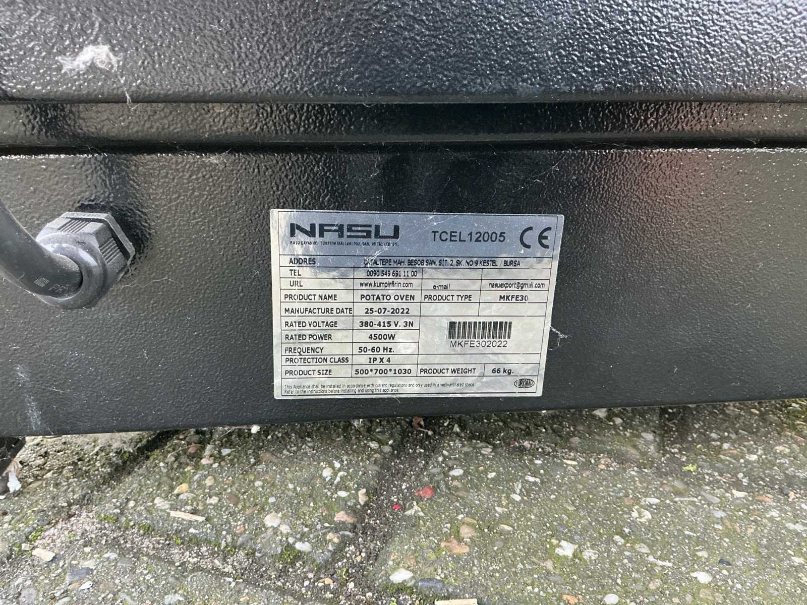 Ongebruikt, oven om aardappels te poffen No Merk: Nasu Type: MKFE30 Bouwjaar: 2022 Elektrisch: true Aansluiting: 380V Totale afmeting L: 700mm Totale afmeting Breedte: 500mm Totale afmeting Hoogte: 1000mm Eigen gewicht: 66kg