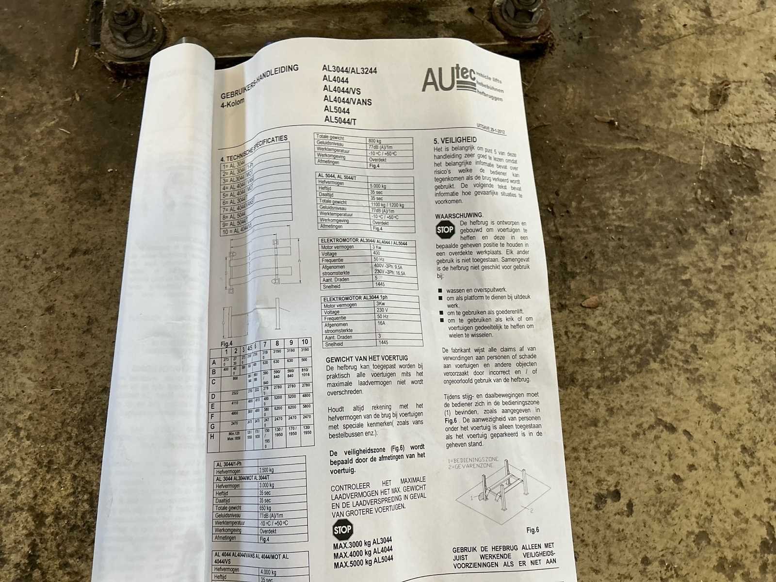 Voorzien van: verstelbare baanbreedte, verlichting, extra brede rijplaten, voetbeveiliging, lucht elektrisch Nee Merk: Autec Type: AL 5044VS Bouwjaar: 2016 Serienummer: 012253 4-koloms: true Capaciteit.: 5000kg Baanbreedte: 2500mm Aansluiting: 400V Totale afmeting L: 5200mm Totale afmeting Breedte: 3200mm Totale afmeting Hoogte: 2400mm