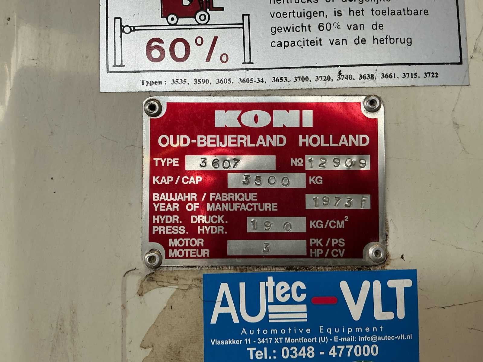 Voorzien van: verlichting Nee Merk: Koni Type: 3607 Bouwjaar: 1973 Serienummer: 12909 4-koloms: true Capaciteit.: 3500kg Baanbreedte: 2400mm Totale afmeting L: 4600mm Totale afmeting Breedte: 2900mm Totale afmeting Hoogte: 2150mm