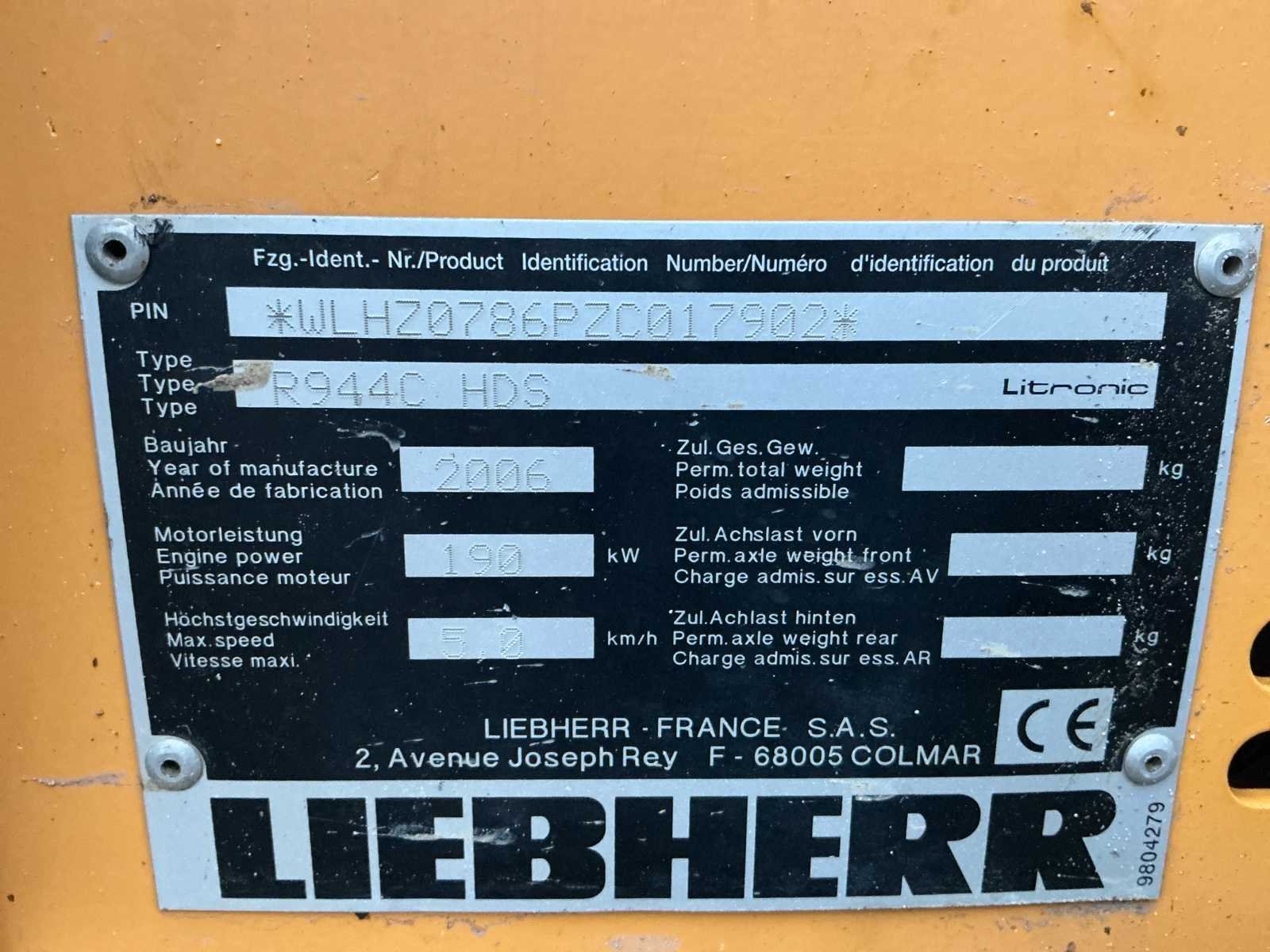 Voorzien van: CW45 aansluiting, graafbak 2.20m breed, De Liebherr R944C HDSL Litronic (2006) is een 44 tons rupsgraafmachine met een 190 kW (258 pk) Liebherr D936L-motor, een monogiek van ca. 6,2 m met stick van ca. 3,3 m (standaardconfiguratie), een maximale graafdiepte van 7–8 m, reikwijdte van 10–11 m, opbreekkracht rond 200 kN, rijsnelheid 5 km/u, zware hydrauliek met sloop-/sorteringsfunctie én een heavy-duty bak met CW/Liebherr-aansluiting. De machine is uitgerust met een sloophamer-/sorteringshydrauliekcircuit, een grote heavy-duty bak met CW45 aansluiting, stalen rupsen en een volledig uitgeruste cabine met ROPS-rolkooi. De graafarm bestaat uit een monogiek van circa 6,20 meter in combinatie met een stick (lepelsteel) van ongeveer 3,30 meter. Nee Merk: Liebherr Type: R944C HDSL Litronic Bouwjaar: 2006 Serienummer: WLHZ0786PZC017902 Merk motor: Liebherr D936L – 6-cilinder diesel Motorvermogen (kW): 190kW Aantal cilinders: 6 Brandstof: Diesel Bedrijfsgewicht: 44000kg Gieklengte: 9500mm Max. werkbereik: 11000mm Max. graafdiepte: 8000mm Met graafbak: true Graafbak afm. l: 1400mm Graafbak afm. b: 2200mm Graafbak afm. h: 950mm Rups breedte: 900mm Cabine: true Afgelezen urenstand: 10937 Eigen gewicht: 44000kg Totale afmeting L: 10500mm Totale afmeting Breedte: 3000mm Totale afmeting Hoogte: 3350mm
