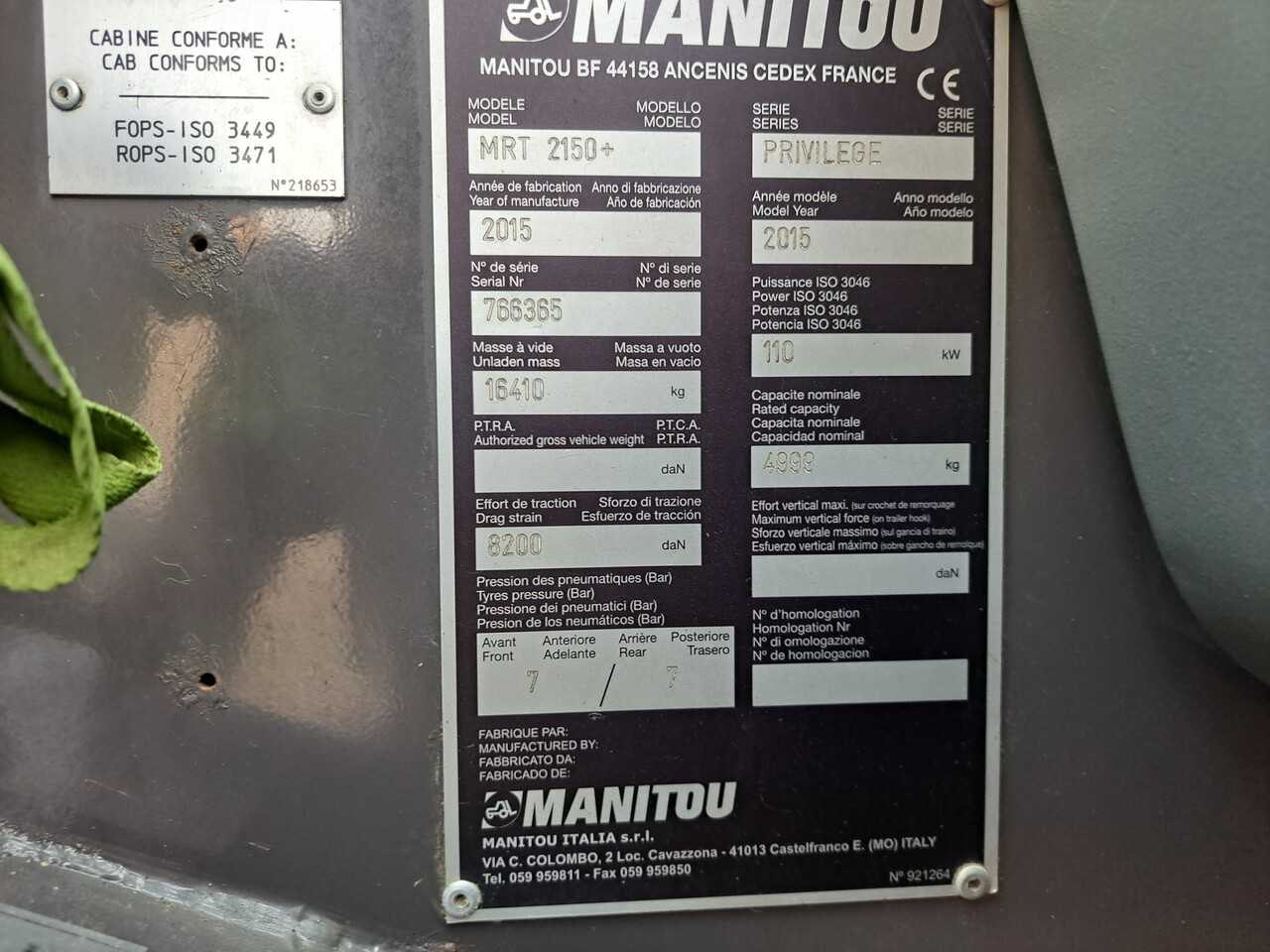 Maximaal horizontaal bereik: 17,9m, duplex telescopisch, Mercedes motor. Nee Merk: Manitou Type: MRT 2150+ Privilege 2015 Bouwjaar: 2015 Serienummer: 766365 Motorvermogen (kW): 115kW Hefvermogen: 5000kg Hefhoogte: 21000mm Cabine: true Vierwielaandrijving 4x4: true Lepellengte: 1200mm Luchtbanden: true Afgelezen urenstand: 11501 Eigen gewicht: 16720kg Totale afmeting L: 7830mm Totale afmeting Breedte: 2490mm Totale afmeting Hoogte: 3050mm
