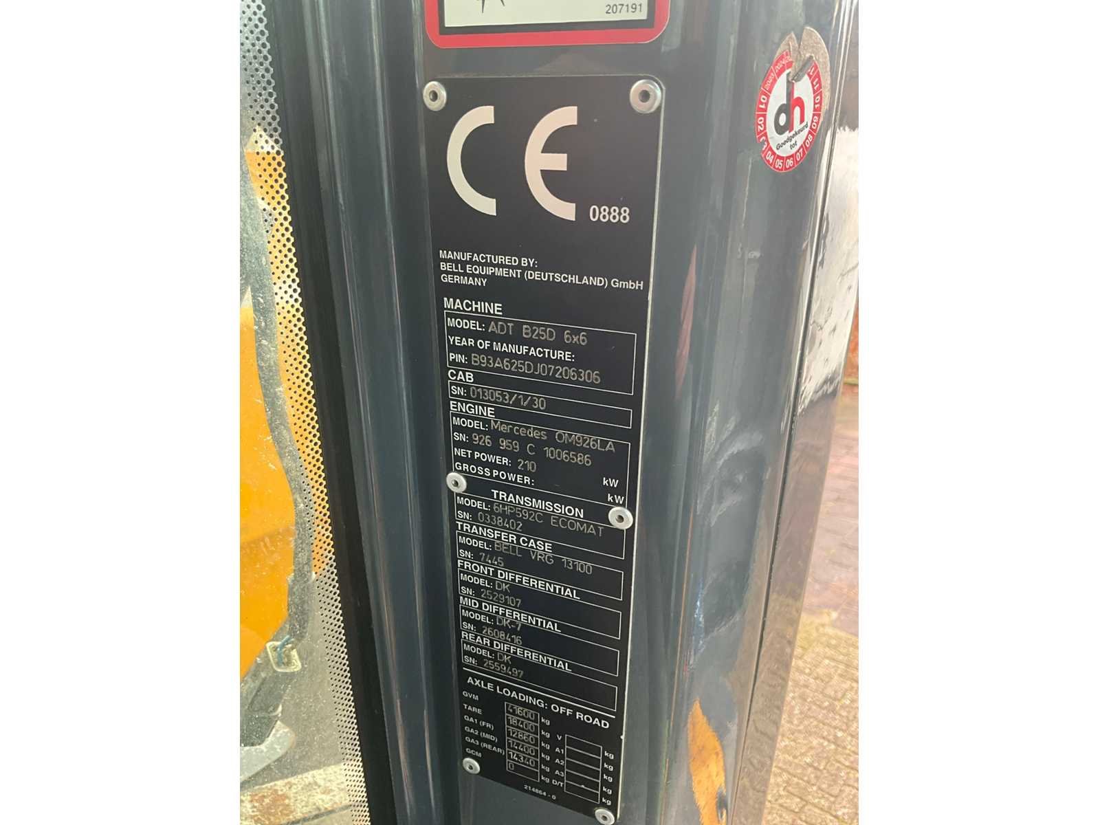 Voorzien van 6-Cil. “Mercedes” dieselmotor; 6x6 aandrijving; urenstand: 12135 uur; gereden km stand: 51583; bakinhoud vlak ca. 14m3; laadvermogen ca. 24/25 Ton; Let op, urenstand oplopen met ca. 50 uur; Nee Merk: Bell Type: ADT B25D 6x6 Serienummer: B93A625DJ07206306 Bouwjaar: 2012 Merk motor: Mercedes Motorvermogen (kW): 210kW Aantal cilinders: 6 Brandstof: Diesel Bandenmaat: 23.5R25 Cabine: true Afgelezen urenstand: 12135
