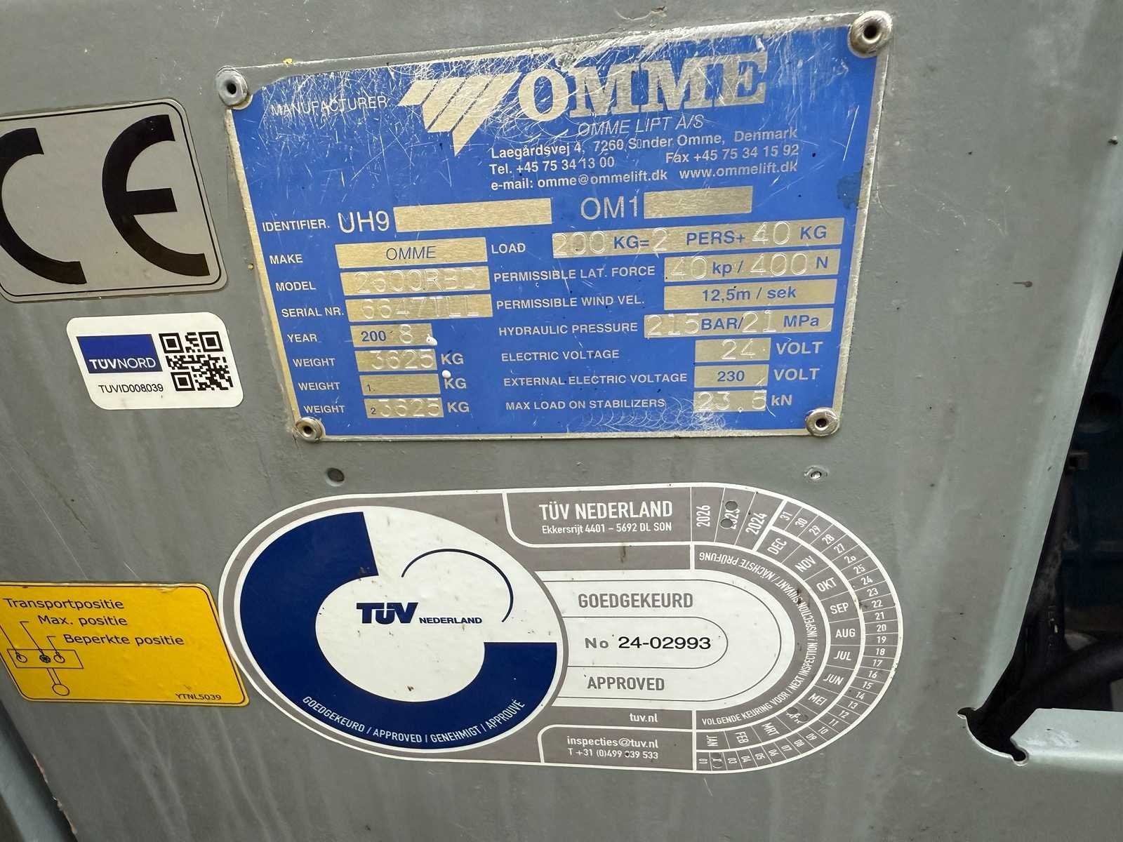 Ingebouwde acculader, Hybride - Diesel + Accu, Onderhouds geschiedenis Nee Merk: Omme Type: 2600 RBD Bouwjaar: 2008 Serienummer: 6647TLL Diesel: true Elektrisch: true Telescoop hoogwerker: true Werkhoogte: 26000mm Horizontale rijkwijdte: 13000mm Plateau afm. l: 1250mm Plateau afm. b: 800mm Platform capaciteit: 200kg Afgelezen urenstand: 1112 Eigen gewicht: 3625kg Totale afmeting L: 7310mm Totale afmeting Breedte: 1100mm Totale afmeting Hoogte: 1990mm