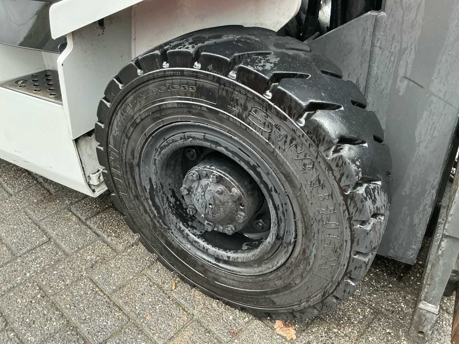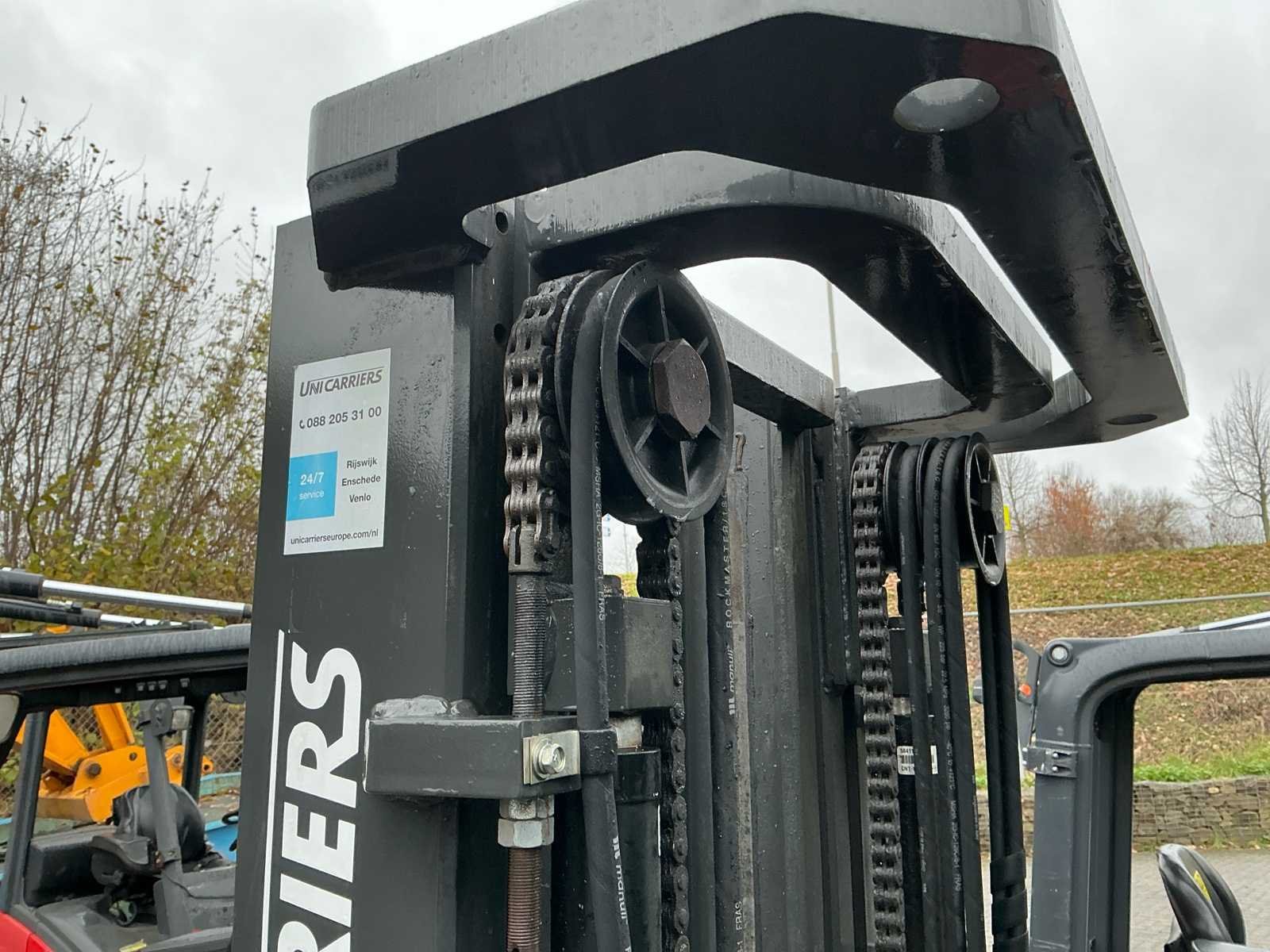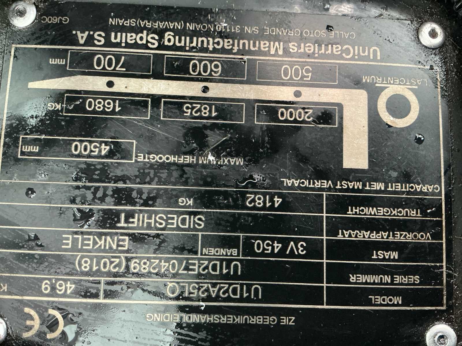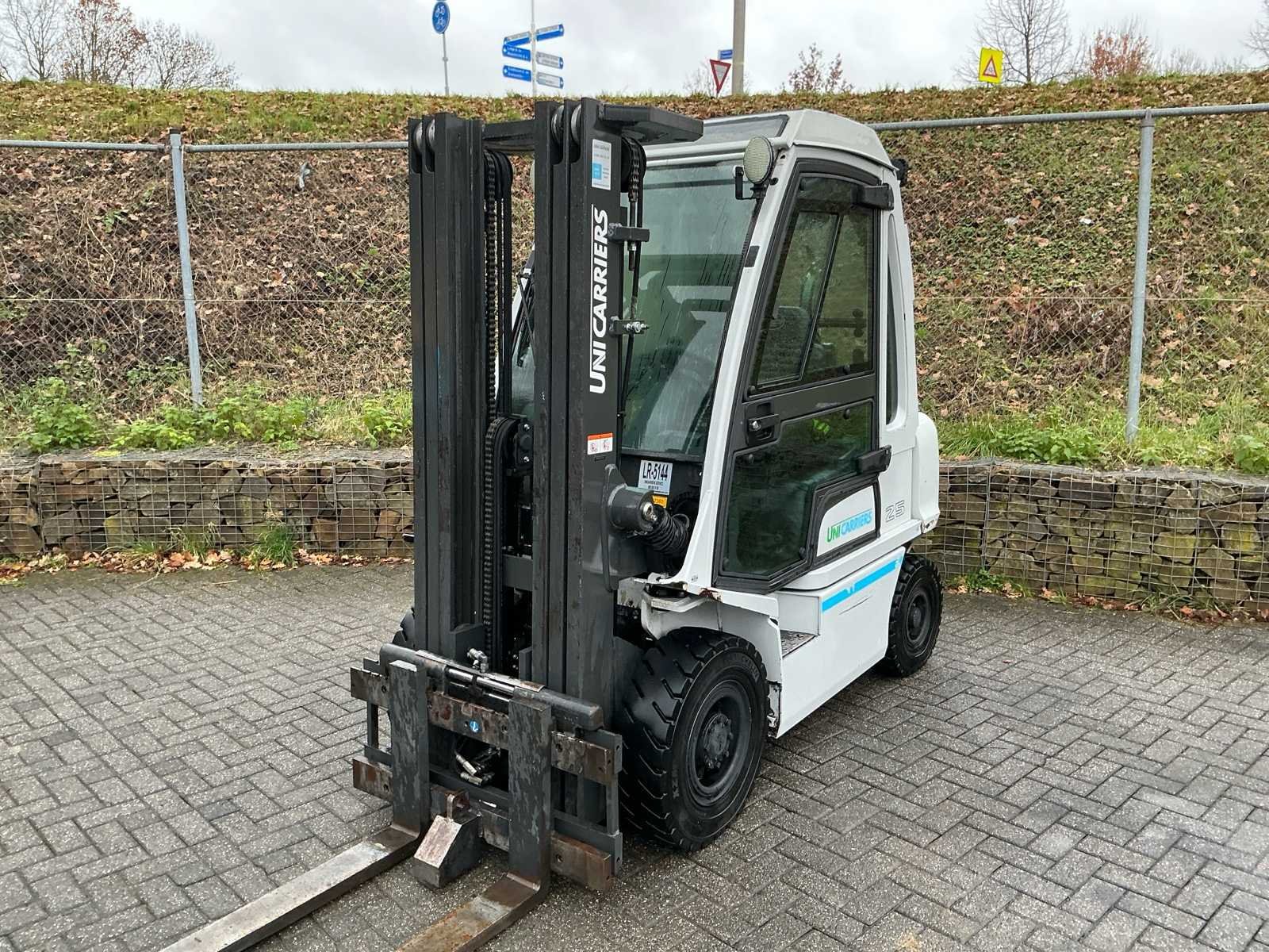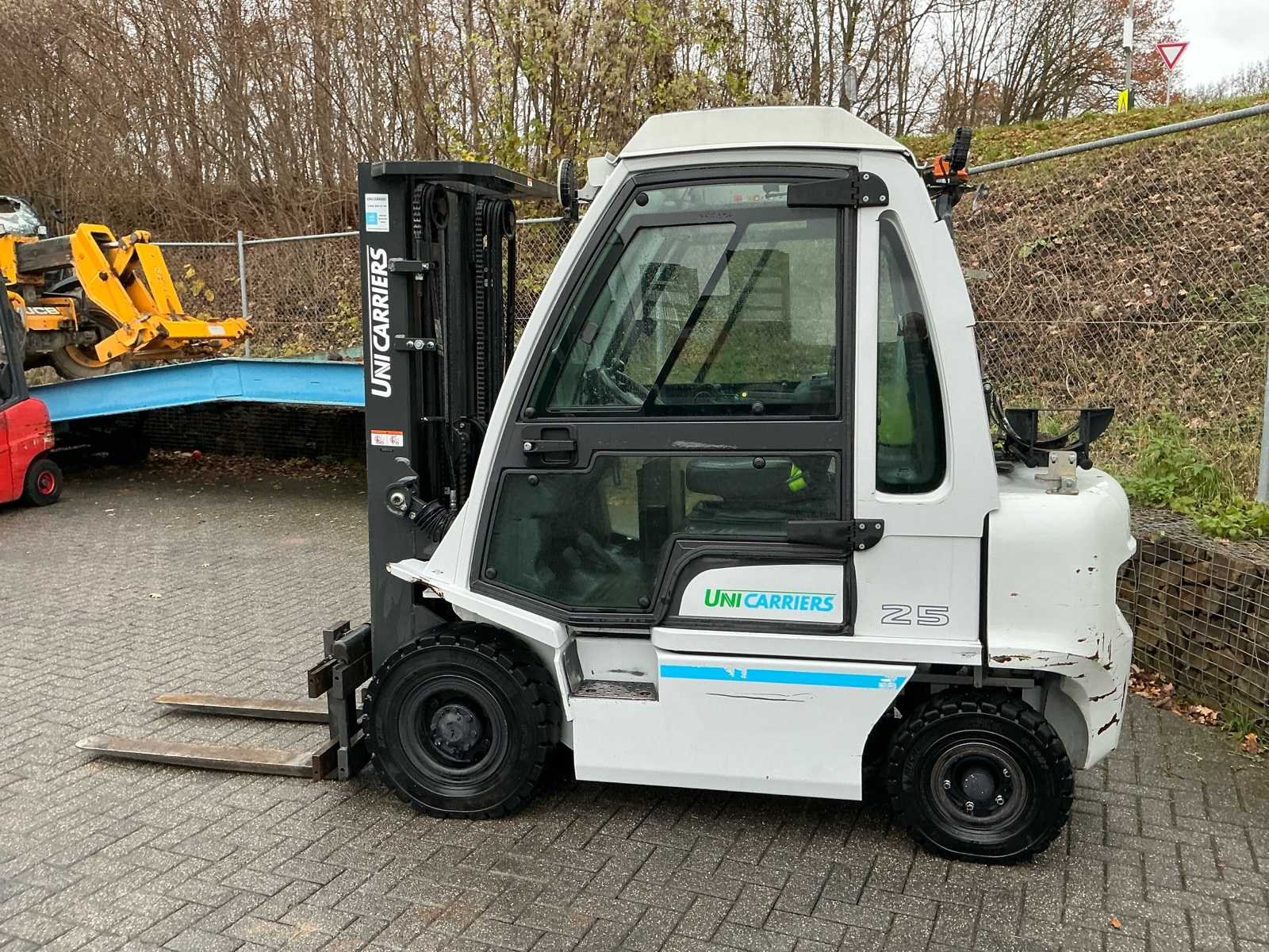Voorzien van: Savas luxe stoel, mini-lever bediening op armleuning, volrubber banden, werklampen, gesloten cabine, met schuifraam, high/low speed. No Merk: Unicarriers Type: U1D2A25LQ Bouwjaar: 2918 Serienummer: U1D2E704289 Brandstof: Lpg Mast: Triplex Soort band: Volrubber Aantal wielen: 4 Afgelezen urenstand: 1524 Side-shift: true Triple mast: true Lepellengte: 1100mm Vol rubber banden: true