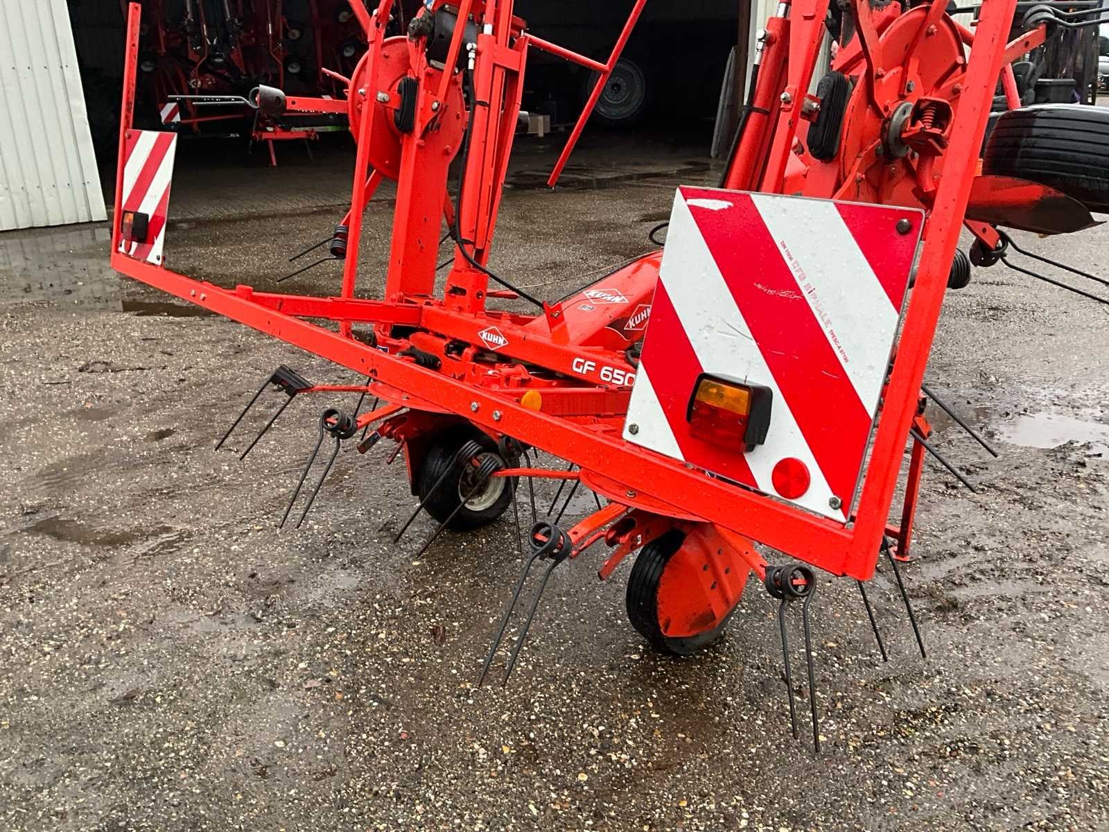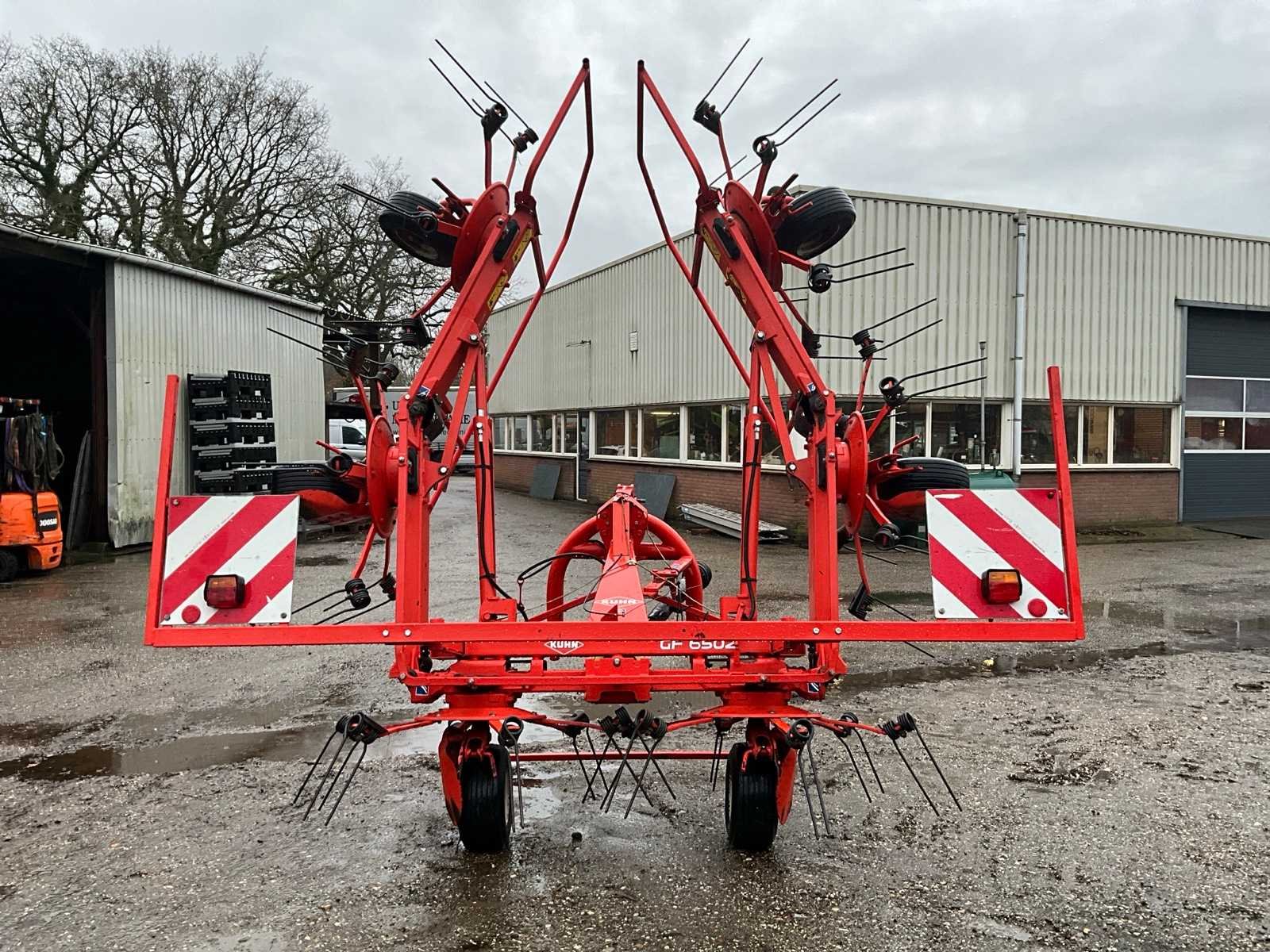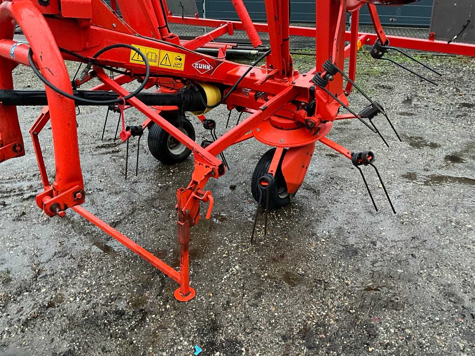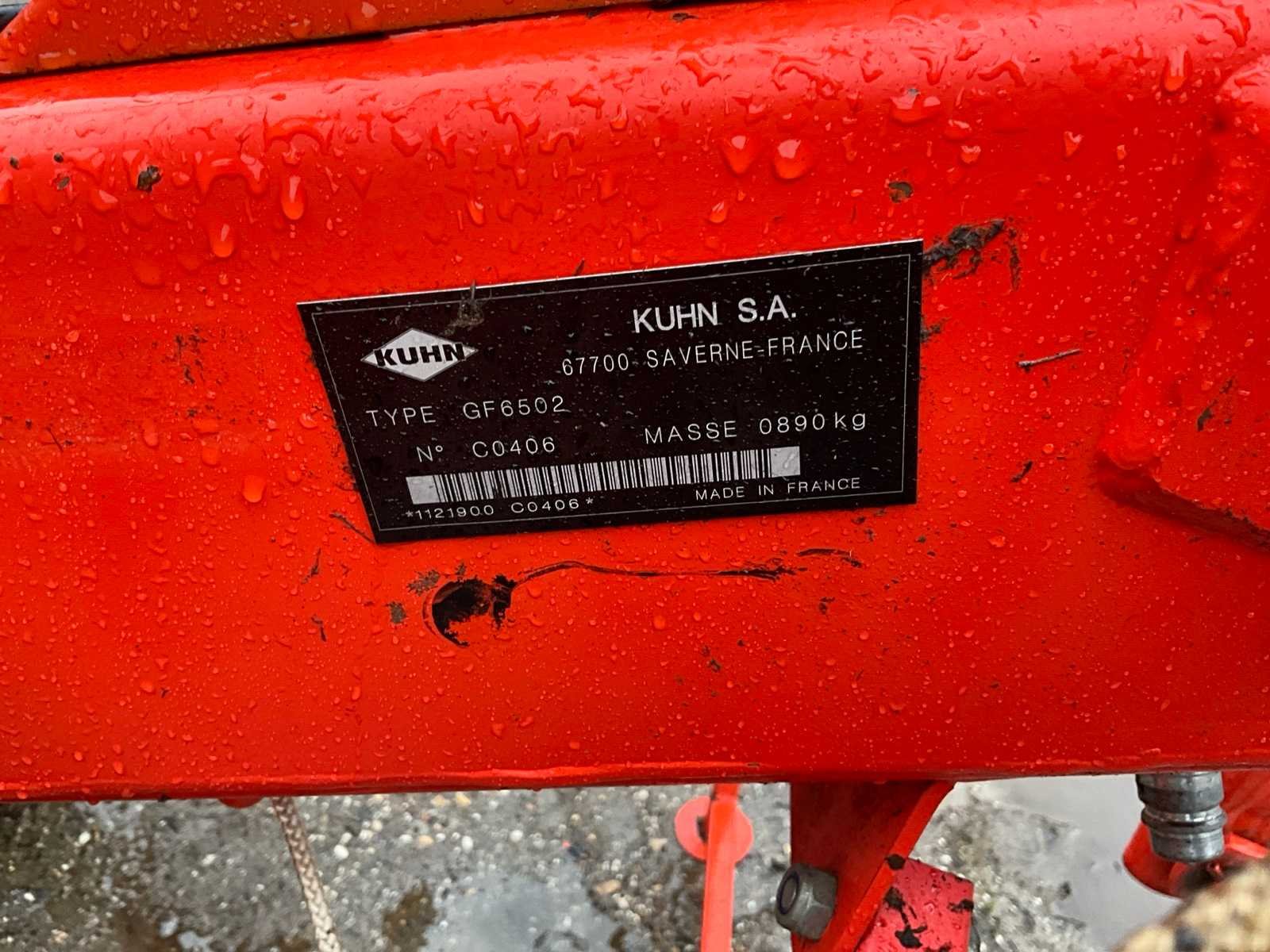 Gedragen uitvoering; Portaalbok; Hydr.opklapbaar; Naloop-inrichting; 6 elementen met elk 6 tandarmen; Mechanische schuinstelling; Verlichting met borden Nee Merk: Kuhn Type: GS 6502 Serienummer: C0406 Eigen gewicht: 890kg Werkbreedte: 6500mm