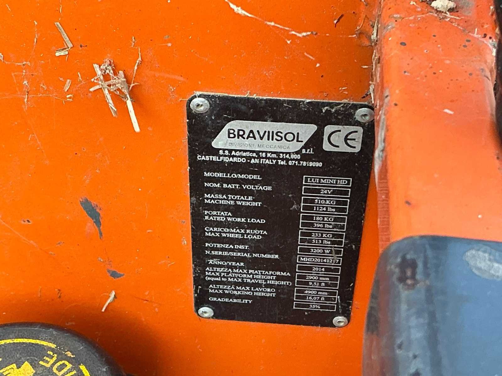 Voorzien van: Nieuw accu. De Braviisol LUI MINI HD (2014) is een zelfrijdende 24V mastlift van 510 kg met een maximale platformbelasting van 180 kg, een platformhoogte van 4,89 m en werkhoogte van ca. 6,87 m, voorzien van een 3,2 kW motor, max. wielbelasting 233 kg, 15% hellingsvermogen, compacte afmetingen geschikt voor binnengebruik en ontworpen voor één persoon met gereedschap. Nee Merk: Braviisol Type: Lui mini hd Bouwjaar: 2014 Serienummer: MHD20141217 Elektrisch: true Motorvermogen (kW): 3.2kW Schaarhoogwerker: true Werkhoogte: 6900mm Plateau afm. l: 700mm Plateau afm. b: 1650mm Platform capaciteit: 180kg Eigen gewicht: 510kg Totale afmeting L: 750mm Totale afmeting Breedte: 1080mm