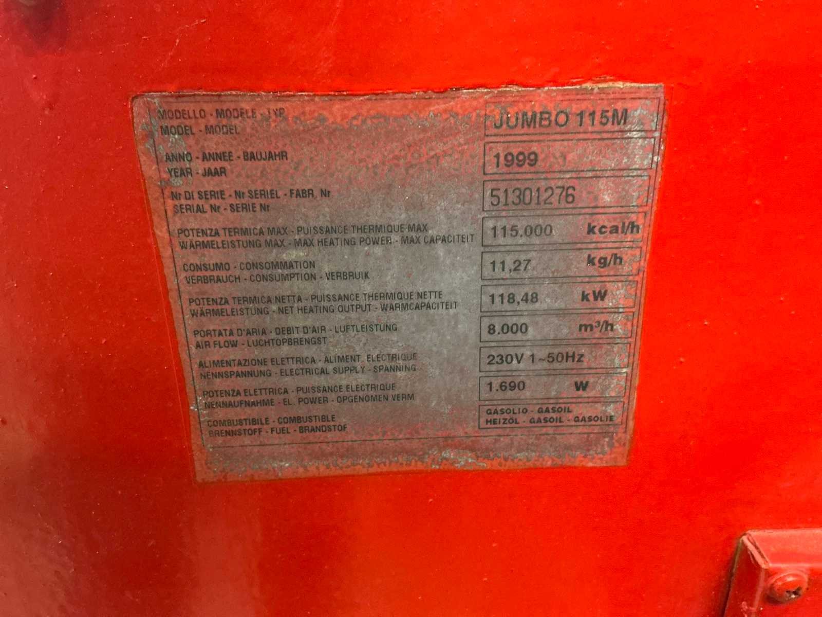 Diesel gestookte jetheater, inclusiwf 1 kar met afvoerkanalen en aanvoerslangen, afmeting heater totaal circ 1800x900x1240mm. Nee Type: Jumbo 115M Bouwjaar: 1999 Ventilator: true Thermostaat: true Aansluiting: 230V