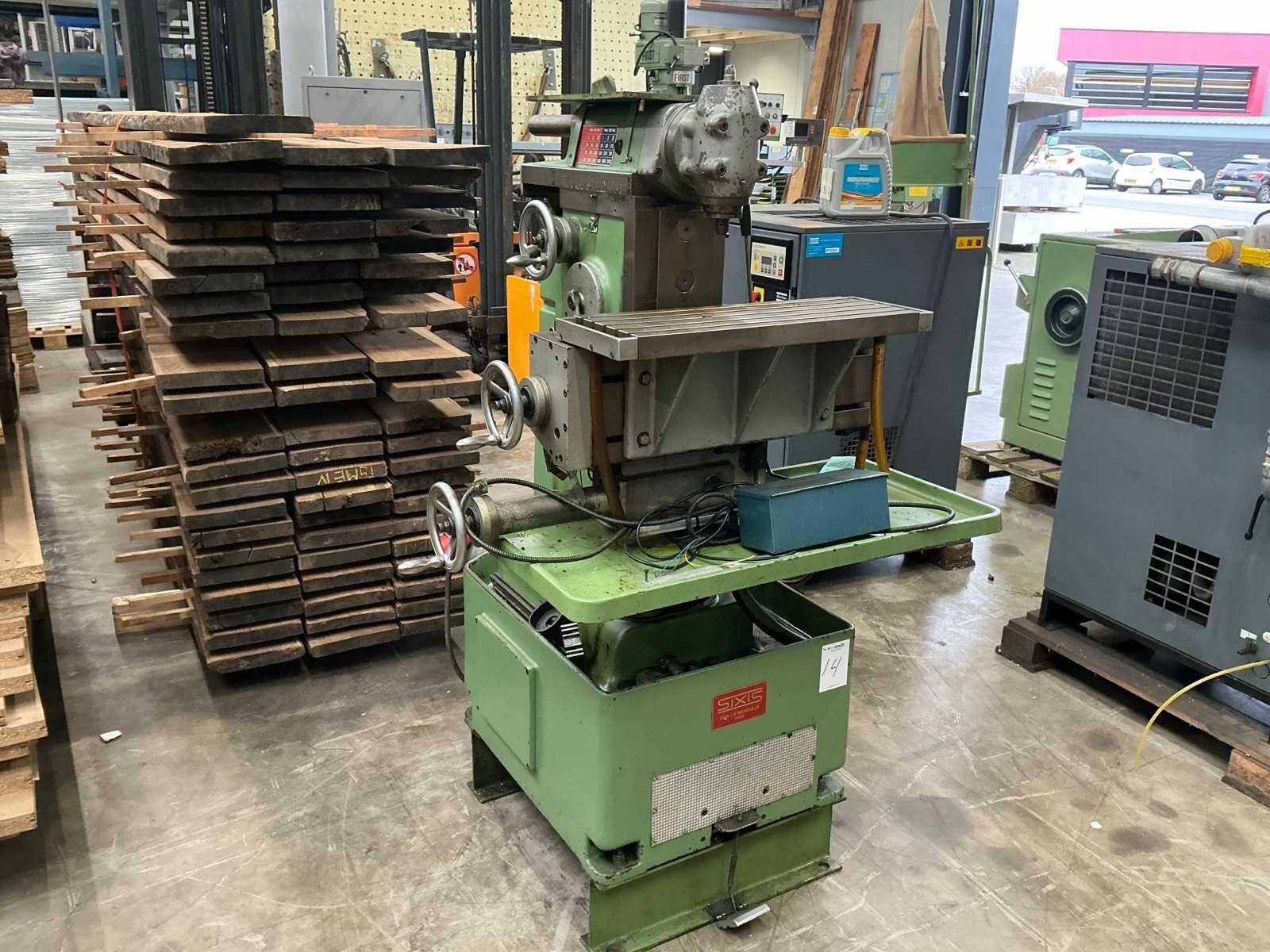 No Merk: Sixis Type: S-103 Serienummer: 1092 Aantal snelheden: 18 Snelheid van n =: 60rpm Snelheid tot n =: 2400rpm T-gleuf opspantafelafmeting L: 600mm T-gleuf opspantafelafmeting B: 220mm Aansluiting: 400V Afmeting l: 1200mm Afmeting b: 1100mm Afmeting h: 1700mm