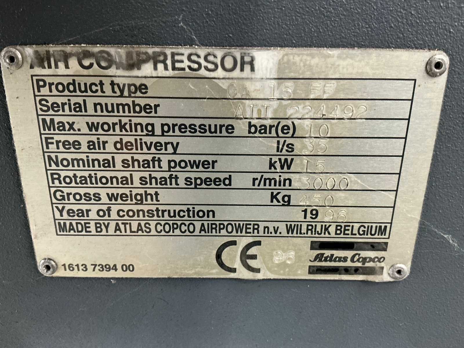 Nee Merk: Atlas Copco Type: GA15FF Bouwjaar: 1996 Serienummer: ATT224492 Capaciteit.: 10bar Luchtstroom: 2100l/min Vermogen: 15kW Aansluiting: 400V Eigen gewicht: 450kg Totale afmeting L: 1000mm Totale afmeting Breedte: 800mm Totale afmeting Hoogte: 1160mm