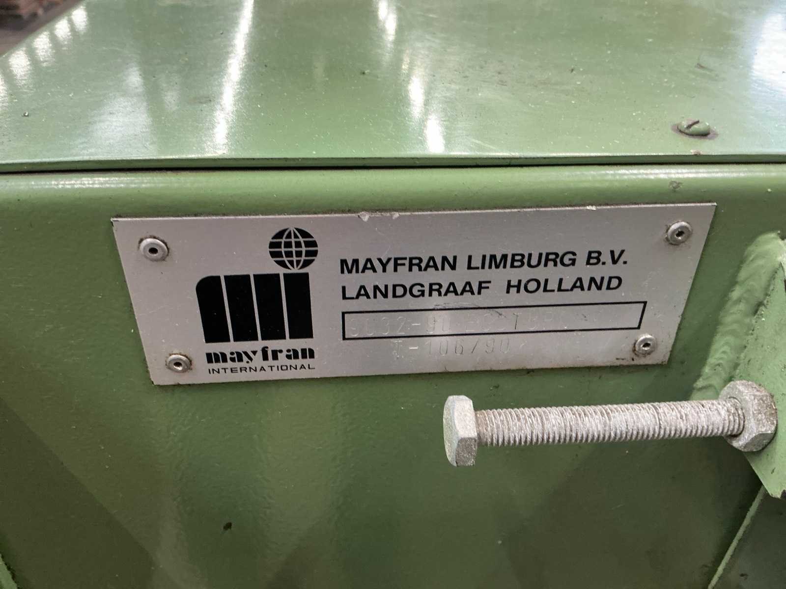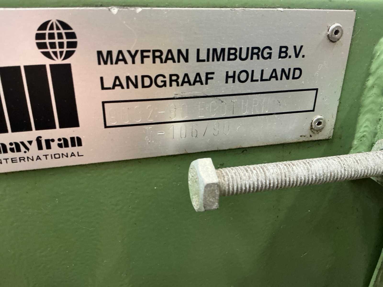 Nee Merk: Mayfran Type: 9032 90 ecoturn Bouwjaar: 1990 Serienummer: T-106 Aansluiting: 400V Totale afmeting L: 2500mm Totale afmeting Breedte: 750mm Totale afmeting Hoogte: 1200mm