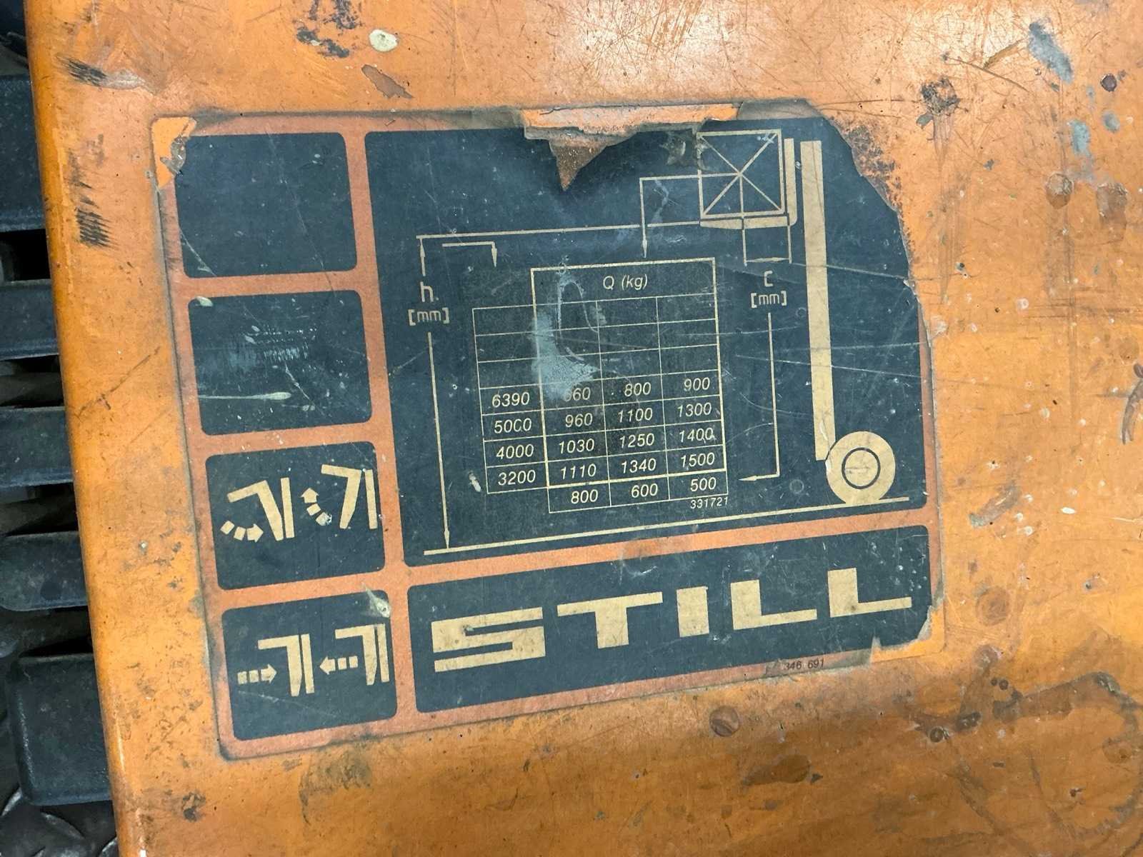 Langdurig stil gestaan, accu leeg/defect, 400Volt lader Nee Merk: Still Type: R50-15 Bouwjaar: 1992 Serienummer: 50344/14 Brandstof: Elektrisch Kenteken: Geen registratie Mast: Triple Soort band: Volrubber banden Aantal wielen: 3 Afgelezen urenstand: 3857 Accu lader: true Free-lift: true Side-shift: true Hefvermogen: 1500kg Lepellengte: 1150mm Minimale doorrijhoogte: 2460mm Totale afmeting L: 3300mm Totale afmeting Breedte: 1090mm Totale afmeting Hoogte: 2460mm