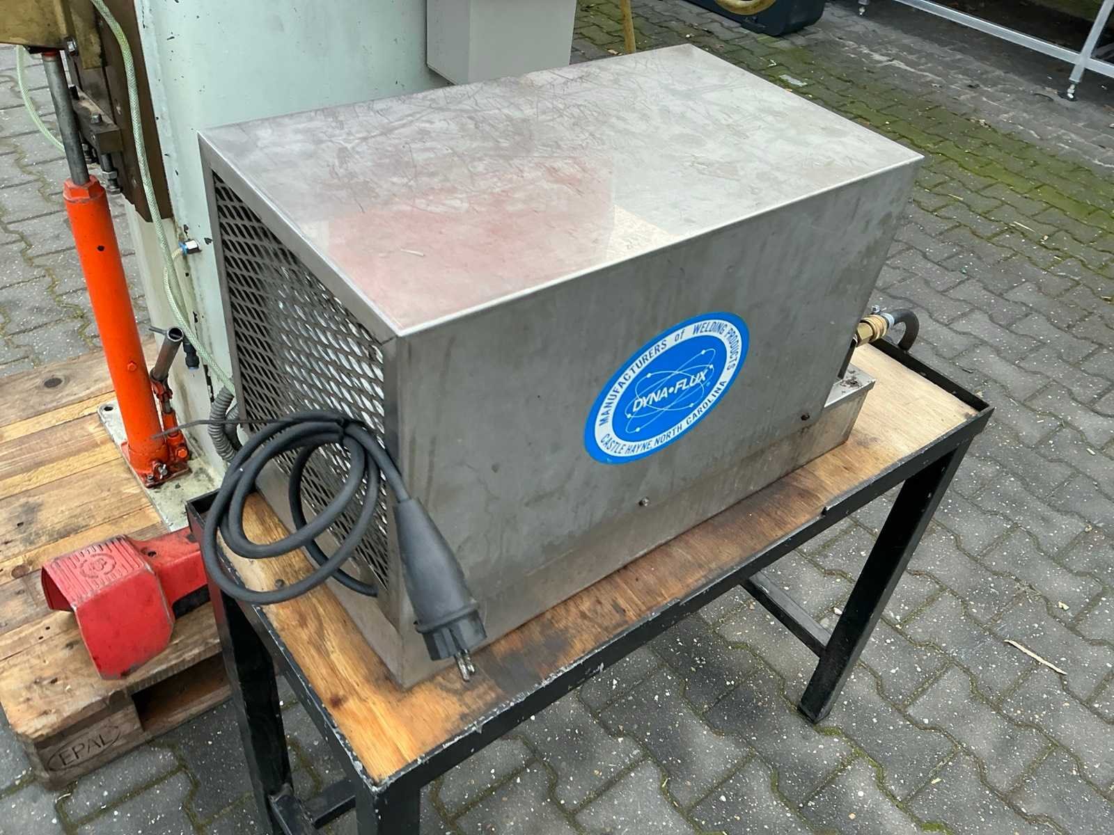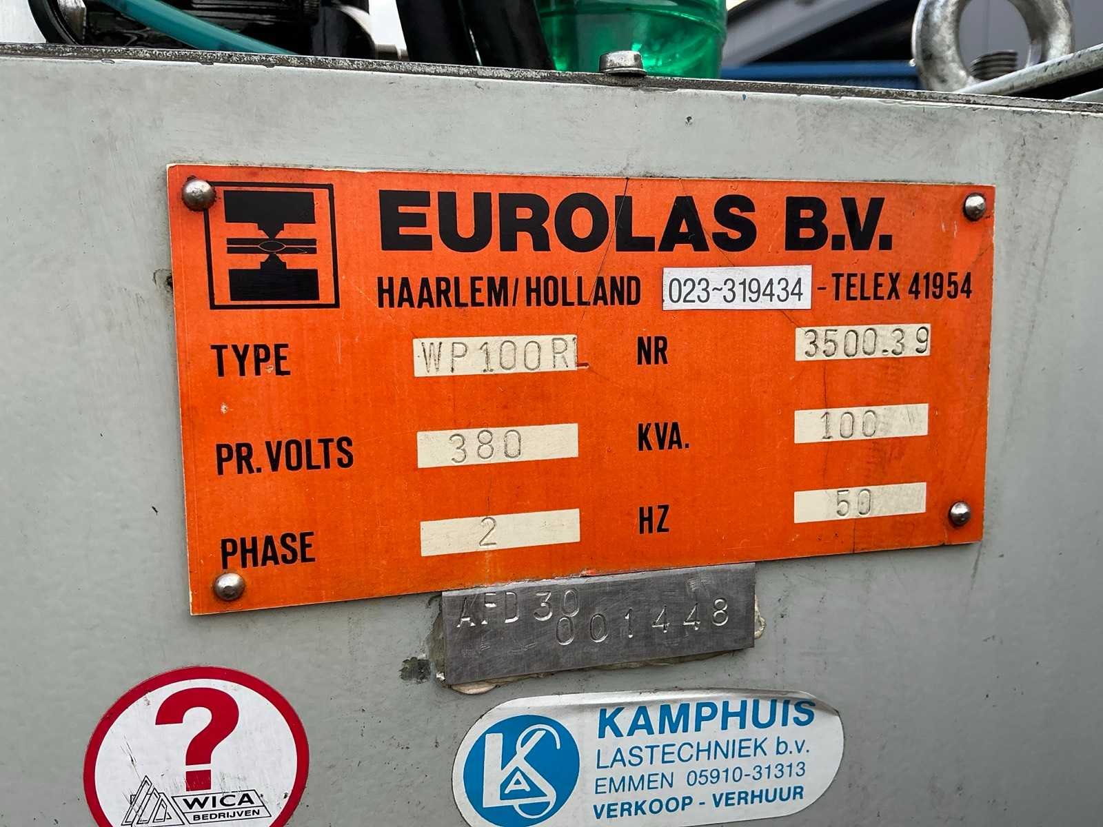 Inclusief externe Dynaflux externe waterkoeler Nee Merk: Eurolas Type: WP100RL Max. lasvermogen: 100kVA Uitlading: 600mm Aansluiting: 400V Afmeting l: 1500mm Afmeting b: 750mm Afmeting h: 2000mm