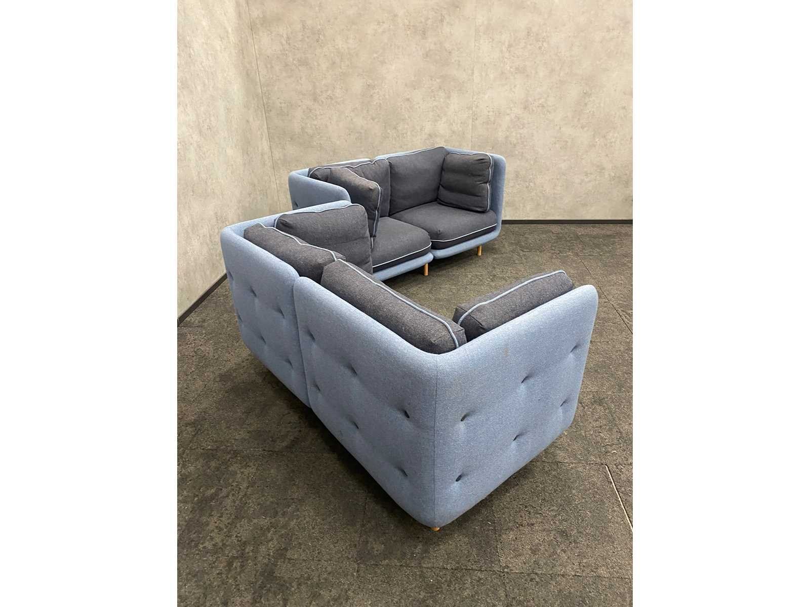 Nee Merk: 2x Ahrend Embrace Kleur: blauw Breedte: 160cm Hoogte: 90cm Zithoogte: 45cm Diepte: 80cm Materiaal: textiel, hout