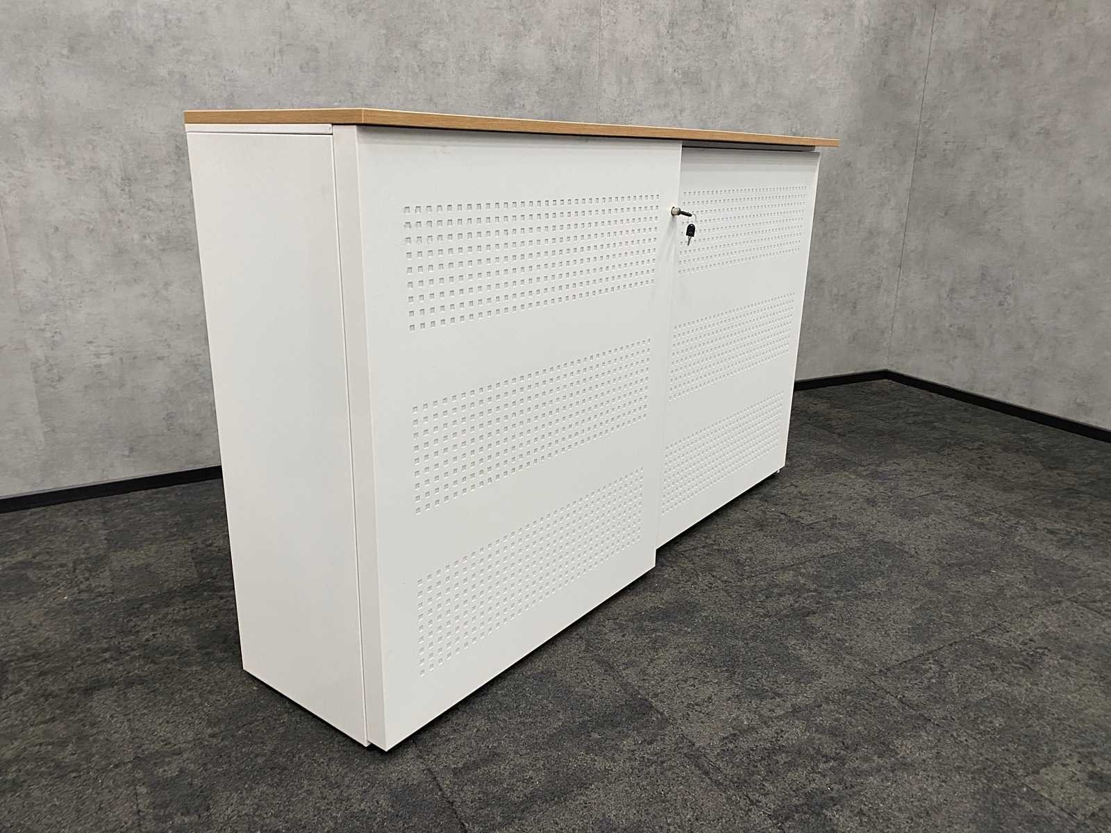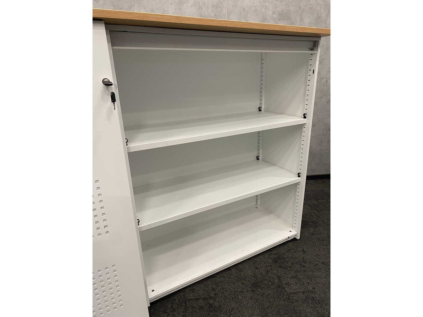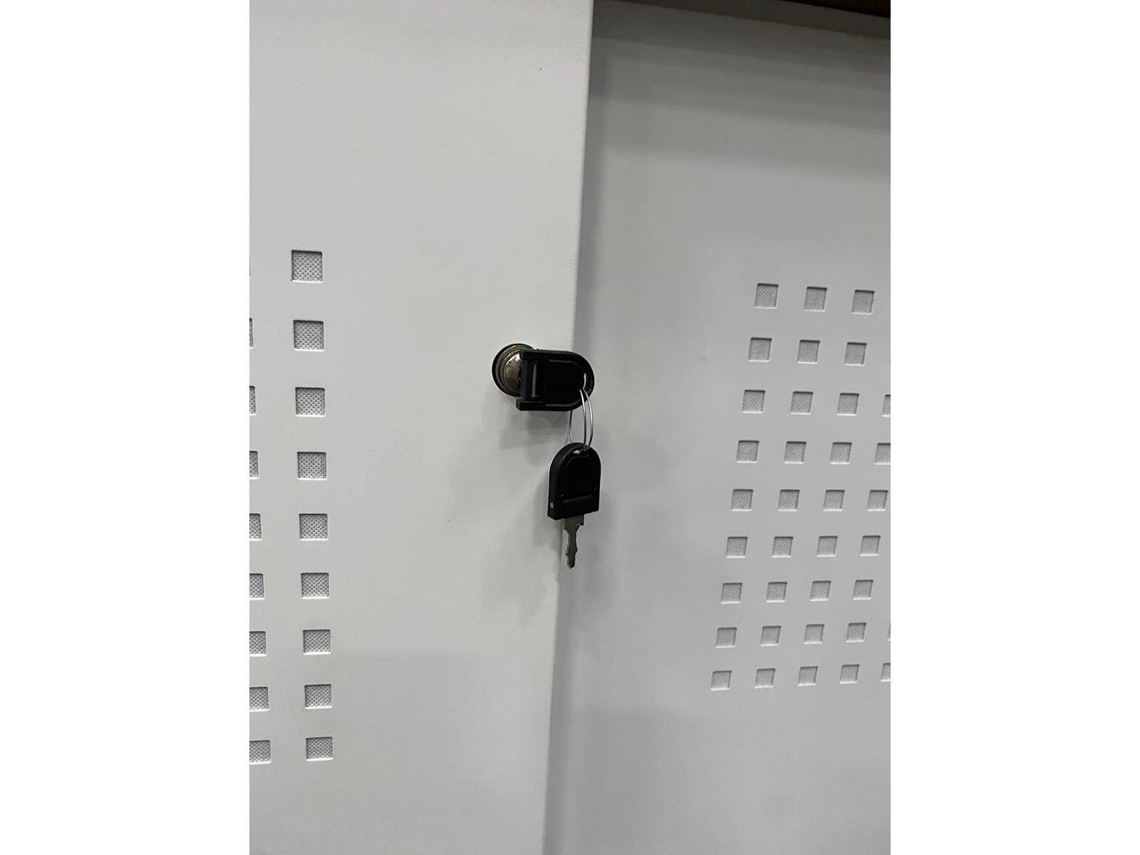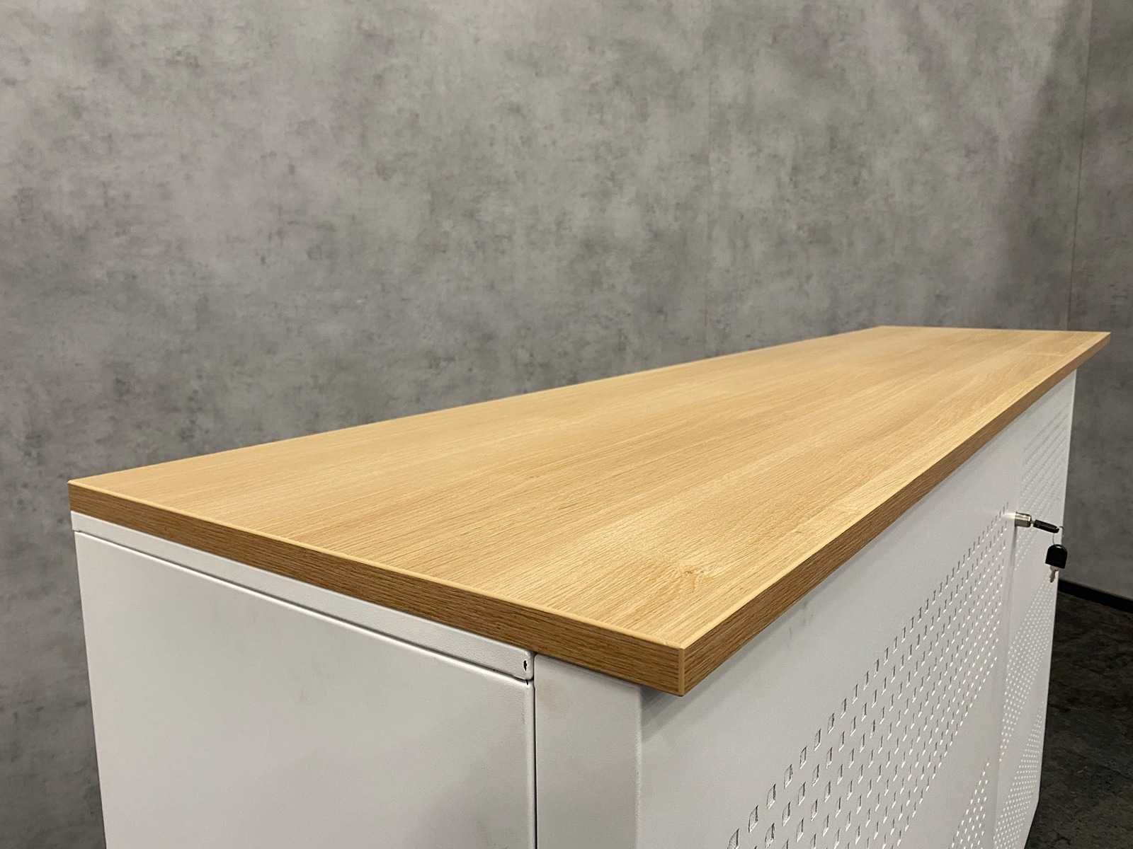 Met sleutel, v.v. 4 verstelbare legborden, houtlook melamine topblad Nee Kleur: wit, eiken Breedte: 200cm Hoogte: 120cm Diepte: 50cm Materiaal: metaal, melamine