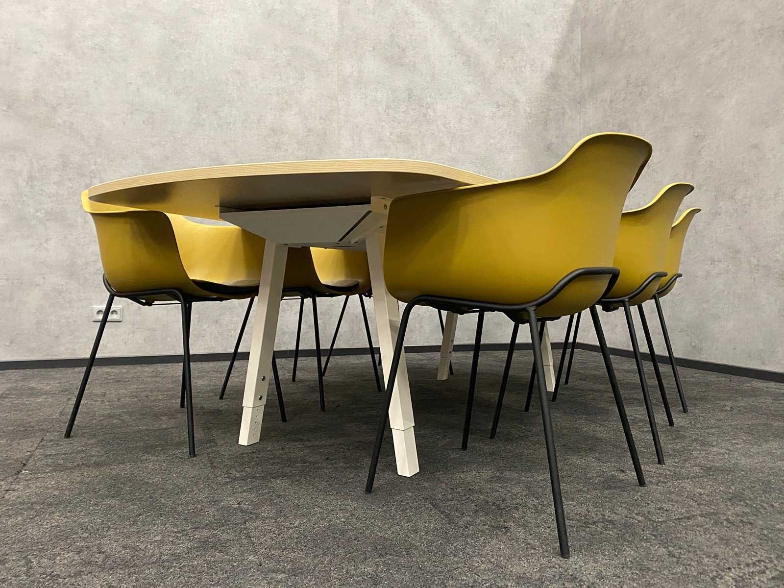 Kavel bestaande uit 1x Vitra Joyn design tafel v.v. nieuw melamine eikenlook tafelblad, en wit in hoogte instelbaar stalen frame. ---- 6x Kave design stoel Nee Merk: Vitra Joyn/ Kave Kleur: wit, eiken, zwart, oker