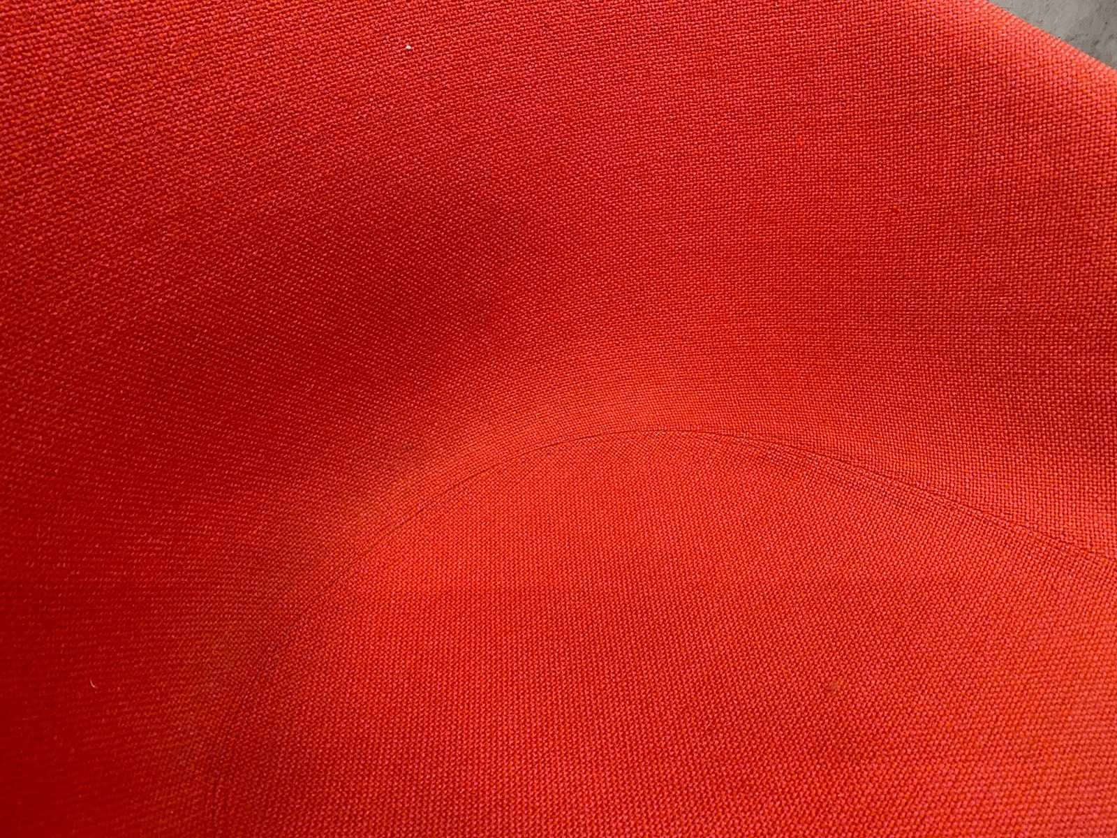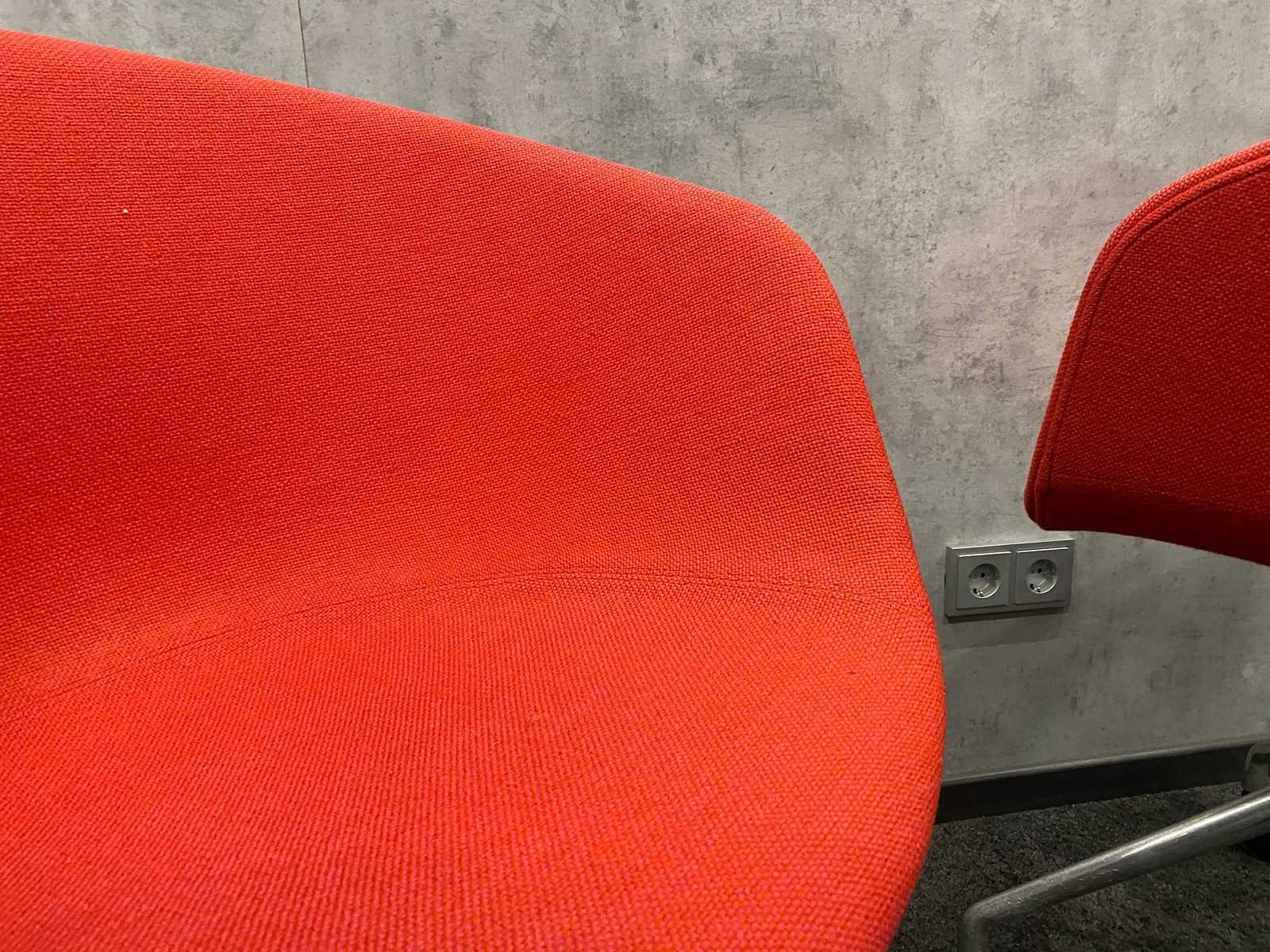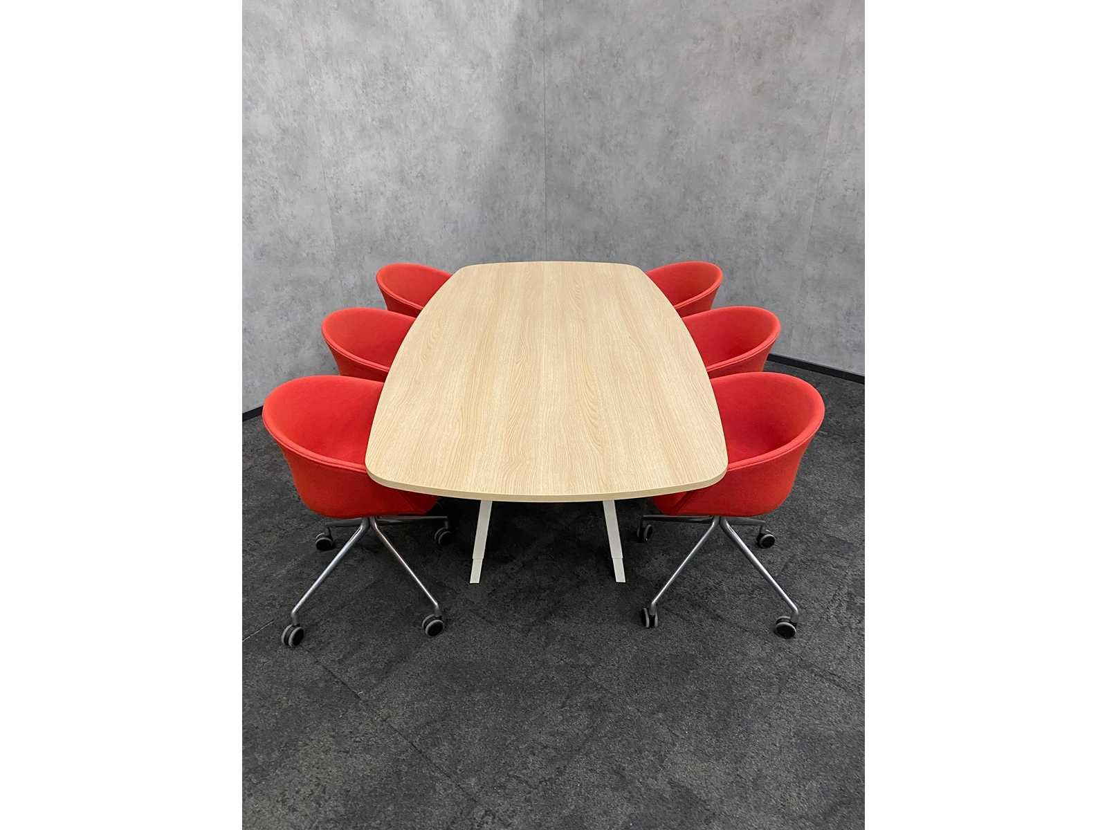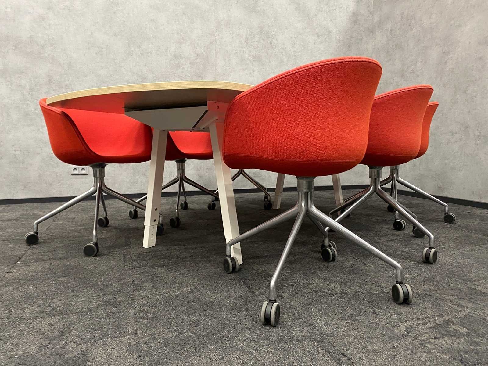 Kavel bestaande uit 1x Vitra Joyn design tafel v.v. nieuw melamine eikenlook tafelblad, en wit in hoogte instelbaar stalen frame. ---- 6x HAY verrijdbare vergader fauteuil Nee Merk: Vitra Joyn/ HAY Kleur: wit, eiken, chroom, rood