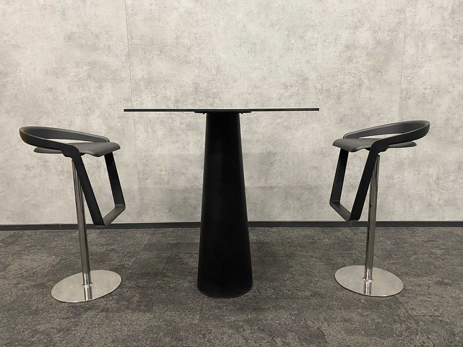 Kavel bestaande uit 2x Johanson design Piano barkruk v.v. zwart polyurethaan zitting en verchroomd onderstel v.v. voetensteun -- 1x Moooi container design tafel van Marcel Wanders. Nee Merk: Moooi/ Johanson Kleur: zwart, chroom, wit Lengte: 80cm Breedte: 80cm Hoogte: 99cm Zithoogte: 78