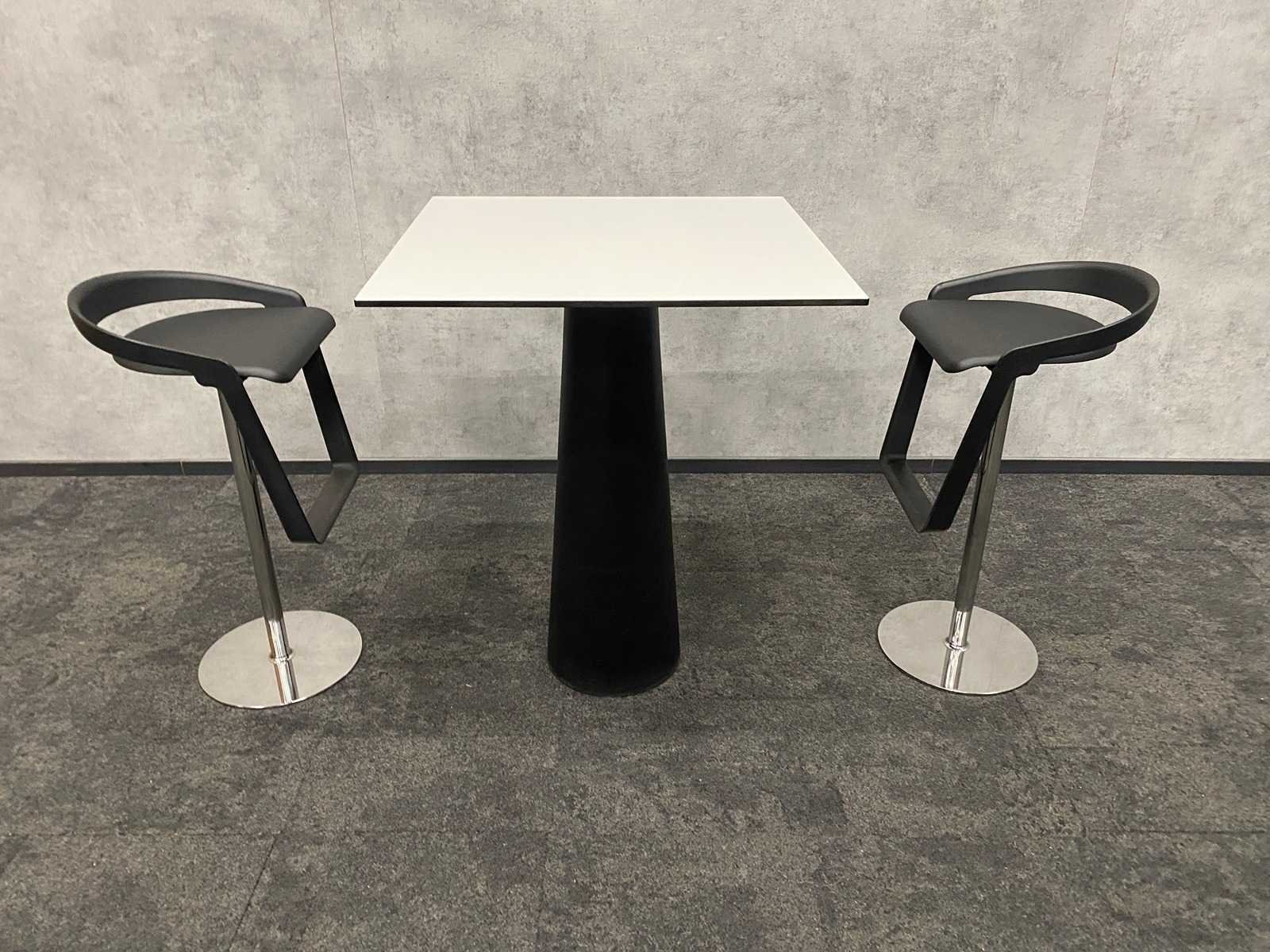 Kavel bestaande uit 2x Johanson design Piano barkruk v.v. zwart polyurethaan zitting en verchroomd onderstel v.v. voetensteun -- 1x Moooi container design tafel van Marcel Wanders. Nee Merk: Moooi/ Johanson Kleur: zwart, chroom, wit Lengte: 80cm Breedte: 80cm Hoogte: 99cm Zithoogte: 78