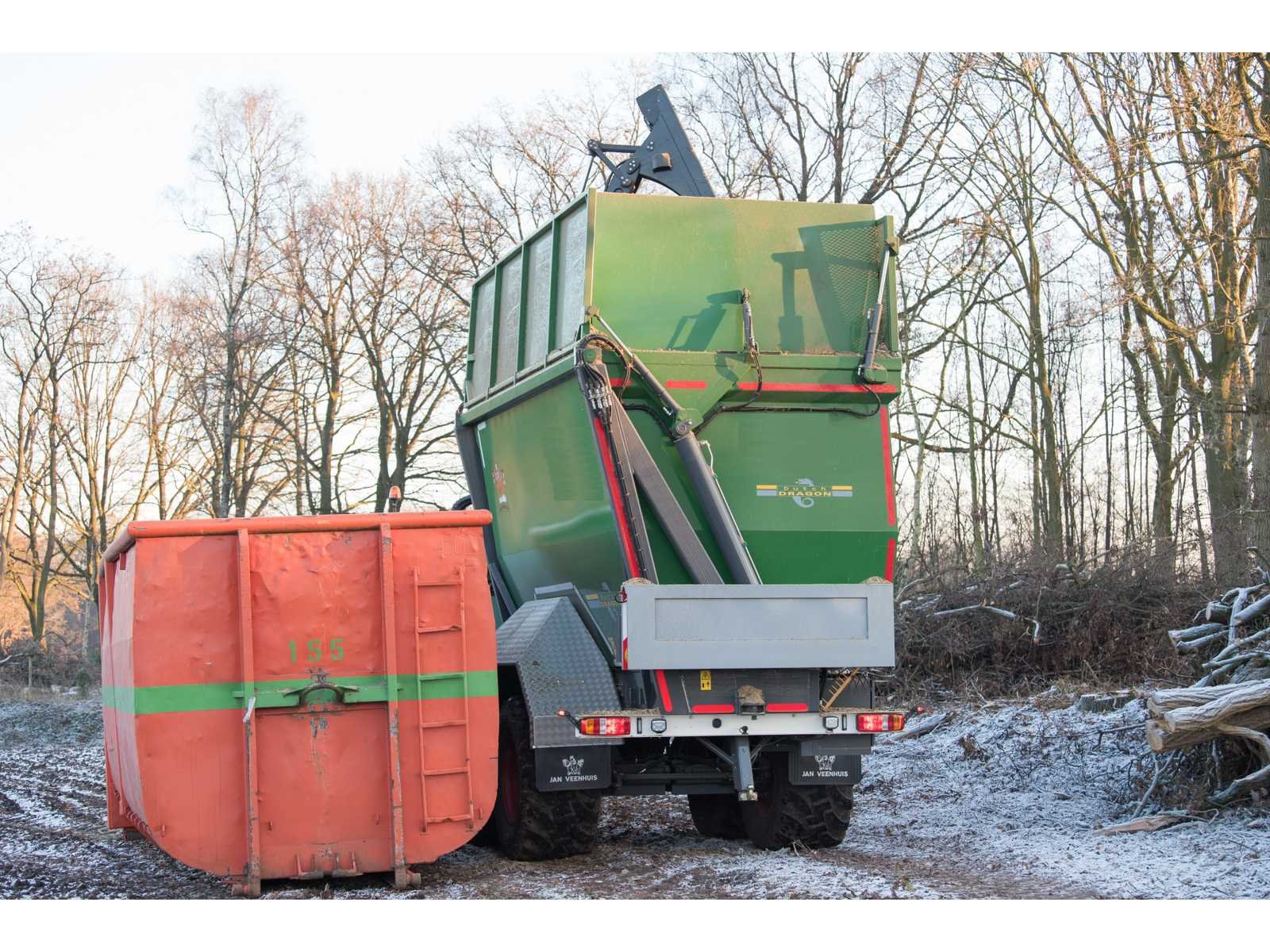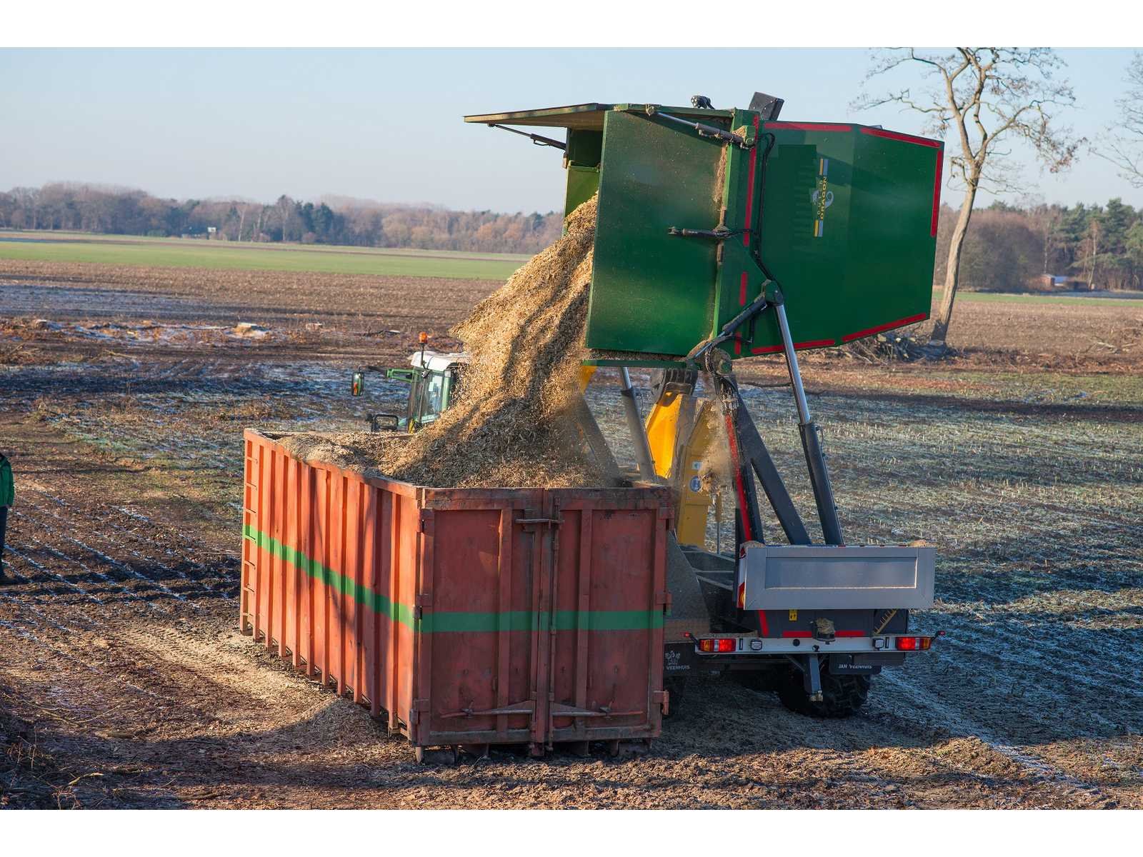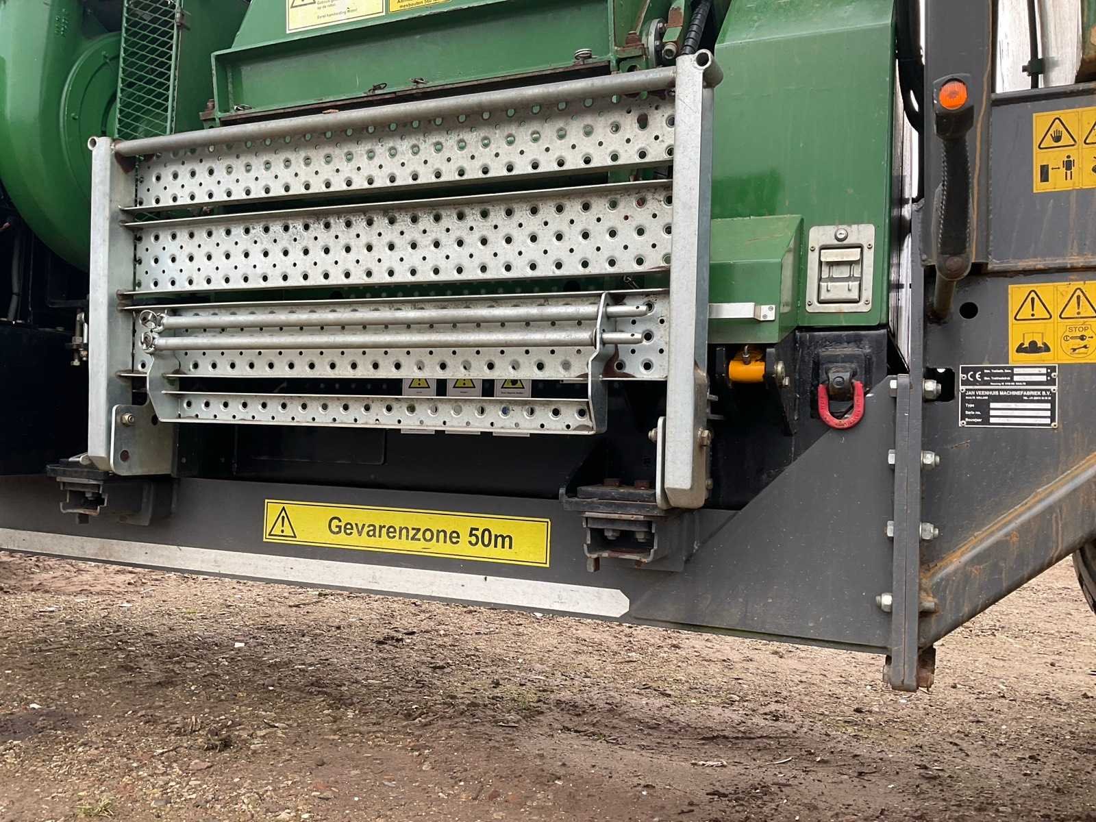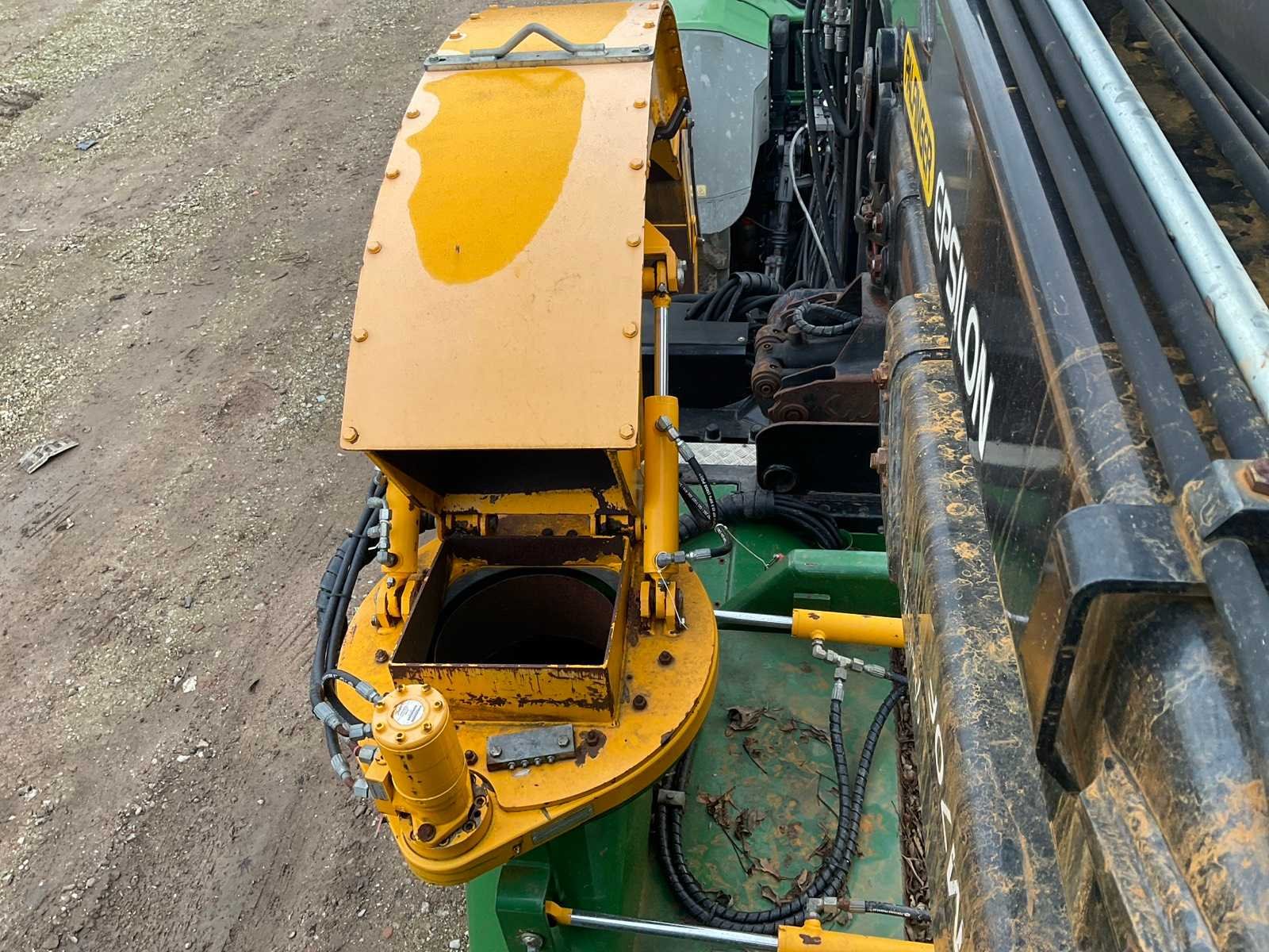 Draaiuren chipper 1048 uur; draaiuren kraan 625 uur; versnipperaar met gesloten 2-messen trommel die direct hakt en uitwerpt; geen werprad of extra vijzels; invoerrollen met interne hydraulische aandrijving; traploos instelbare invoersnelheid 0-60m/min.; non stress; luchtondersteuning; geintegreerd onderhoudsplatform; hydraulisch bedienbare uitwerpbuis diameter 33cm.; 320 graden draaibaar; invoeropening 900x520 mm.; drumdiameter 800 mm.; maximaal te chippen 50 cm.; snelheid van de hakseltrommel 1000 rpm./min.; computersysteem met touchscreen; de houtversnipperaar werkt via de bedieningskast in de trekkercabine; benodigd vermogen 150-350 pk. (110-275 KW.); eigen hydraulisch systeem; verwisselbare zeven; versnipperaar staat op een JVHK 14000 hoogkieper onderstel.; lichtgevend; bunker 22 m3 inhoud; kiphoogte 3.30 mtr.; tandemonderstel voor langzaam verkeer 40 km/h.; met gestuurde achteras; banden alliance 650/55R26.5; bediening hoogkipper vanuit trekker cabine via hydrauliek trekker; 2 stuks geïntegreerde gereedschapskisten geïnstalleerd; 2 stuks geïntegreerde gereedschapskisten geïnstalleerd; 2 stuks camera’s voor zicht naar achteren en uitkiepen van de bunker via de trekker monitor te zien; actieraam op achterzijde; flitsers op de achterzijde; werklampen op de achterzijde; voorzien van eigen kenteken; Palfinger Epsilon M70F kraan met een hultdins supergrip grijper met rotator; 2x telescopisch uitschuifbaar met een bereik van 8,6 meter; 2 hydraulische uitschuifbare steunpoten met bediening vanuit de trekkercabine; kraan werkt via trekkerhydrauliek; incl. Bedrijfshandleiding en reservemessen. No Merk: Dutch dragon Type: Dutch dragon EC 9045 Bouwjaar: 2016