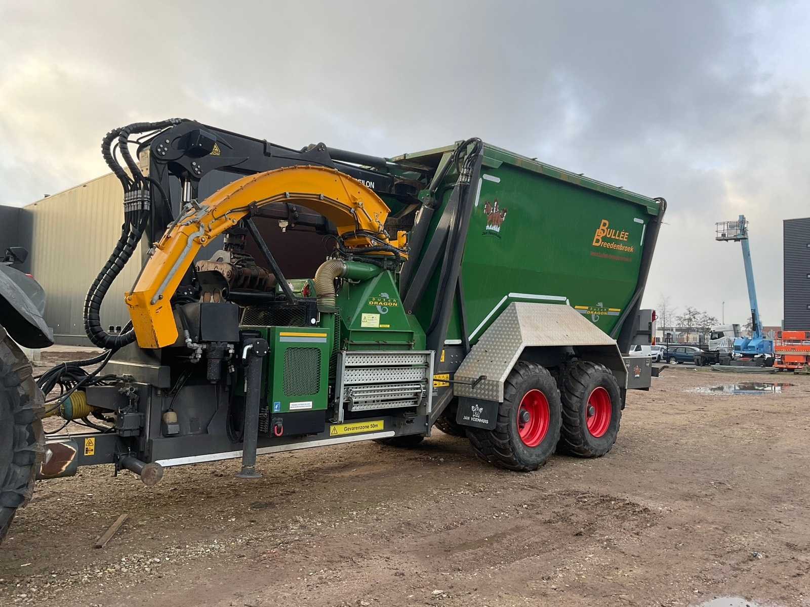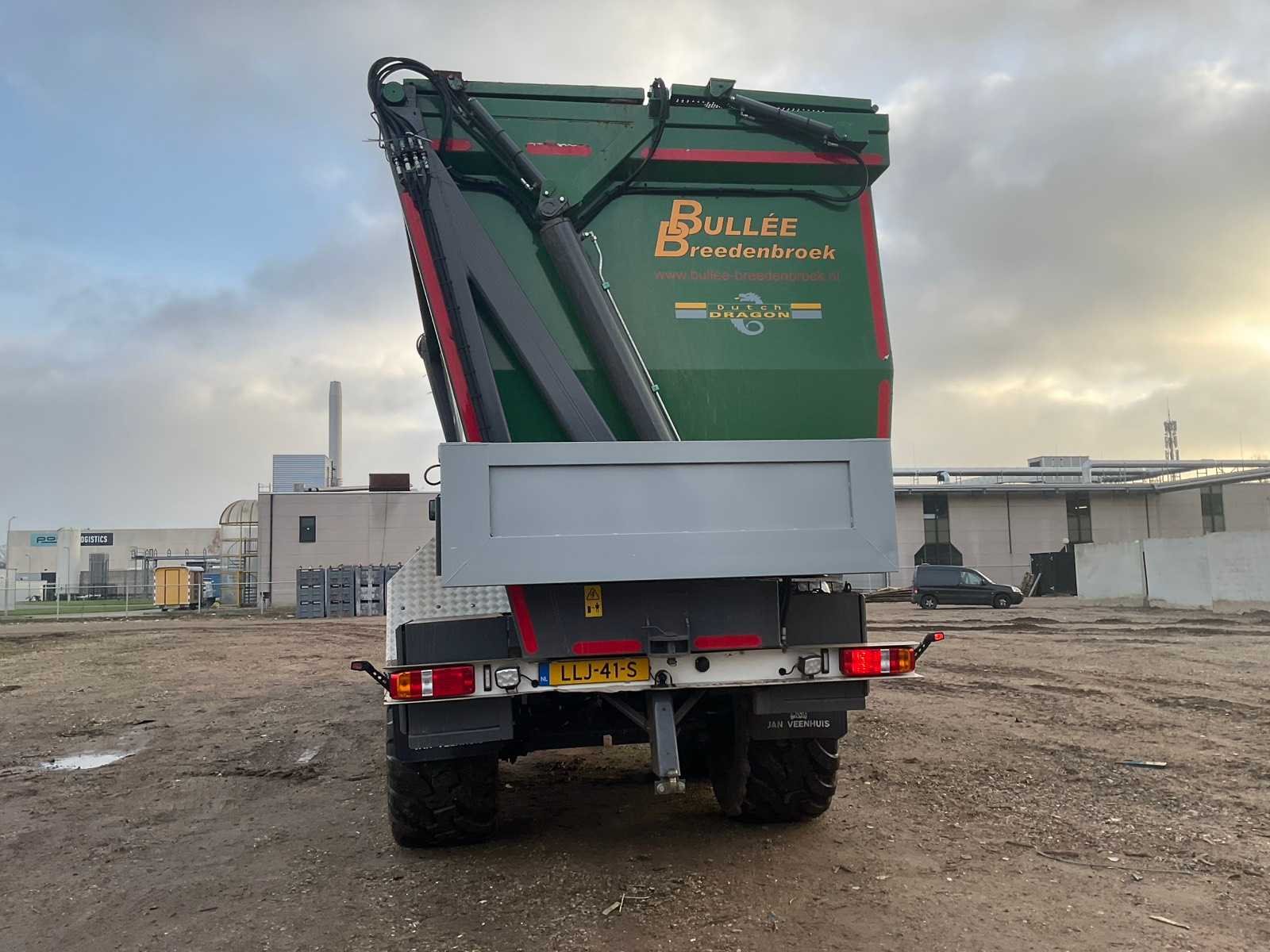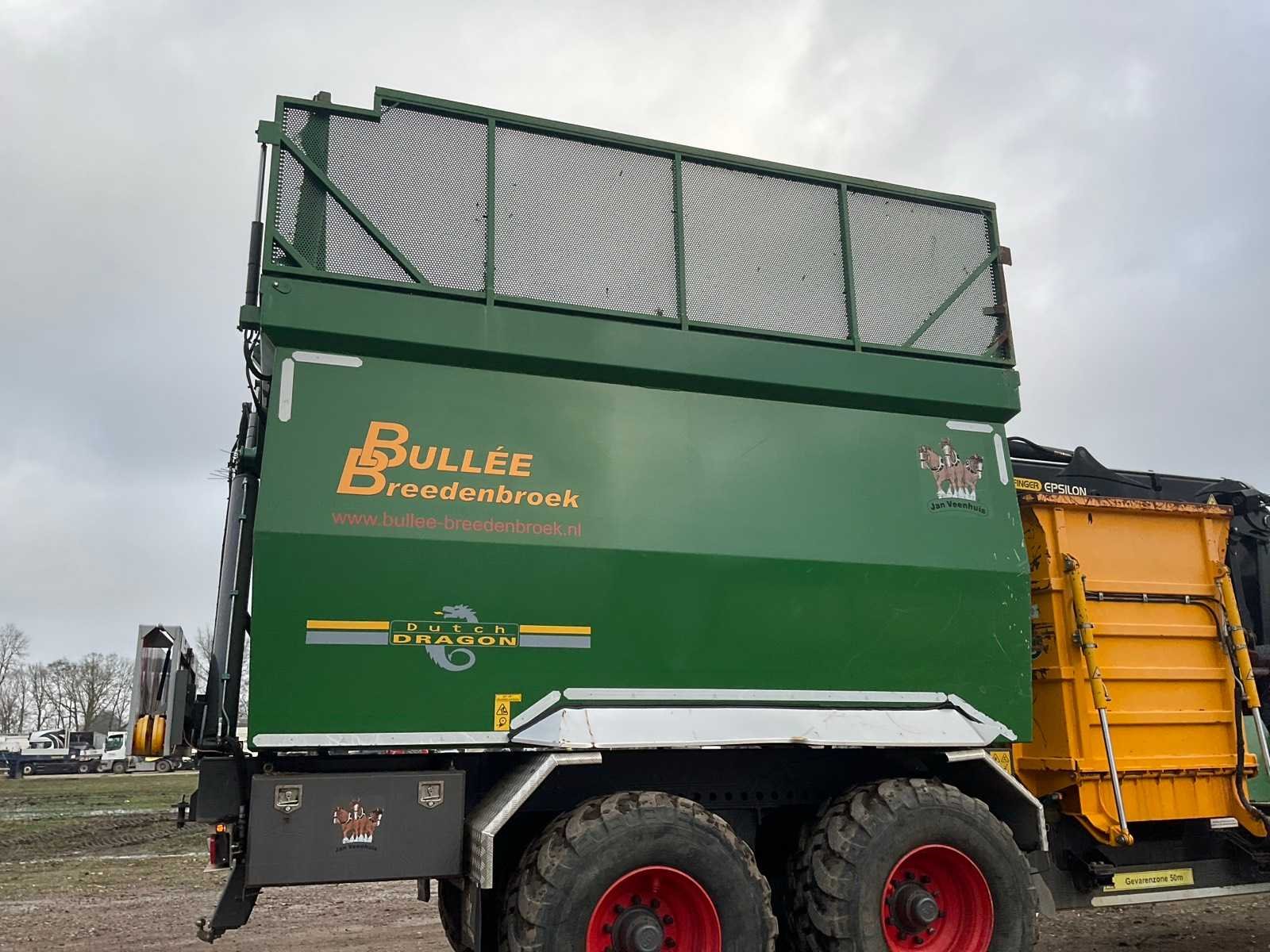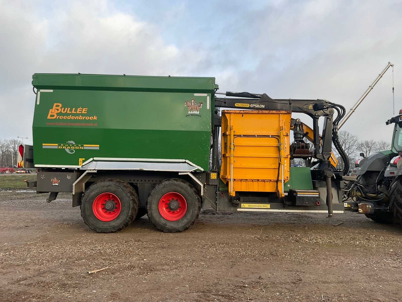 Draaiuren chipper 1048 uur; draaiuren kraan 625 uur; versnipperaar met gesloten 2-messen trommel die direct hakt en uitwerpt; geen werprad of extra vijzels; invoerrollen met interne hydraulische aandrijving; traploos instelbare invoersnelheid 0-60m/min.; non stress; luchtondersteuning; geintegreerd onderhoudsplatform; hydraulisch bedienbare uitwerpbuis diameter 33cm.; 320 graden draaibaar; invoeropening 900x520 mm.; drumdiameter 800 mm.; maximaal te chippen 50 cm.; snelheid van de hakseltrommel 1000 rpm./min.; computersysteem met touchscreen; de houtversnipperaar werkt via de bedieningskast in de trekkercabine; benodigd vermogen 150-350 pk. (110-275 KW.); eigen hydraulisch systeem; verwisselbare zeven; versnipperaar staat op een JVHK 14000 hoogkieper onderstel.; lichtgevend; bunker 22 m3 inhoud; kiphoogte 3.30 mtr.; tandemonderstel voor langzaam verkeer 40 km/h.; met gestuurde achteras; banden alliance 650/55R26.5; bediening hoogkipper vanuit trekker cabine via hydrauliek trekker; 2 stuks geïntegreerde gereedschapskisten geïnstalleerd; 2 stuks geïntegreerde gereedschapskisten geïnstalleerd; 2 stuks camera’s voor zicht naar achteren en uitkiepen van de bunker via de trekker monitor te zien; actieraam op achterzijde; flitsers op de achterzijde; werklampen op de achterzijde; voorzien van eigen kenteken; Palfinger Epsilon M70F kraan met een hultdins supergrip grijper met rotator; 2x telescopisch uitschuifbaar met een bereik van 8,6 meter; 2 hydraulische uitschuifbare steunpoten met bediening vanuit de trekkercabine; kraan werkt via trekkerhydrauliek; incl. Bedrijfshandleiding en reservemessen. No Merk: Dutch dragon Type: Dutch dragon EC 9045 Bouwjaar: 2016