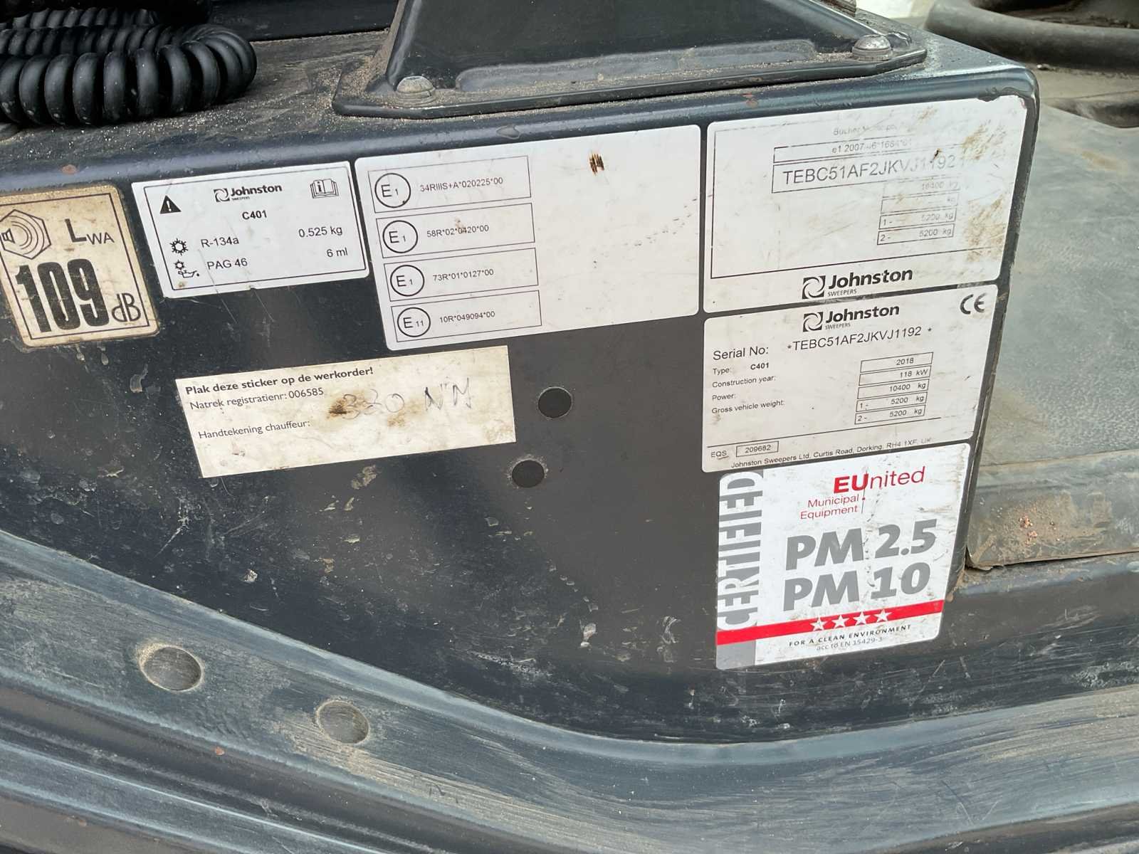 Euro 6, Beweegbare kantelborstel voorzijde met sproeisysteem, 4 cilinder FPT turbodiesel motor 2x kantelborstel, Hogedruk spuit, Hydraulisch kiepende opvangbak; inclusief nieuwe borstels Nee Merk: Johnston Type: C401 Bouwjaar: 2018 Serienummer: TEBC51AF2JKVJ1192 Eigen gewicht: 6610kg
