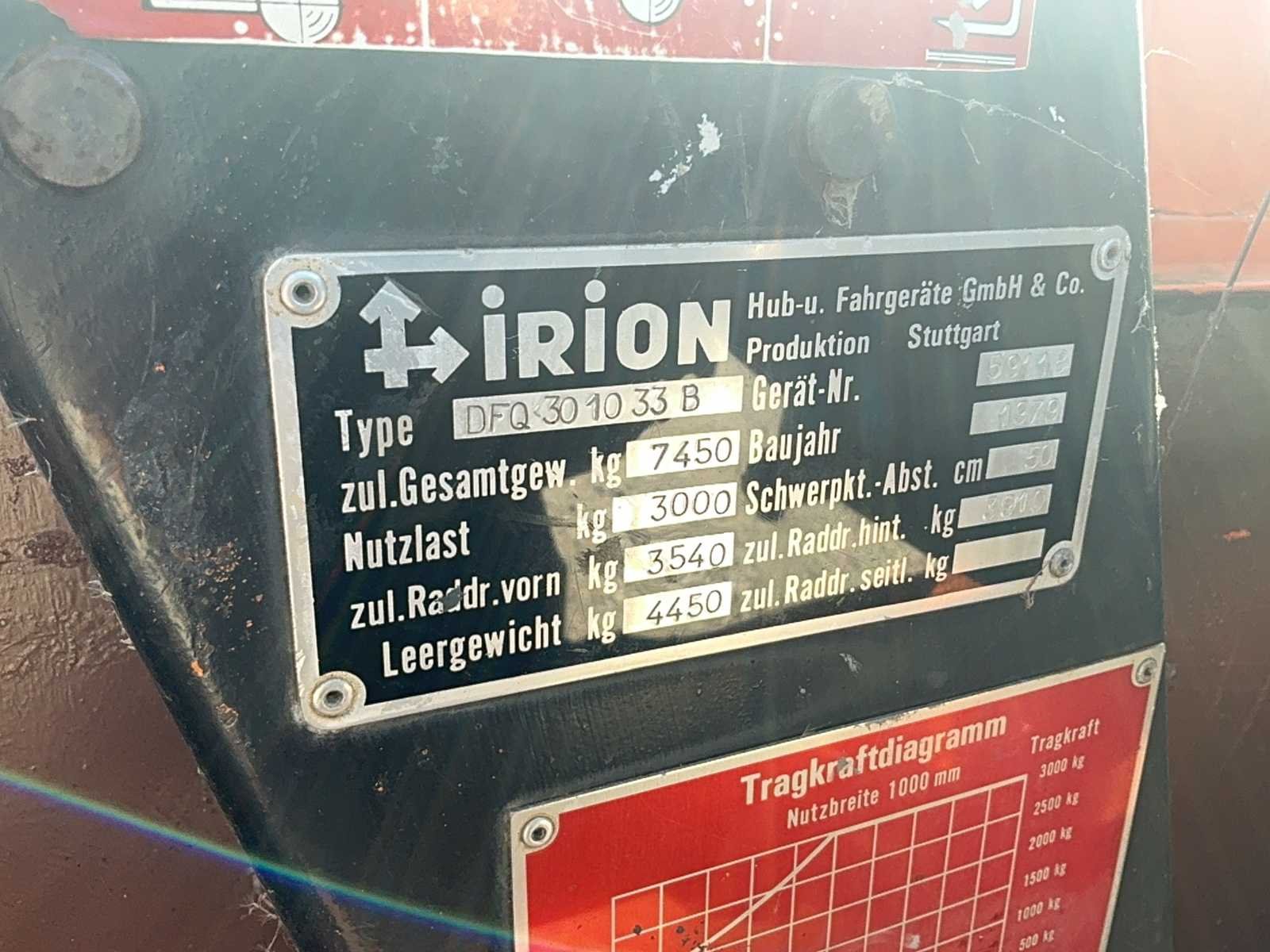 Nee Merk: Irion Type: DFQ 30 10 33 B Bouwjaar: 1979 Serienummer: 59118 Diesel: true Hefvermogen: 3000kg Lepellengte: 1000mm Afgelezen urenstand: 2963 Totale afmeting L: 4100mm Totale afmeting Breedte: 1700mm Totale afmeting Hoogte: 2600mm