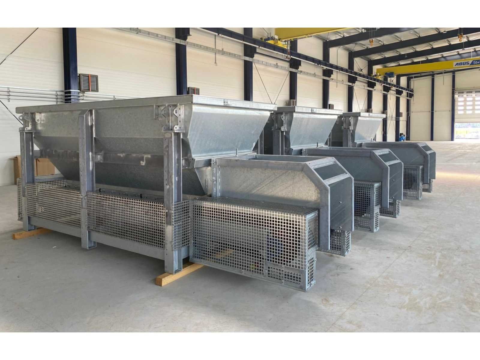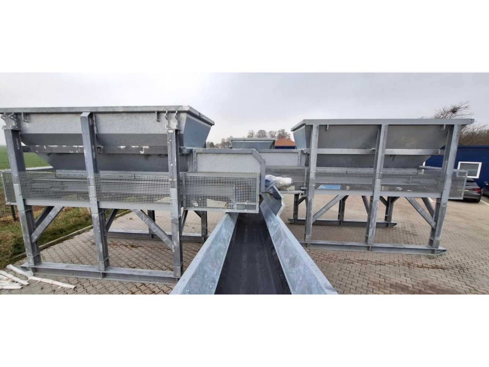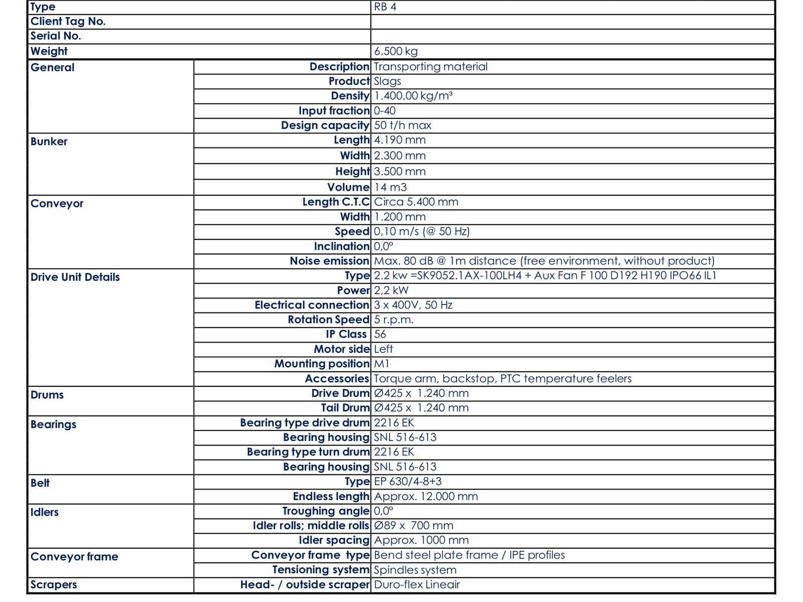 Betreft nieuwe Bunker 1 van 3 stuks; transportband aandrijving capaciteit 50 t/h; Voorraad volume 14m3; Nee Type: RB4 Vermogen: 2.2kW Eigen gewicht: 6500kg Totale afmeting L: 5400mm Totale afmeting Breedte: 2300mm Totale afmeting Hoogte: 3500mm