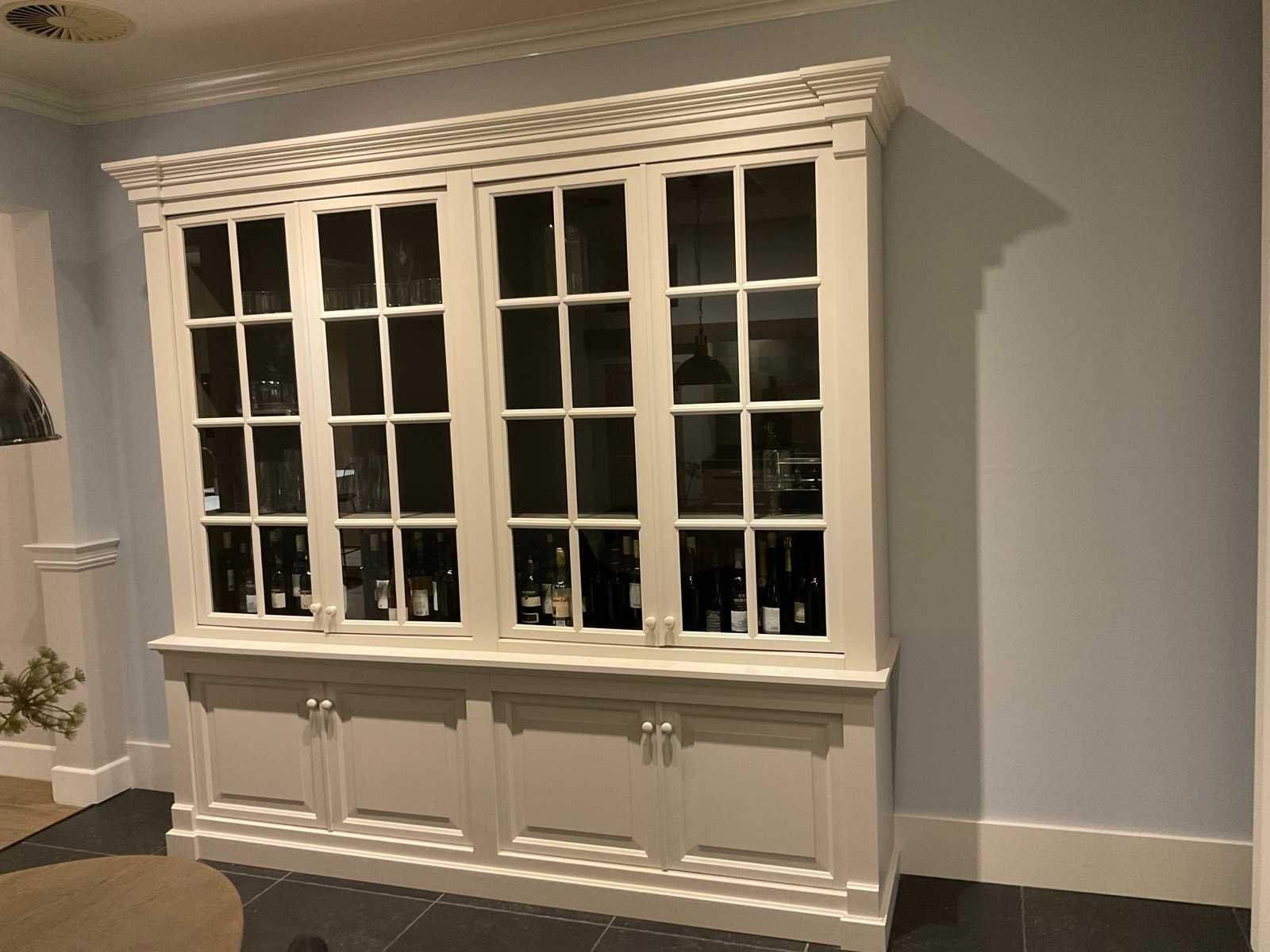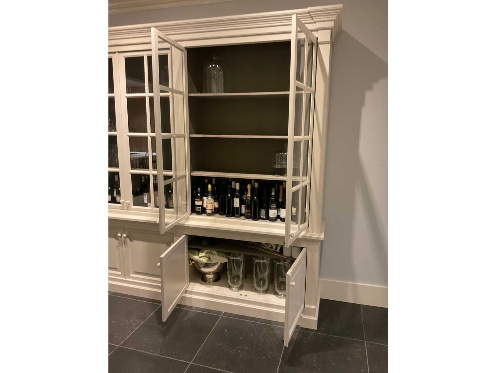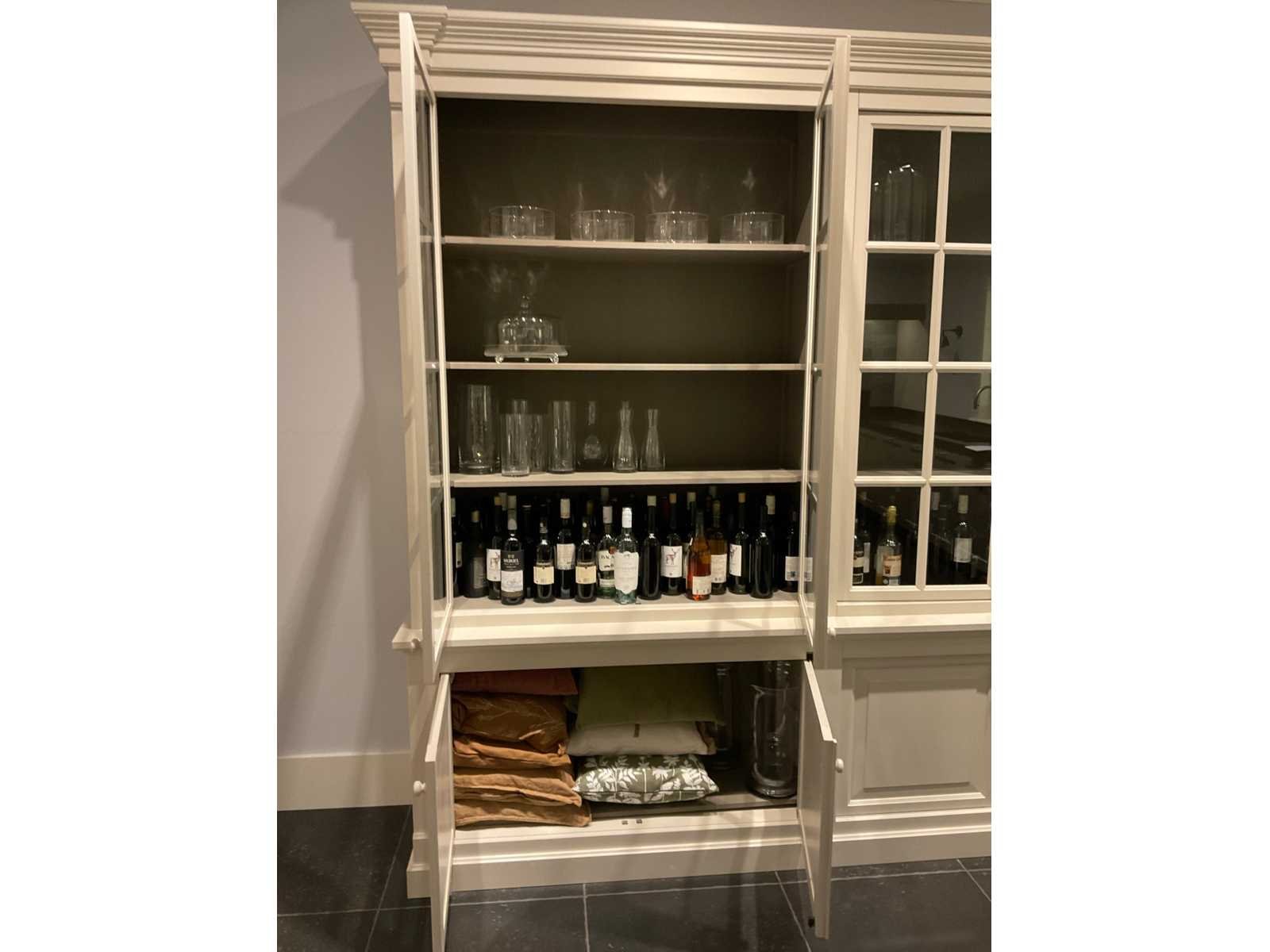 2 dubbele bovendeuren met glas en 3 legplanken; 2 dubbele onderdeuren met legplank; zonder de inhoud; LET OP: door koper zelf ter plaatse nog te demonteren; zonder de getoonde accessoires Nee Merk: MK Lengte: 260cm Breedte: 52cm Hoogte: 252cm Hoofdkleur: zand mat