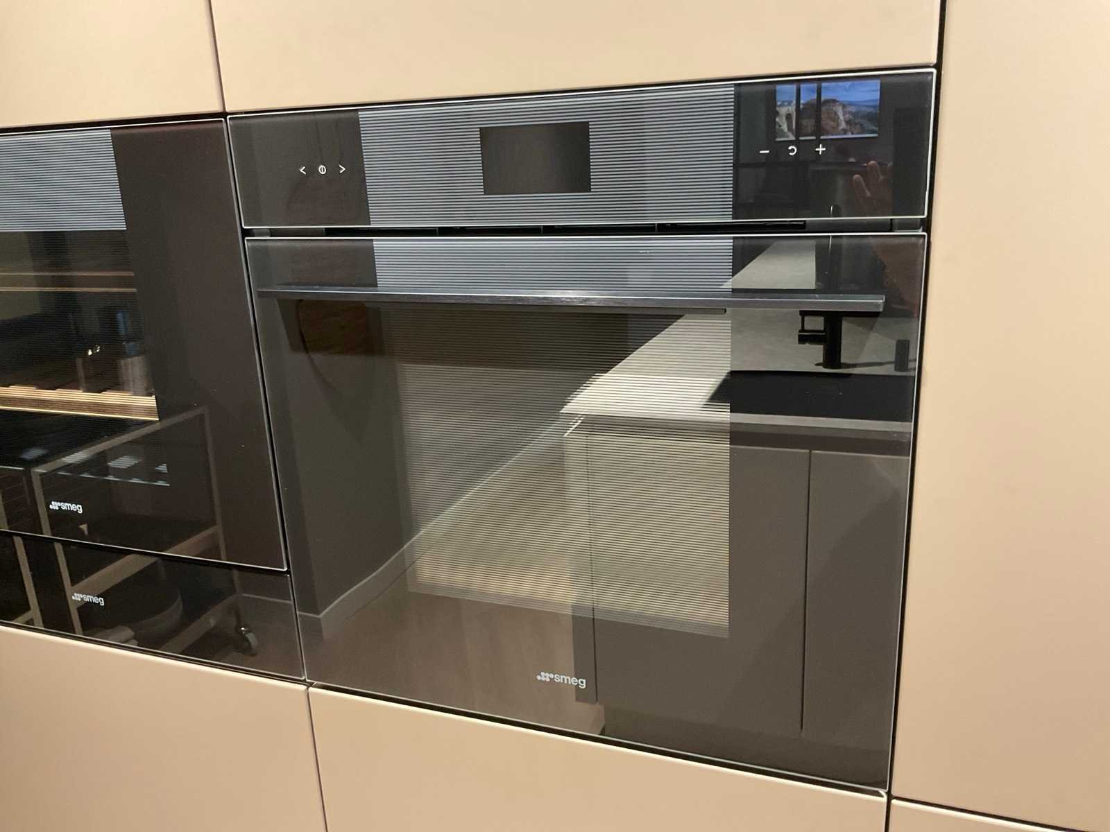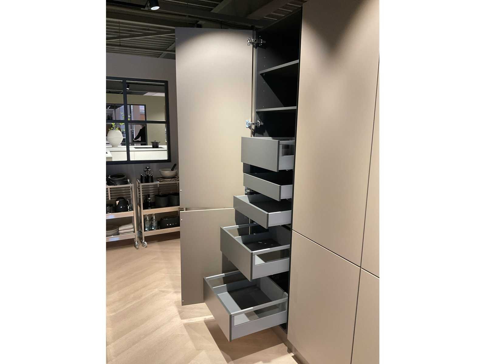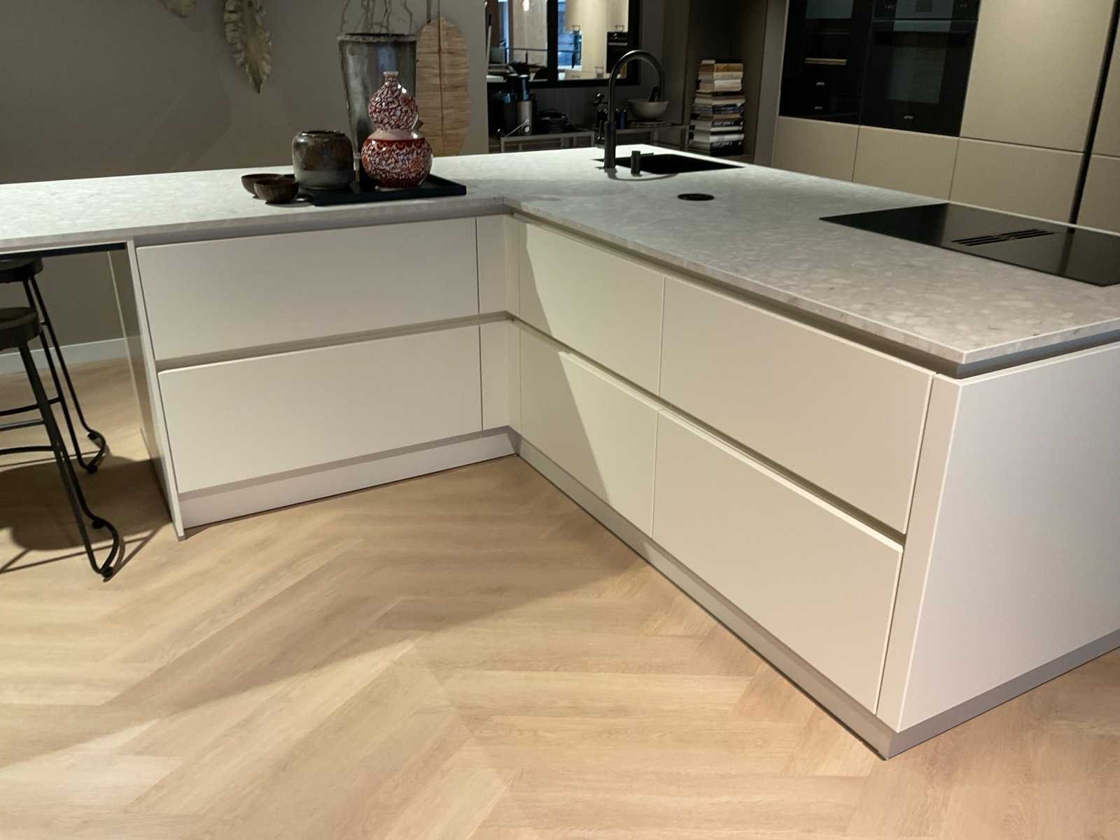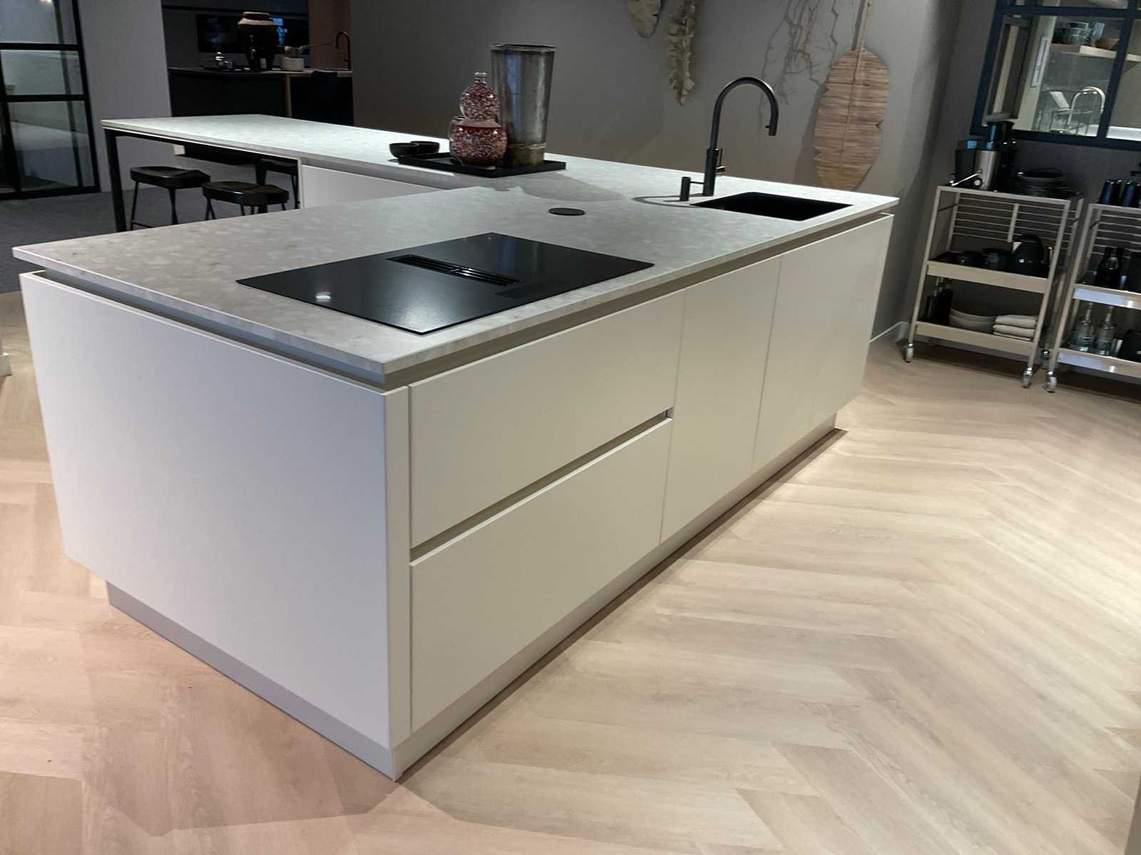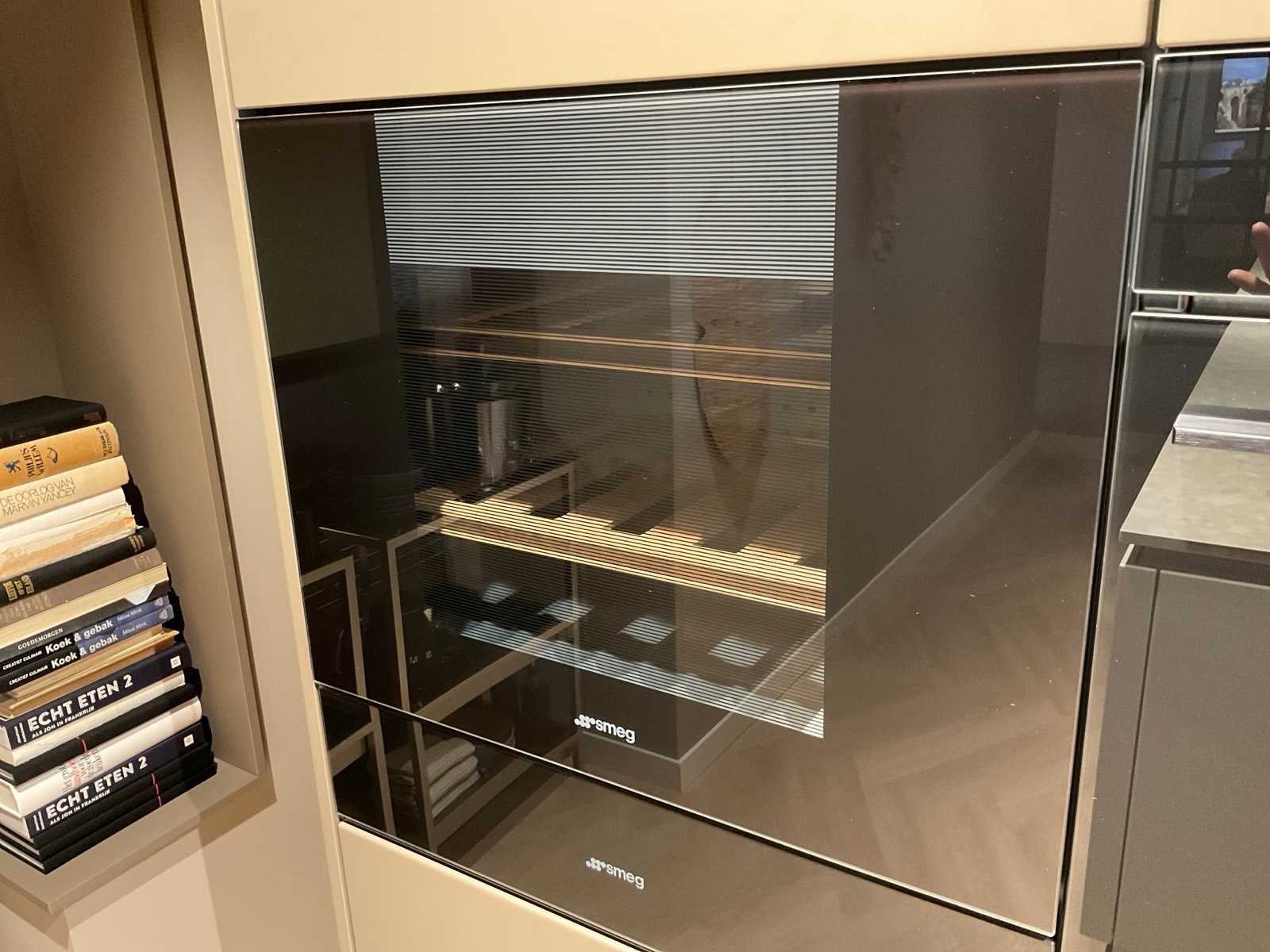 Kook-spoeleiland met tafel; indeling: 1 onderkast; 6 ladenkasten; waarvan 1 met binnenlade; 2 x bestekinzet; 3 open vakken; tafeldeel lengte 150 cm; Smeg 4-zone inbouw inductiekookplaat met geïntegreerde afzuiging; type HOBD382MB2; Bosch inbouw vaatwasser; type SBV4ECX23E; 13 couverts; Twist inbouw stopcontact; indeling kastenwand: 6 hoge kasten; waarvan 1 met 5 binnenladen en 1 met uittrekplateau en 3-voudige wandcontactdoos; Smeg inbouw oven met magnetron; type SO6102M2B3; inhoud 68 liter; Smeg inbouw wijnklimaatkast; type CVI29B3; inhoud 29 flessen; Smeg sommelierslade; type CPS 115B3; Smeg inbouwkoelkast type S8L174DNE; inhoud 310 liter; Smeg inbouwvriezer; type S8F174DNE; inhoud 204 liter; Scan de QR code voor meer informatie; LET OP: door koper zelf ter plaatse nog te demonteren; zonder de getoonde accessoires Nee Merk: Schüller Model: Siena Lengte: 369cm Hoogte: 243cm Kraan: Quooker 3-in-1 kokendwaterkraan met 3 liter reservoir en zeeppompje Gun metal Gootsteen: Lorreine onderbouw rvs gun metal Aanrechtblad: Kermie Just Ceramics Retrostone silk Lengte kookeiland: 378cm Breedte kookeiland: 273cm Hoogte kookeiland: 96cm Hoofdkleur: magnolia-Sepiabruin fluweel mat