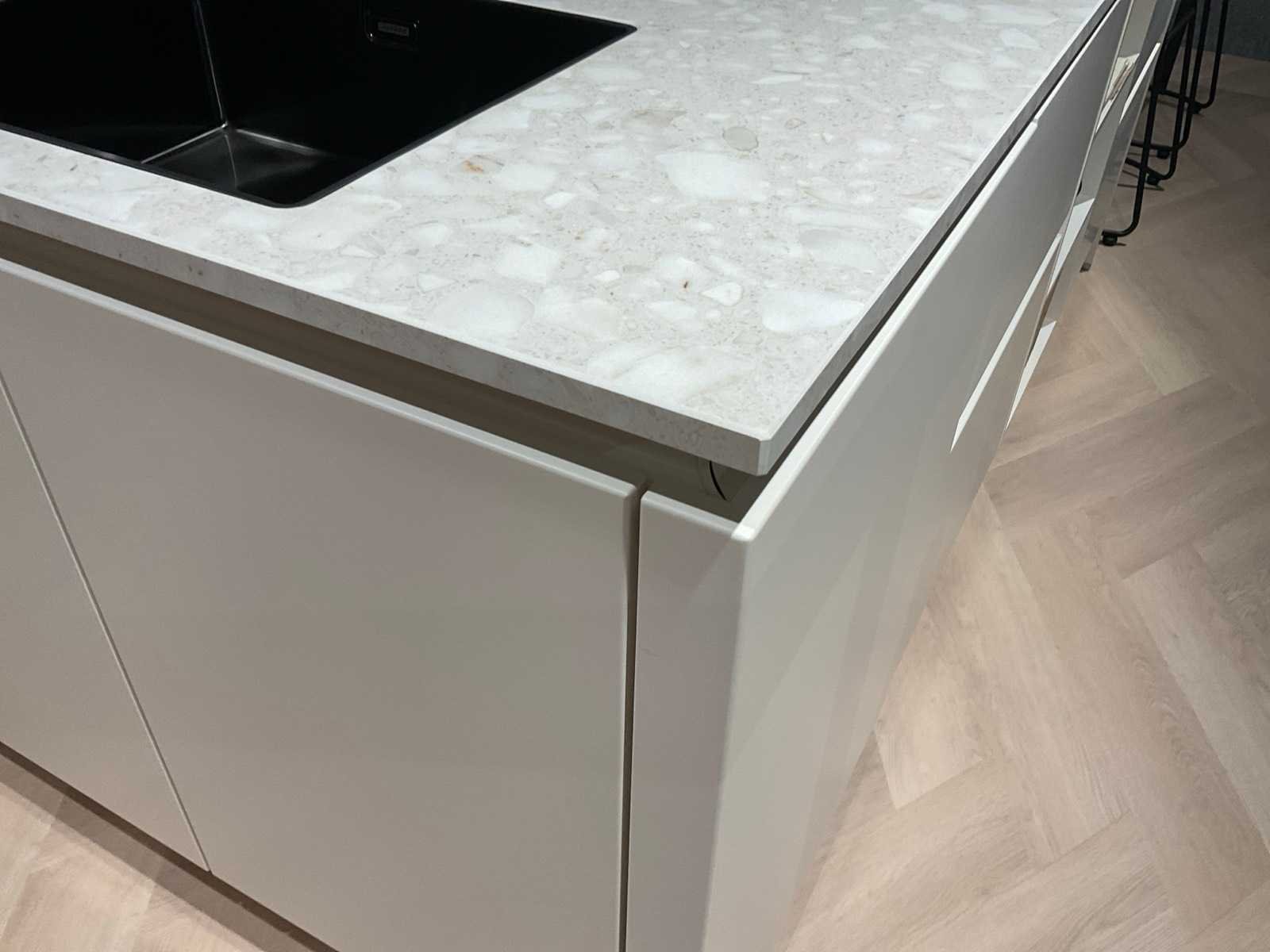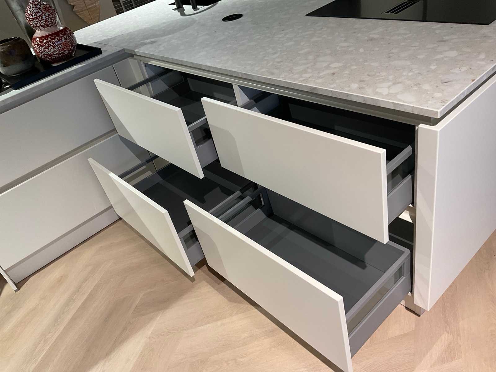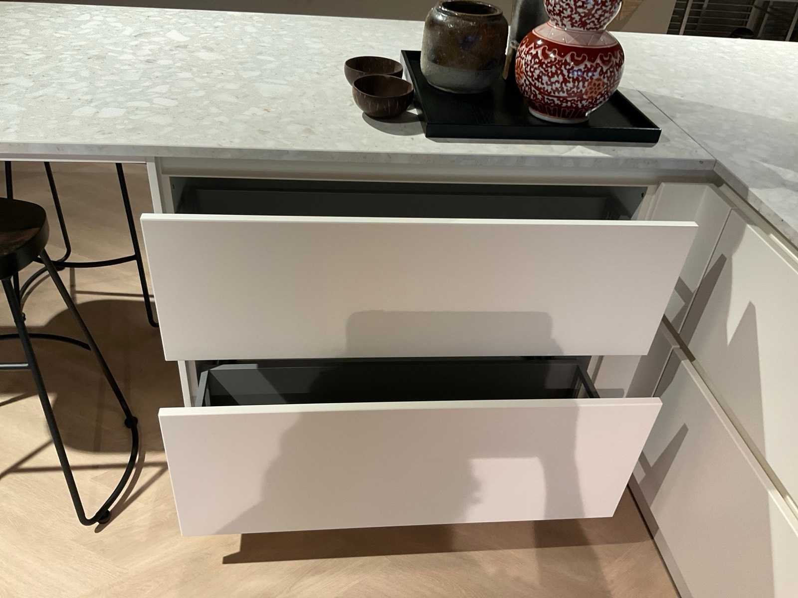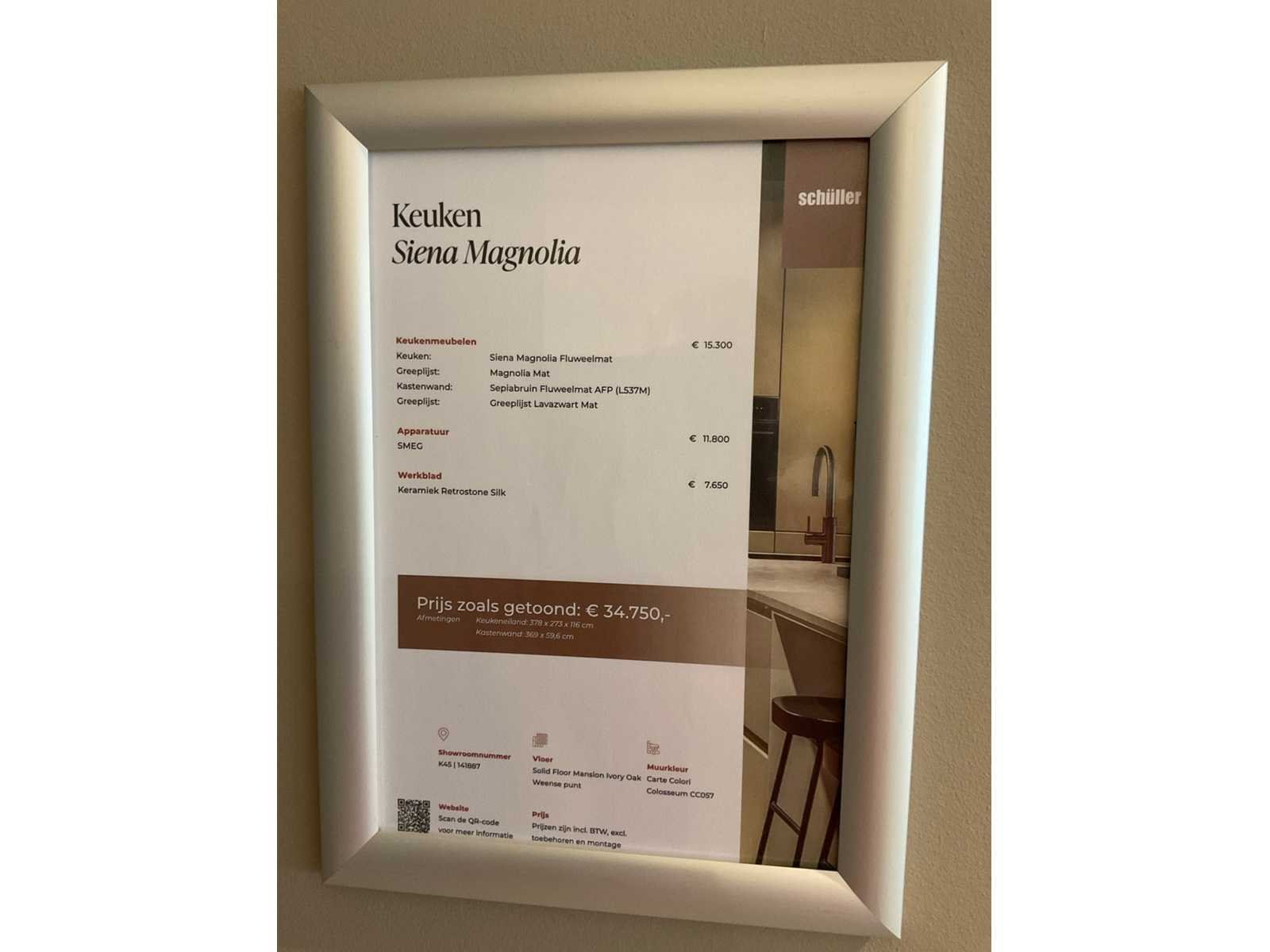 Kook-spoeleiland met tafel; indeling: 1 onderkast; 6 ladenkasten; waarvan 1 met binnenlade; 2 x bestekinzet; 3 open vakken; tafeldeel lengte 150 cm; Smeg 4-zone inbouw inductiekookplaat met geïntegreerde afzuiging; type HOBD382MB2; Bosch inbouw vaatwasser; type SBV4ECX23E; 13 couverts; Twist inbouw stopcontact; indeling kastenwand: 6 hoge kasten; waarvan 1 met 5 binnenladen en 1 met uittrekplateau en 3-voudige wandcontactdoos; Smeg inbouw oven met magnetron; type SO6102M2B3; inhoud 68 liter; Smeg inbouw wijnklimaatkast; type CVI29B3; inhoud 29 flessen; Smeg sommelierslade; type CPS 115B3; Smeg inbouwkoelkast type S8L174DNE; inhoud 310 liter; Smeg inbouwvriezer; type S8F174DNE; inhoud 204 liter; Scan de QR code voor meer informatie; LET OP: door koper zelf ter plaatse nog te demonteren; zonder de getoonde accessoires Nee Merk: Schüller Model: Siena Lengte: 369cm Hoogte: 243cm Kraan: Quooker 3-in-1 kokendwaterkraan met 3 liter reservoir en zeeppompje Gun metal Gootsteen: Lorreine onderbouw rvs gun metal Aanrechtblad: Kermie Just Ceramics Retrostone silk Lengte kookeiland: 378cm Breedte kookeiland: 273cm Hoogte kookeiland: 96cm Hoofdkleur: magnolia-Sepiabruin fluweel mat