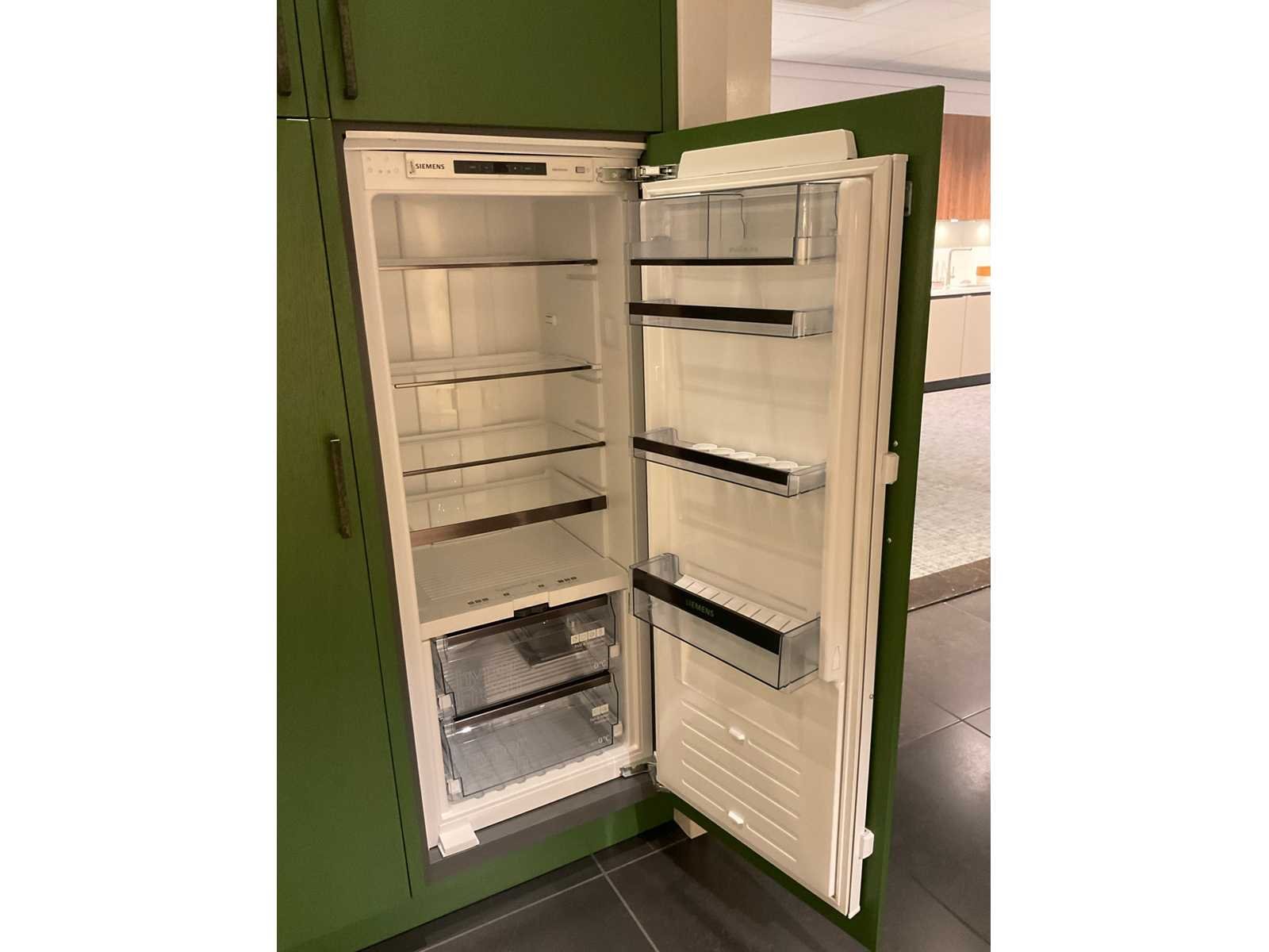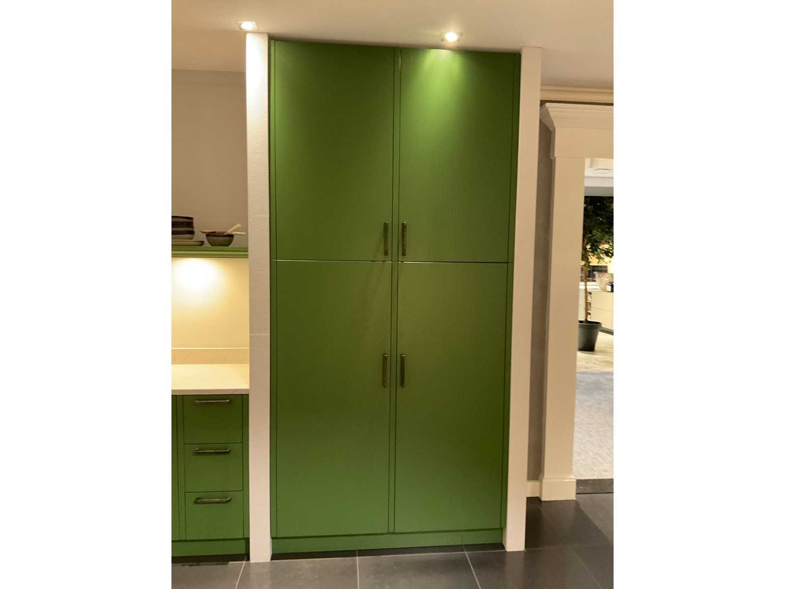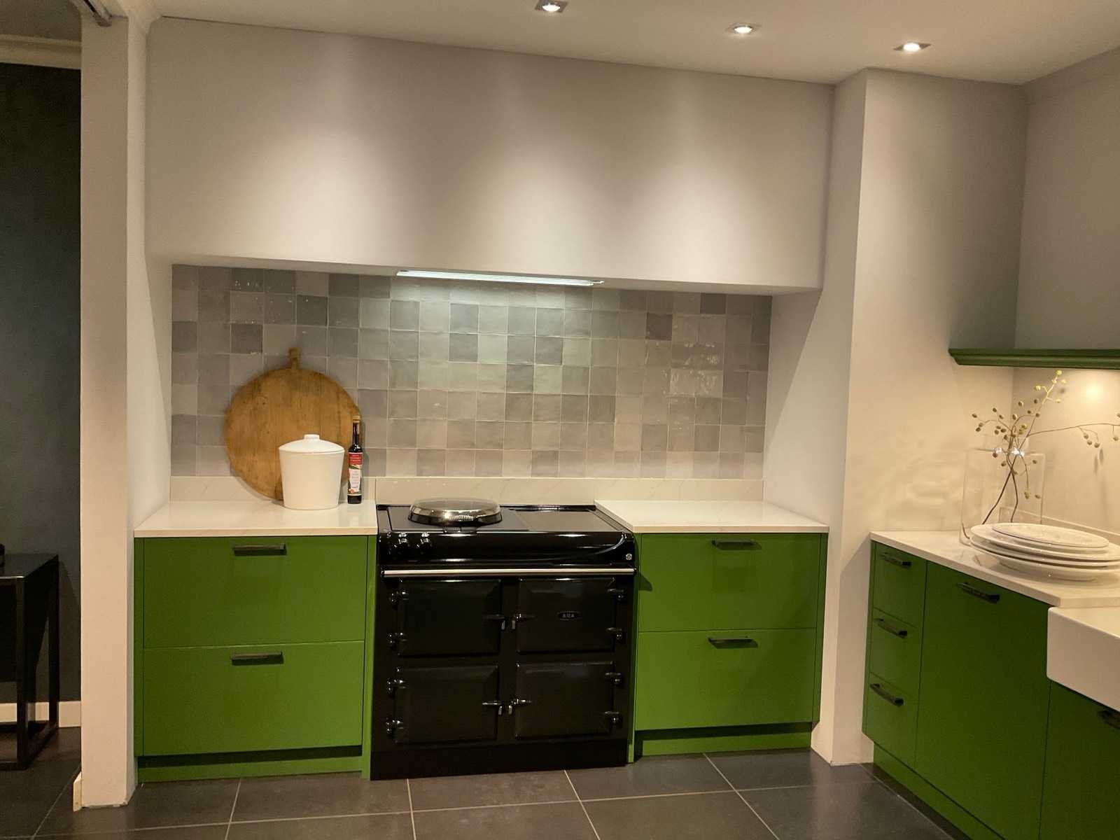 Wandopstelling 1 indeling: 2 ladenkasten met binnenlade: AGA 4-zone inductie fornuis; type 100-4/4i; met bak-braad en sudder ovens en grillplaat; 98 cm breed; Novy inbouw plafond afzuigunit; type 898; zonder de ombouw; wandopstelling 2 indeling: 2 onderkasten en 2 ladenkasten; Siemens inbouw vaatwasser; type SX63H800BE; 14 couverts; wandplank met kroonlijst en verlichting; afm. 260x30 cm; kastenwand indeling: 2 hoge kasten; 270 cm hoog; Siemens inbouw koelkast; type KI51FSD40; inhoud 222 liter; Siemens inbouw vriezer; type GI41NACE0; inhoud 130 liter met 5 laden; Scan de QR code voor meer informatie; LET OP: door koper zelf ter plaatse nog te demonteren; zonder de getoonde accessoires Nee Merk: MK Model: Regina Lengte: 259cm Breedte: 263cm Hoogte: 271cm Kraan: Eeengreeps rvs mengkraan met afneembare kop Gootsteen: Villeroy &Boch onderbouwspoelbak keramiek Werkblad hoogte: 94cm Aanrechtblad: Kemie Just Luxury kleur Planet Venis met wandplint 10 cm Hoofdkleur: Sikkens J3.40.31 grasgroen
