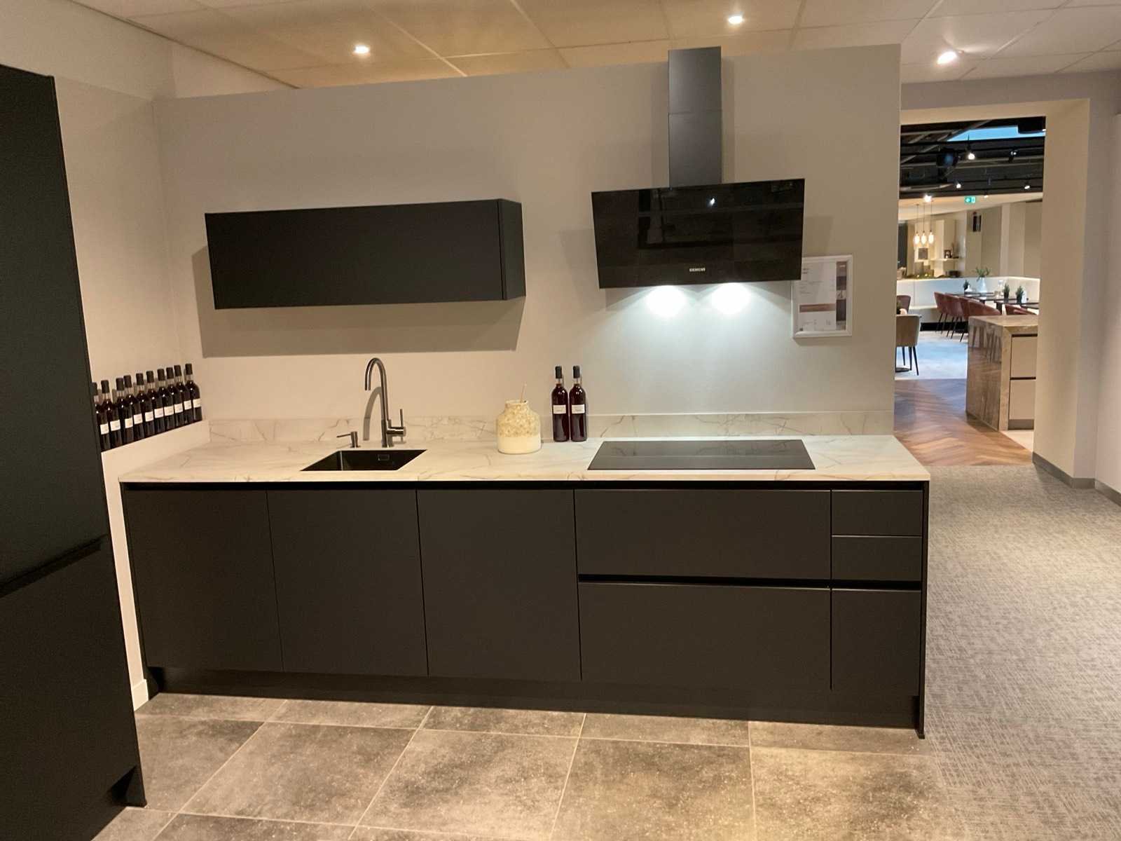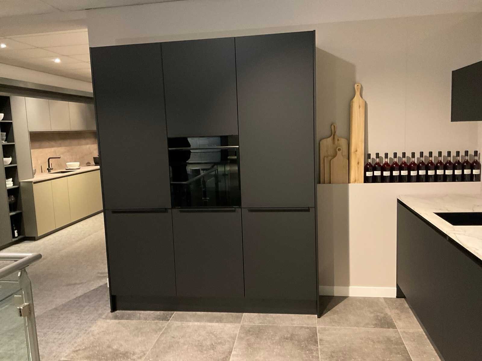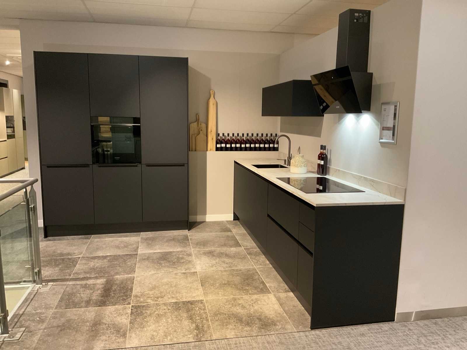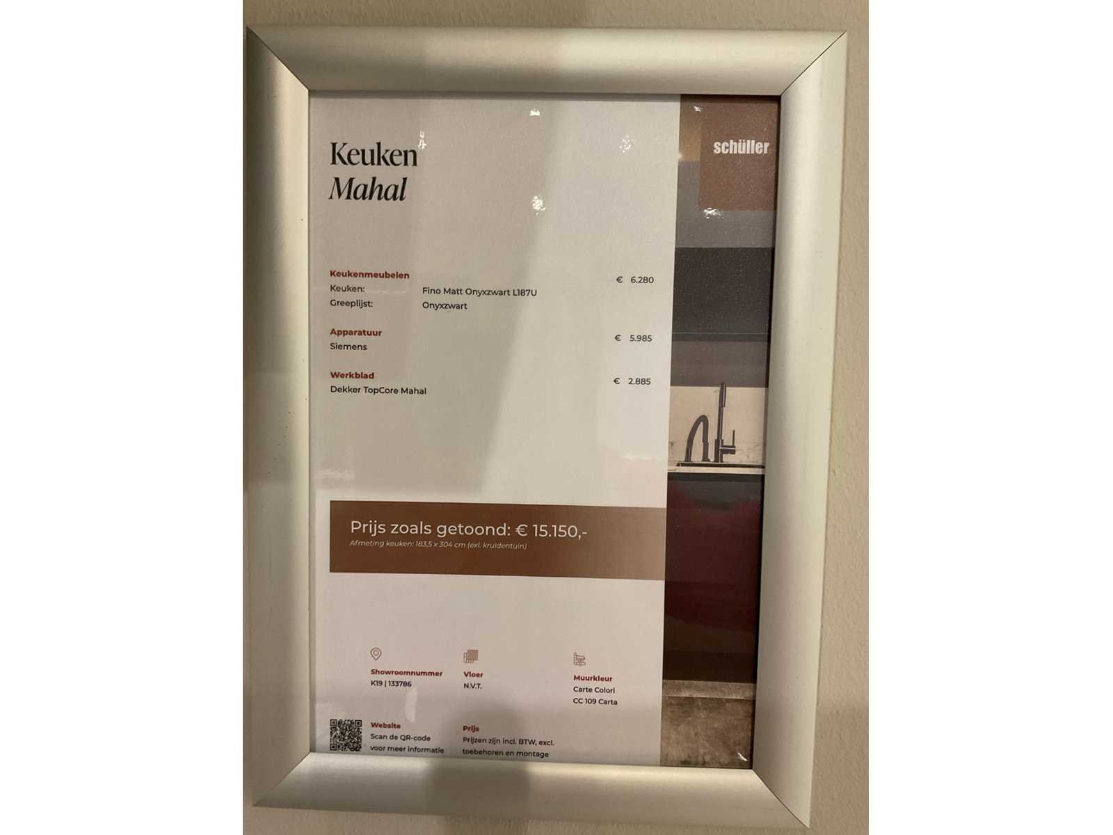 Wandopstelling indeling: 1 onderkast; 2 ladenkasten waarvan 1 met binnenlade en 1 met afvalscheidingssysteem; 1 bovenkast met klepdeur; Siemens 4-zone inbouw inductie kookplaat; type EH877HEC1E; Siemens wandafzuigkap; type LC85KDK60; Siemens inbouw vaatwasser; type SX63EX02AE; 13 couverts; indeling kastenwand afm. 18xx59x230 cm; 3 hoge kasten; Siemens inbouw oven; type HB934GAB1; inhoud 71 liter; Siemens inbouw koelvriescombinatie; type KI86V5SEO; inhoud 183/84 liter; Scan de QR code voor meer informatie; LET OP: door koper zelf ter plaatse nog te demonteren; zonder de getoonde accessoires Nee Merk: Schüller Model: Mahal Lengte: 30cm Kraan: Lanesto eengreeps Gun Metall en zeeppompje Gootsteen: Lanesto onderbouw gun metal Werkblad hoogte: 96cm Aanrechtblad: Dekker Topcore met hardkunststof toplaag kleur Mahal Hoofdkleur: Onyxzwart