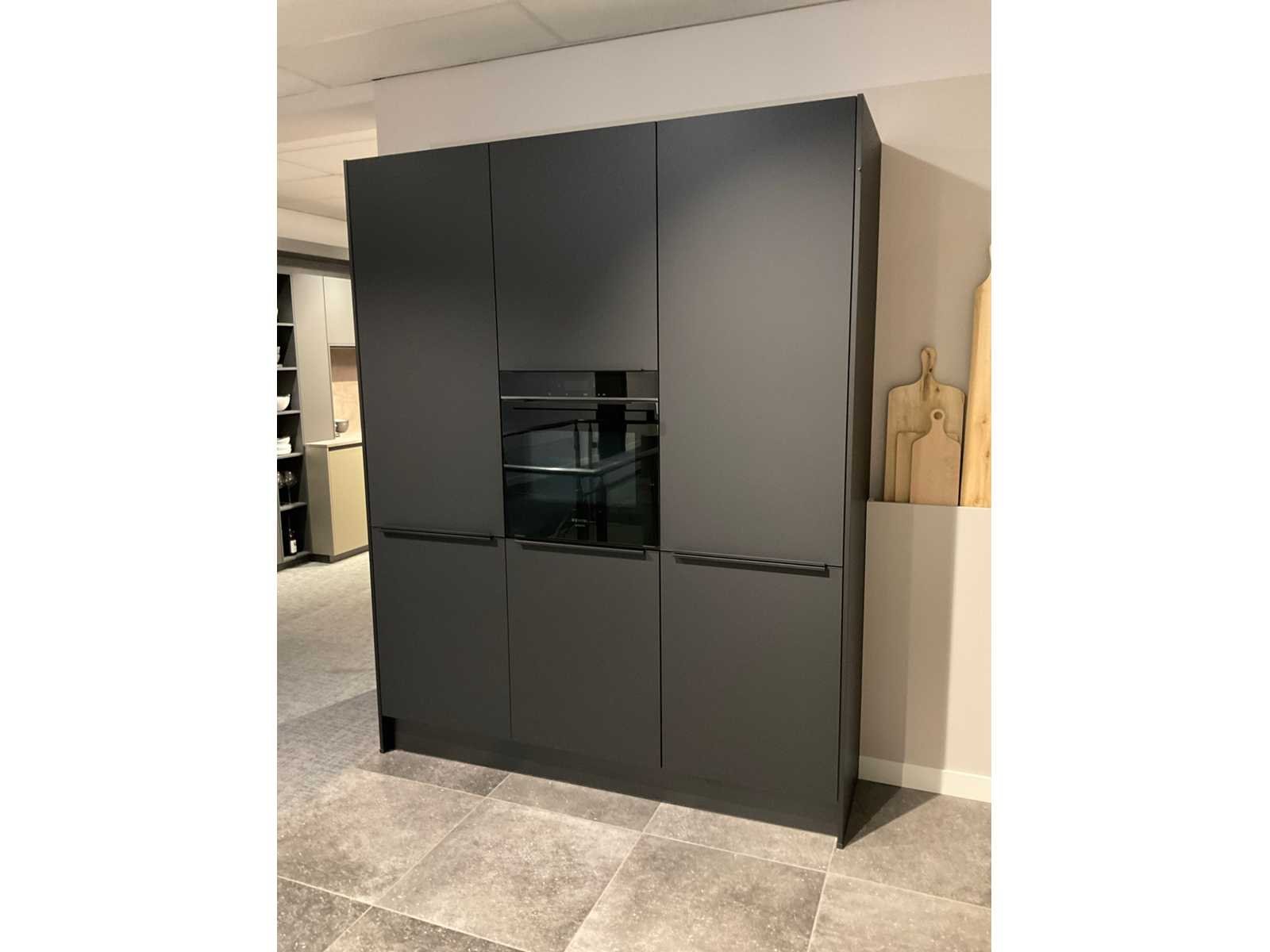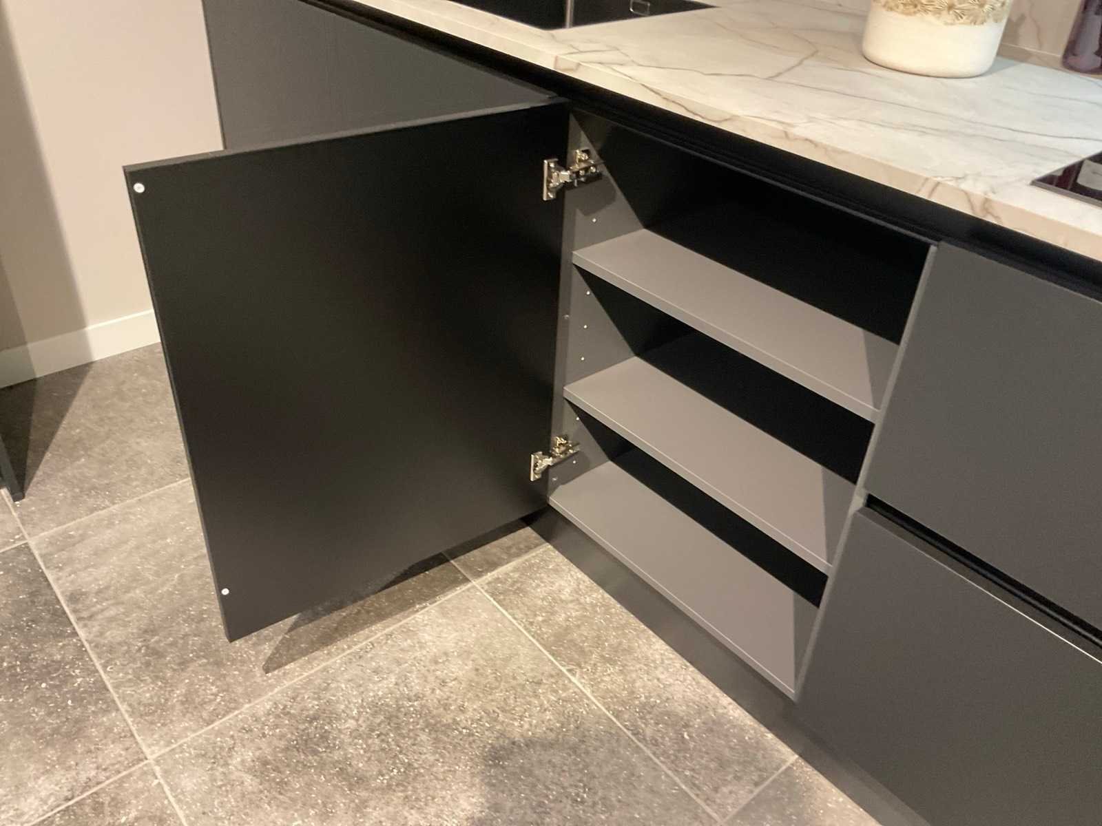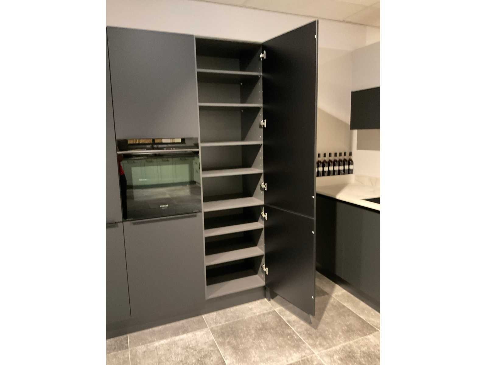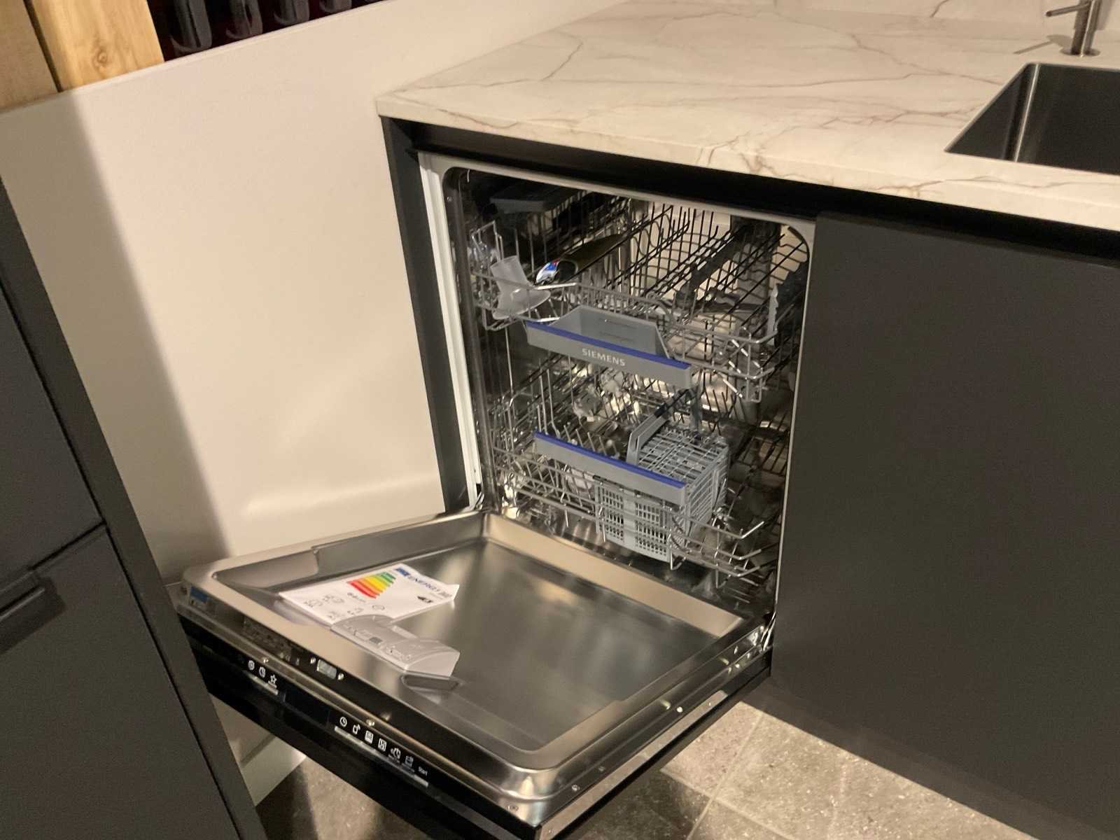 Wandopstelling indeling: 1 onderkast; 2 ladenkasten waarvan 1 met binnenlade en 1 met afvalscheidingssysteem; 1 bovenkast met klepdeur; Siemens 4-zone inbouw inductie kookplaat; type EH877HEC1E; Siemens wandafzuigkap; type LC85KDK60; Siemens inbouw vaatwasser; type SX63EX02AE; 13 couverts; indeling kastenwand afm. 18xx59x230 cm; 3 hoge kasten; Siemens inbouw oven; type HB934GAB1; inhoud 71 liter; Siemens inbouw koelvriescombinatie; type KI86V5SEO; inhoud 183/84 liter; Scan de QR code voor meer informatie; LET OP: door koper zelf ter plaatse nog te demonteren; zonder de getoonde accessoires Nee Merk: Schüller Model: Mahal Lengte: 30cm Kraan: Lanesto eengreeps Gun Metall en zeeppompje Gootsteen: Lanesto onderbouw gun metal Werkblad hoogte: 96cm Aanrechtblad: Dekker Topcore met hardkunststof toplaag kleur Mahal Hoofdkleur: Onyxzwart