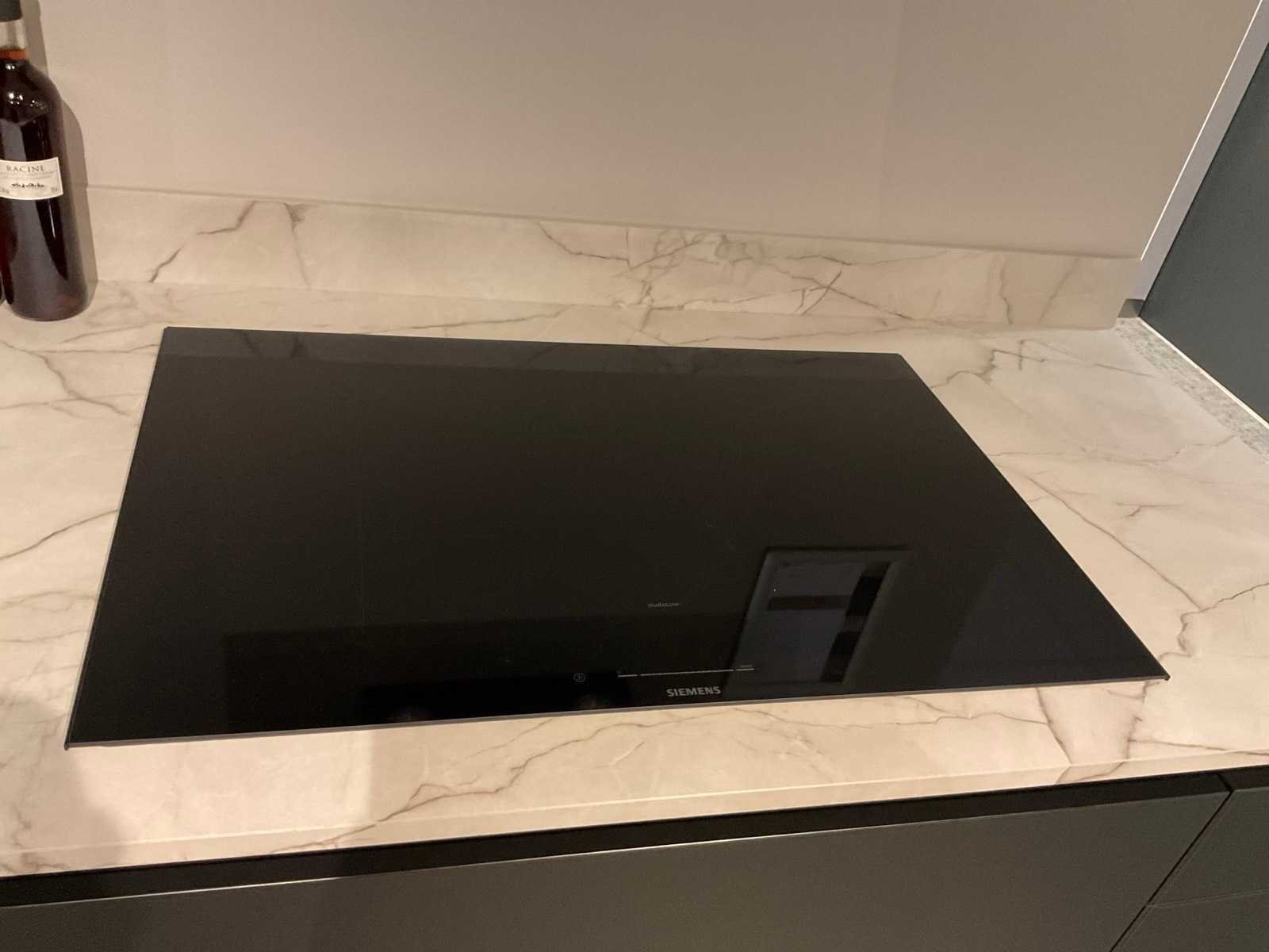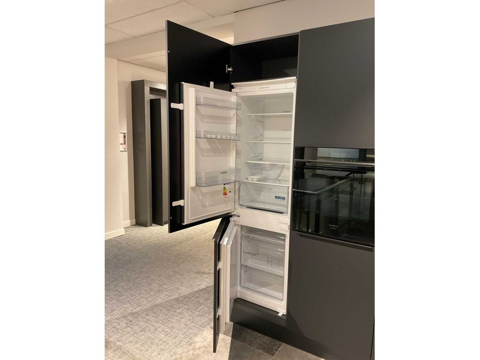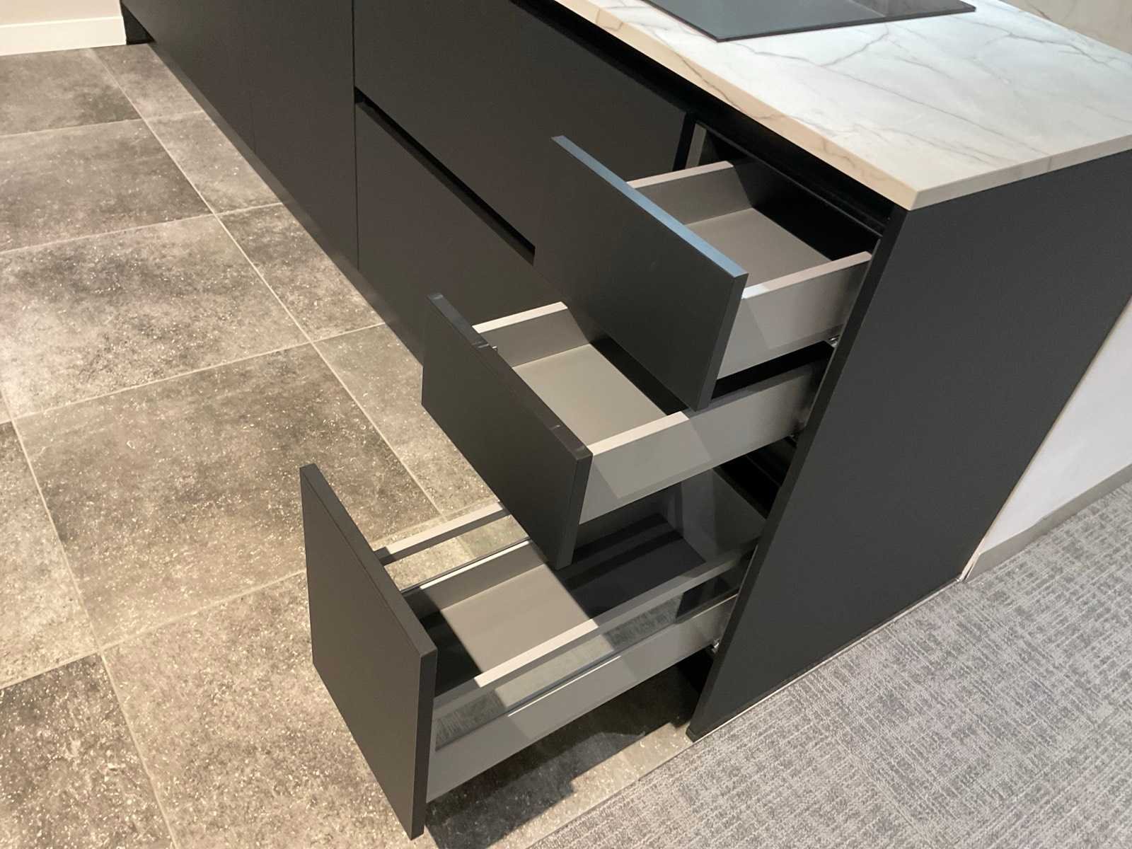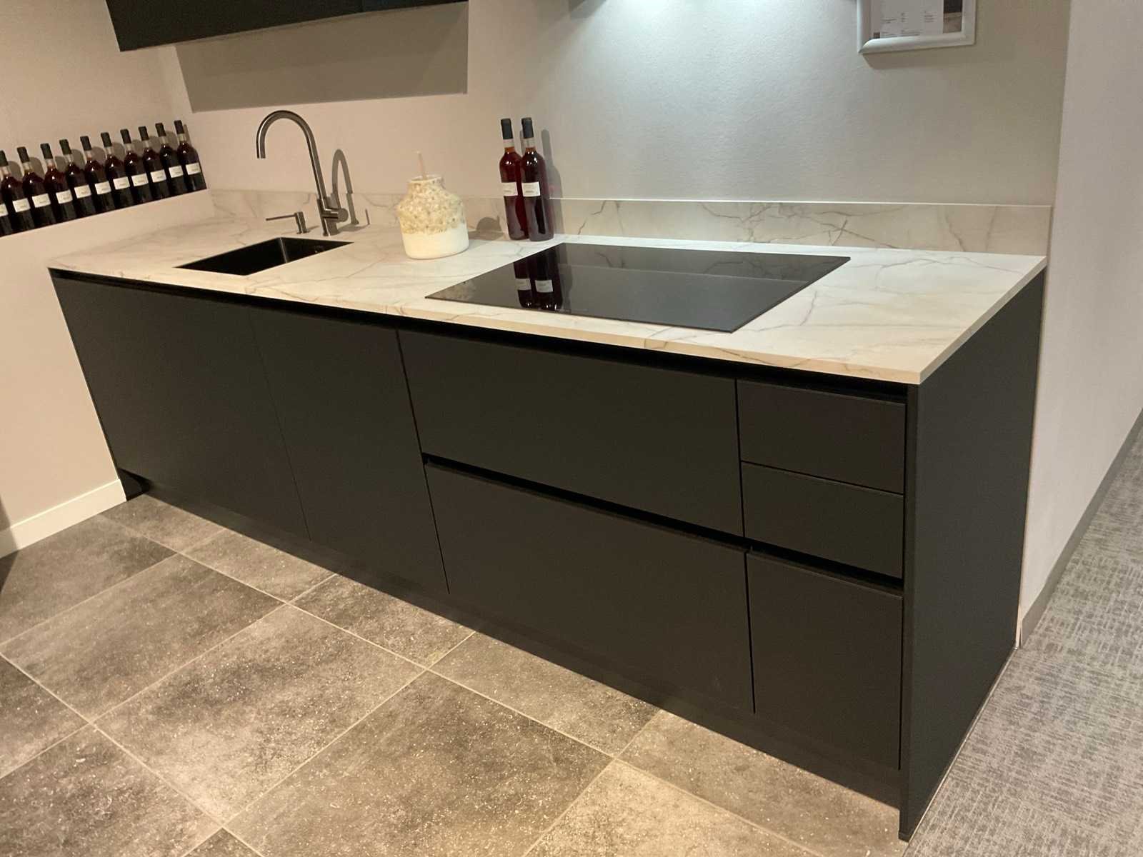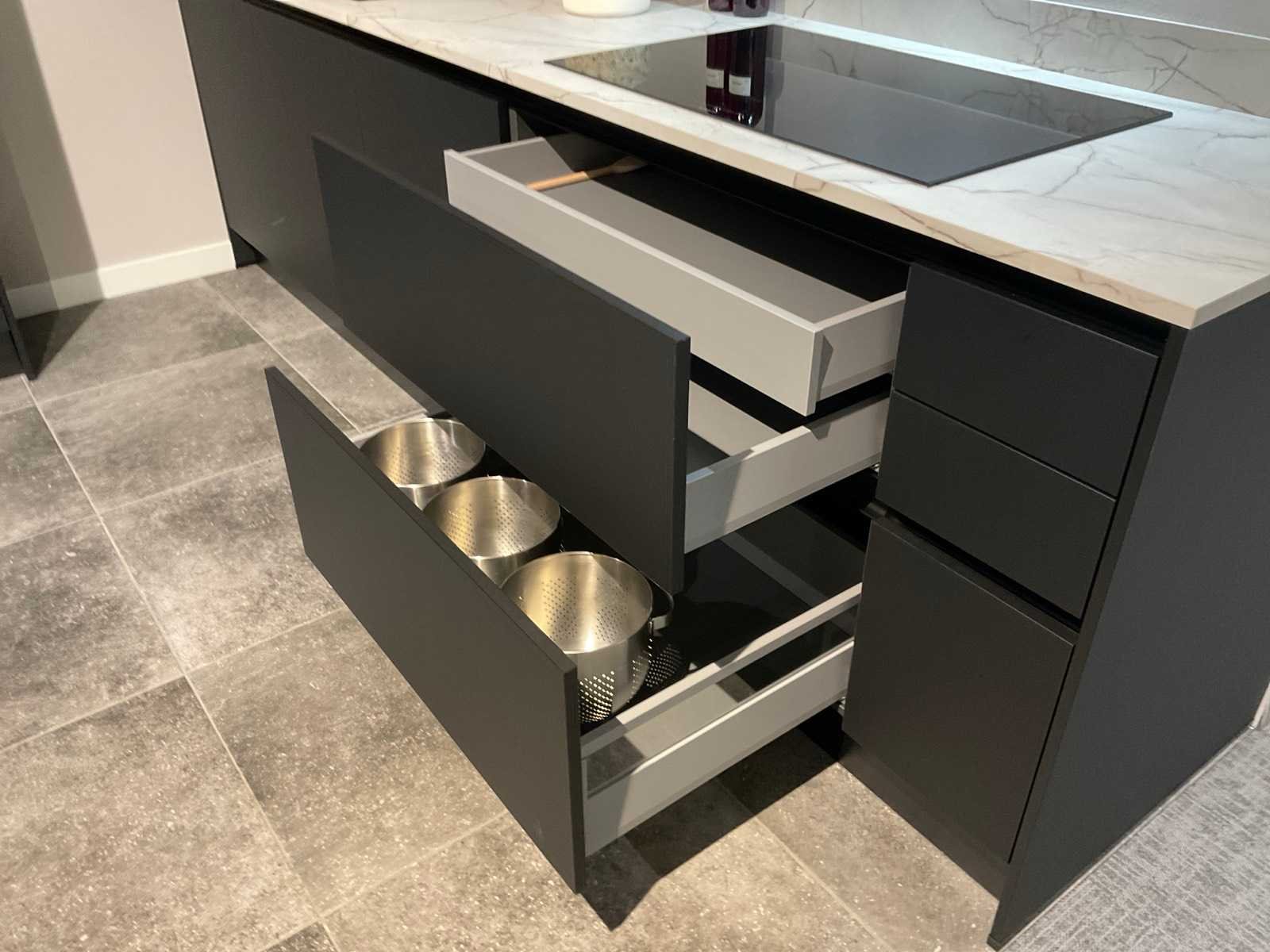 Wandopstelling indeling: 1 onderkast; 2 ladenkasten waarvan 1 met binnenlade en 1 met afvalscheidingssysteem; 1 bovenkast met klepdeur; Siemens 4-zone inbouw inductie kookplaat; type EH877HEC1E; Siemens wandafzuigkap; type LC85KDK60; Siemens inbouw vaatwasser; type SX63EX02AE; 13 couverts; indeling kastenwand afm. 18xx59x230 cm; 3 hoge kasten; Siemens inbouw oven; type HB934GAB1; inhoud 71 liter; Siemens inbouw koelvriescombinatie; type KI86V5SEO; inhoud 183/84 liter; Scan de QR code voor meer informatie; LET OP: door koper zelf ter plaatse nog te demonteren; zonder de getoonde accessoires Nee Merk: Schüller Model: Mahal Lengte: 30cm Kraan: Lanesto eengreeps Gun Metall en zeeppompje Gootsteen: Lanesto onderbouw gun metal Werkblad hoogte: 96cm Aanrechtblad: Dekker Topcore met hardkunststof toplaag kleur Mahal Hoofdkleur: Onyxzwart