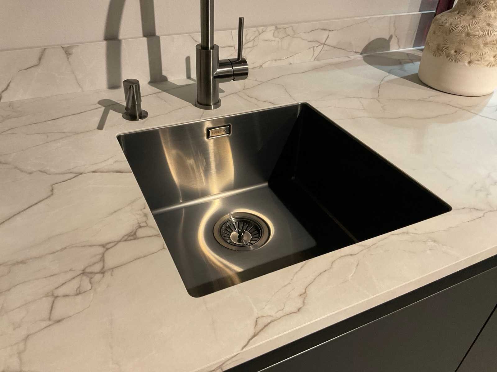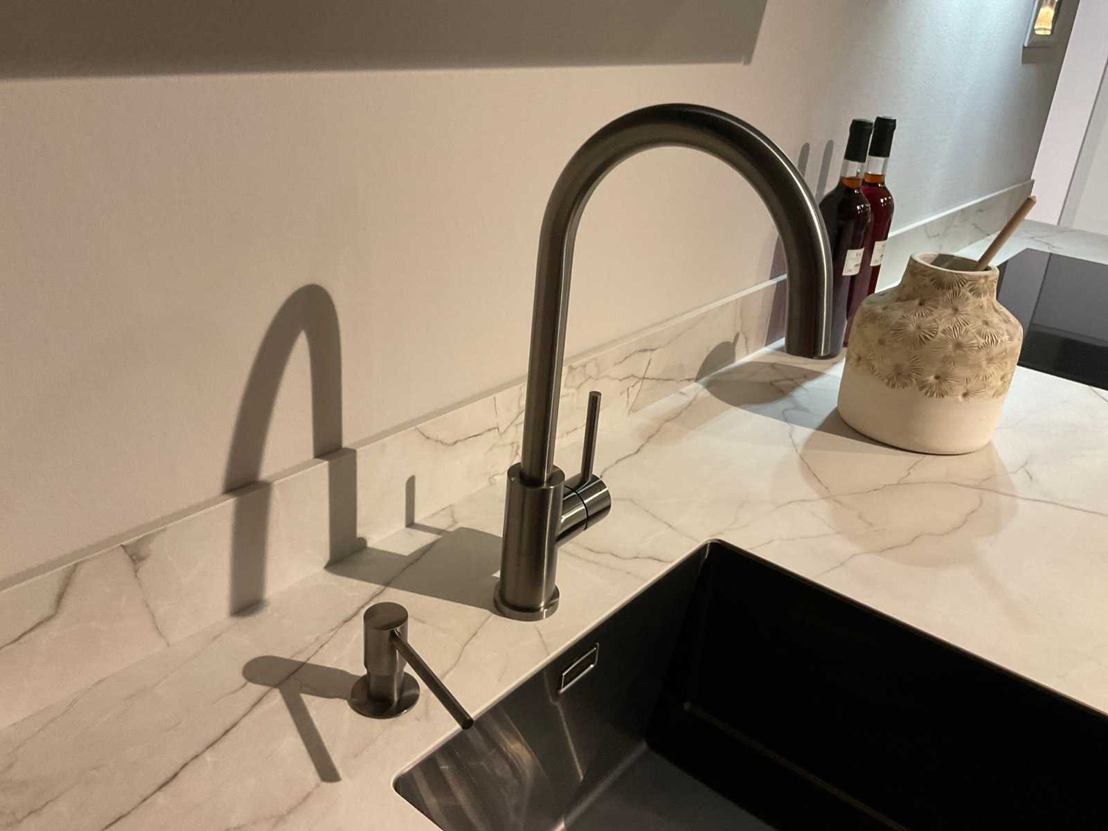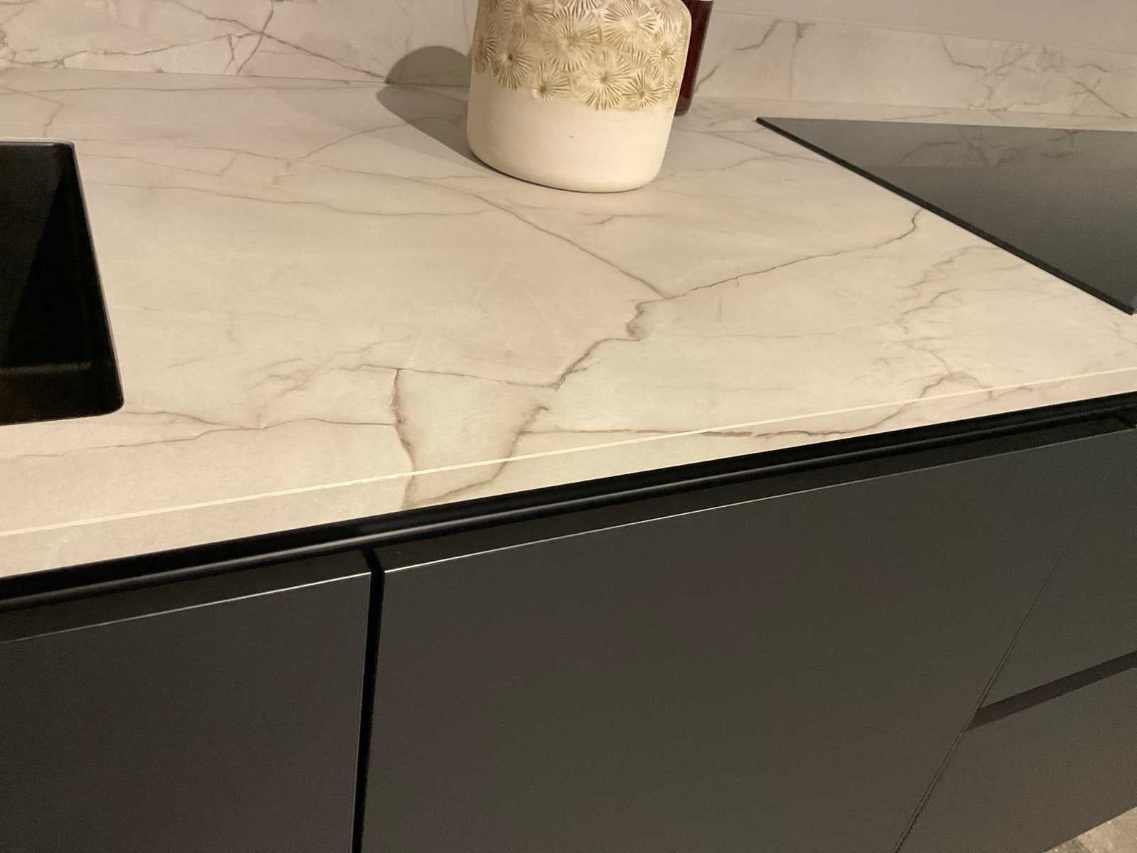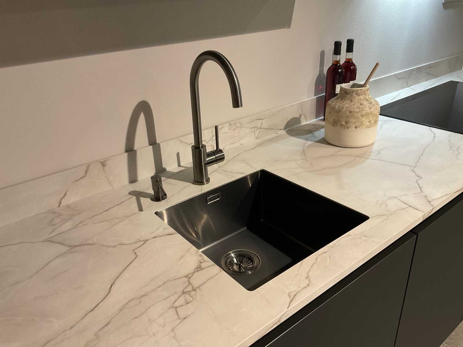 Wandopstelling indeling: 1 onderkast; 2 ladenkasten waarvan 1 met binnenlade en 1 met afvalscheidingssysteem; 1 bovenkast met klepdeur; Siemens 4-zone inbouw inductie kookplaat; type EH877HEC1E; Siemens wandafzuigkap; type LC85KDK60; Siemens inbouw vaatwasser; type SX63EX02AE; 13 couverts; indeling kastenwand afm. 18xx59x230 cm; 3 hoge kasten; Siemens inbouw oven; type HB934GAB1; inhoud 71 liter; Siemens inbouw koelvriescombinatie; type KI86V5SEO; inhoud 183/84 liter; Scan de QR code voor meer informatie; LET OP: door koper zelf ter plaatse nog te demonteren; zonder de getoonde accessoires Nee Merk: Schüller Model: Mahal Lengte: 30cm Kraan: Lanesto eengreeps Gun Metall en zeeppompje Gootsteen: Lanesto onderbouw gun metal Werkblad hoogte: 96cm Aanrechtblad: Dekker Topcore met hardkunststof toplaag kleur Mahal Hoofdkleur: Onyxzwart