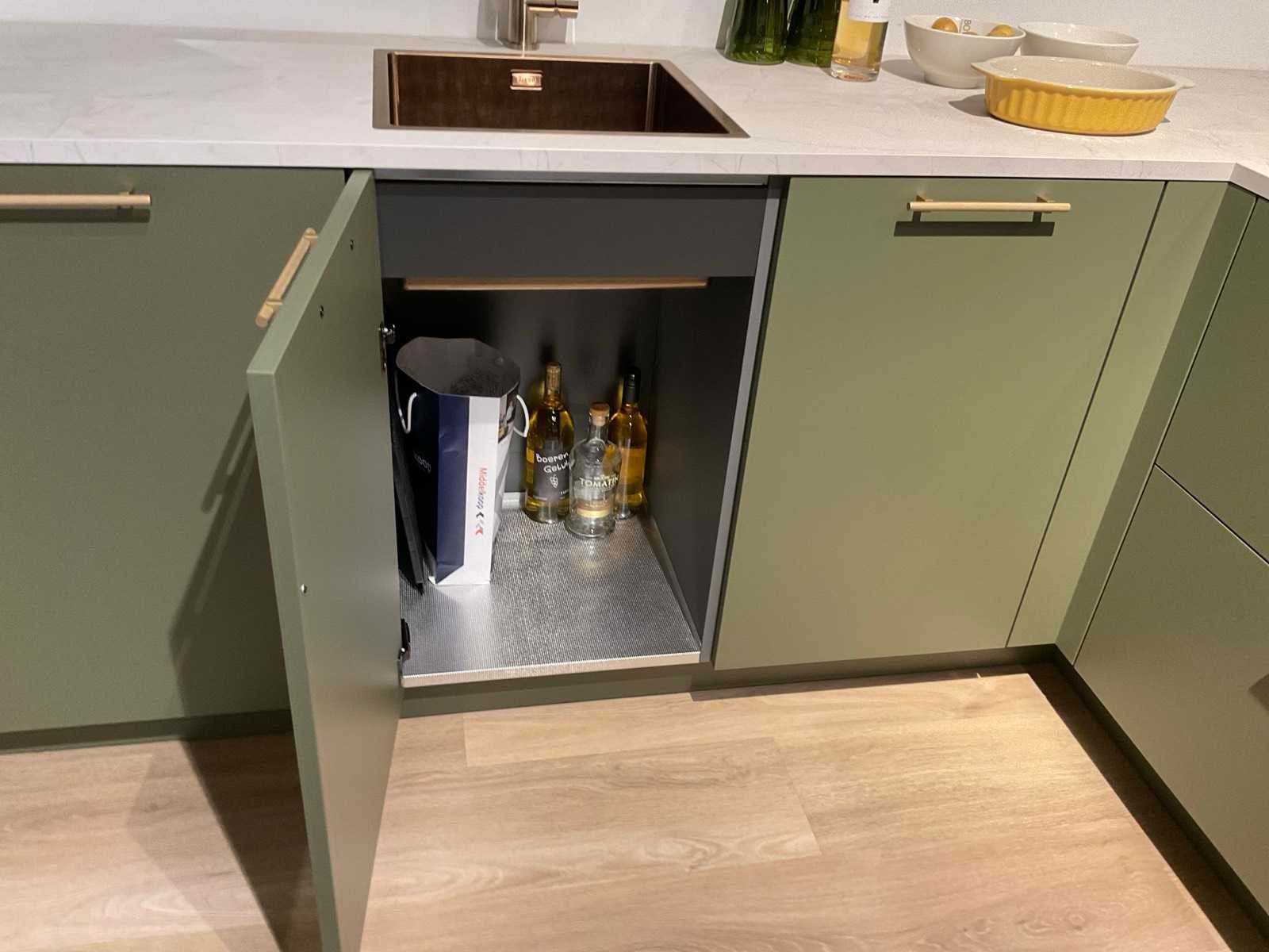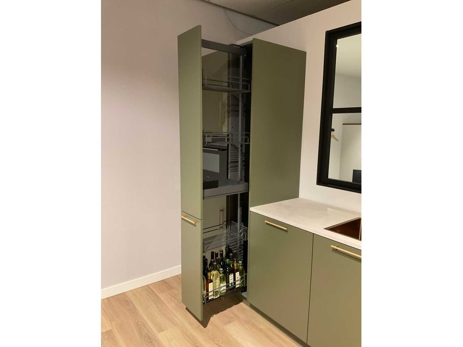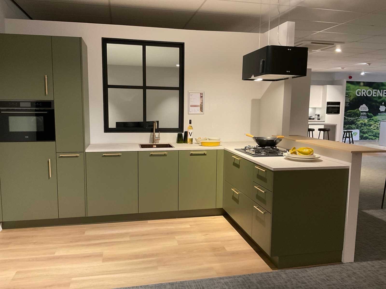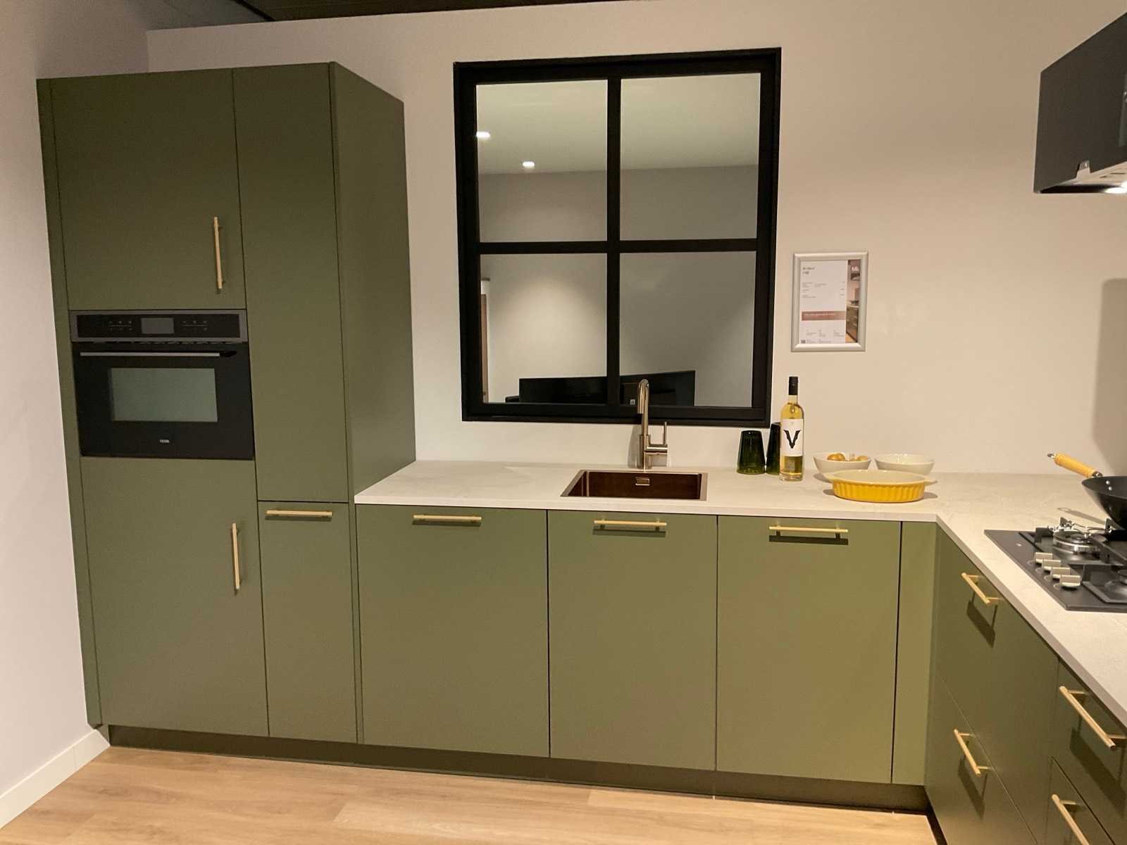 Indeling: 1 onderkast; 1 hoekkast met 2 uitzwenkplateaus; 2 ladenkasten; 2 hoge kasten waarvan 1 apothekerskast; barblad; Etna 4-pits inbouw gaskookplaat; type KG959ZTA; met wokbrander; Etna vrijhangende afzuigkap; type RA370ZWA; recirculatie; Etna inbouw combi-magnetron; type CM644T1; inhoud 44 liter; Etna inbouw koelkast; type KKD4088; inhoud 134 liter; Etna inbouw vaatwasser; type VW149M; 12 couverts; zonder het kozijn; scan de QR code voor meer informatie; LET OP: door koper zelf ter plaatse nog te demonteren; zonder de getoonde accessoires; zonder het raamkozijn Nee Merk: MK Model: Olijf Lengte: 340cm Breedte: 200cm Hoogte: 222cm Kraan: Lanesto eengreeps Patinated Brass Gootsteen: Lanesto vlakinbouw Patinated Brass Werkblad hoogte: 93cm Aanrechtblad: Dekker Greengridz Athena DE2395 Hoofdkleur: Olijfgroen