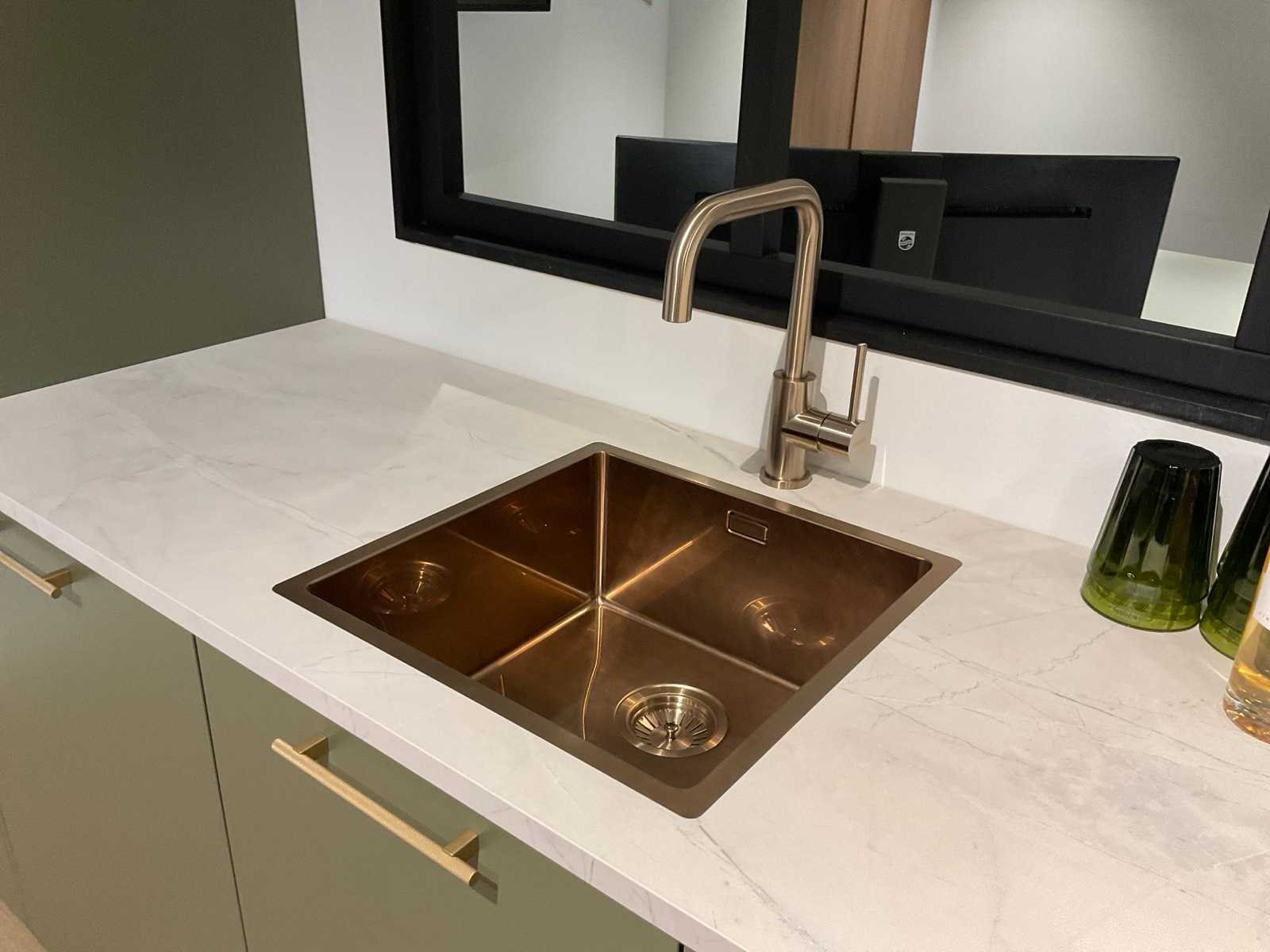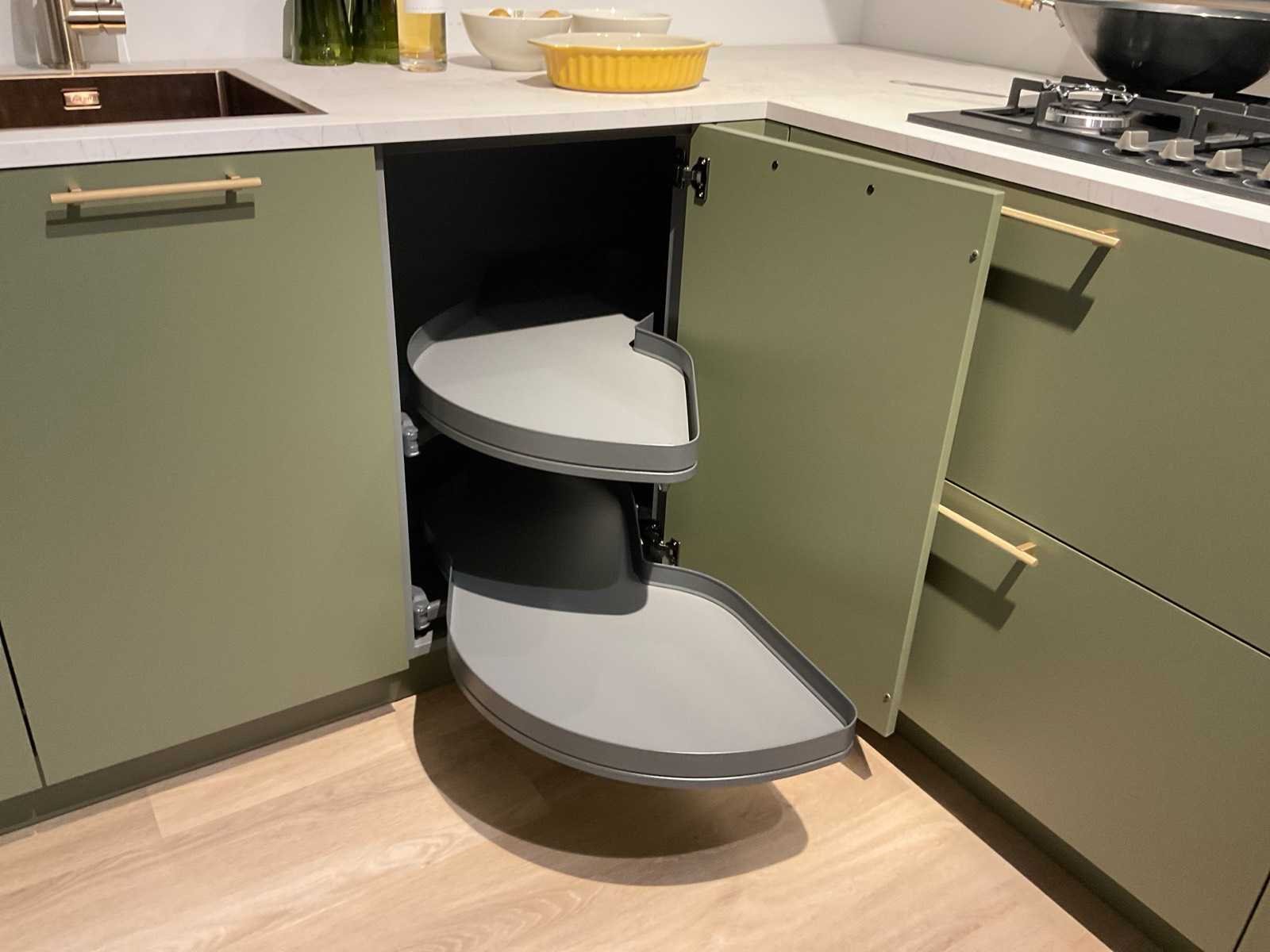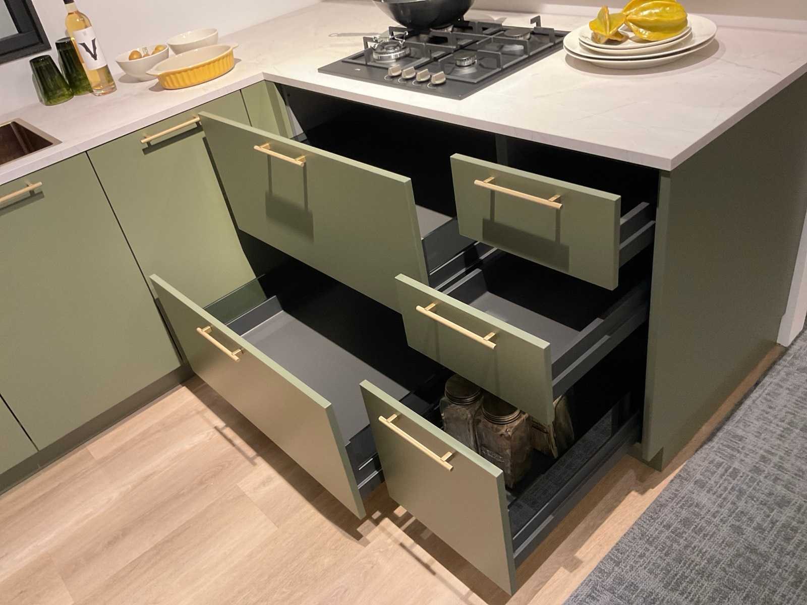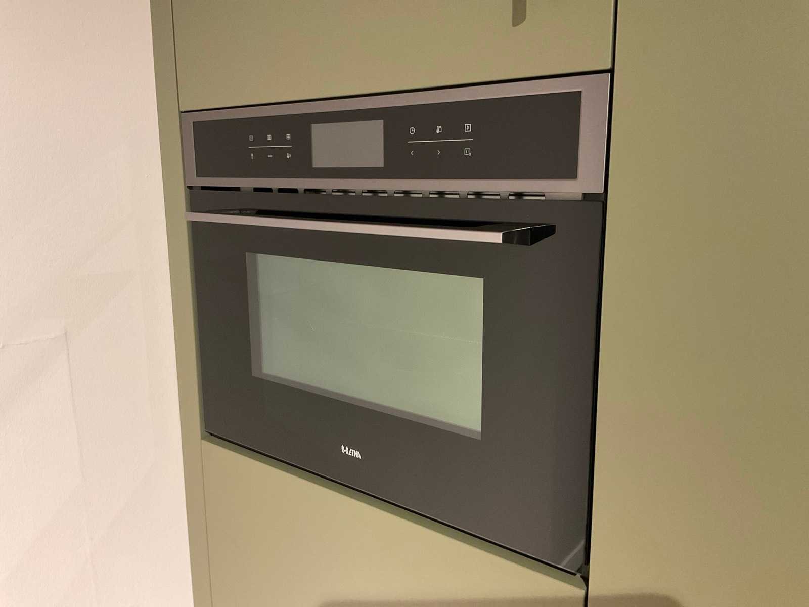 Indeling: 1 onderkast; 1 hoekkast met 2 uitzwenkplateaus; 2 ladenkasten; 2 hoge kasten waarvan 1 apothekerskast; barblad; Etna 4-pits inbouw gaskookplaat; type KG959ZTA; met wokbrander; Etna vrijhangende afzuigkap; type RA370ZWA; recirculatie; Etna inbouw combi-magnetron; type CM644T1; inhoud 44 liter; Etna inbouw koelkast; type KKD4088; inhoud 134 liter; Etna inbouw vaatwasser; type VW149M; 12 couverts; zonder het kozijn; scan de QR code voor meer informatie; LET OP: door koper zelf ter plaatse nog te demonteren; zonder de getoonde accessoires; zonder het raamkozijn Nee Merk: MK Model: Olijf Lengte: 340cm Breedte: 200cm Hoogte: 222cm Kraan: Lanesto eengreeps Patinated Brass Gootsteen: Lanesto vlakinbouw Patinated Brass Werkblad hoogte: 93cm Aanrechtblad: Dekker Greengridz Athena DE2395 Hoofdkleur: Olijfgroen
